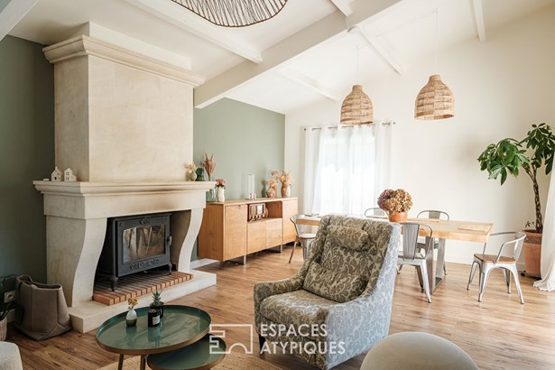 Located in the charming village of Magne, just a few minutes from Niort, this large family home offers an exceptional living environment in the heart of the Marais Poitevin. Entirely renovated with high-end materials, it elegantly combines old-world charm and modern comfort. From the spacious entrance, a generously proportioned living room opens up, bathed in natural light, where the charm of the exposed beams interacts with high-quality contemporary finishes. A high-efficiency wood-burning stove creates a warm and authentic atmosphere. Nearby, a separate TV lounge creates a cozy space, perfect for evenings with family or friends.