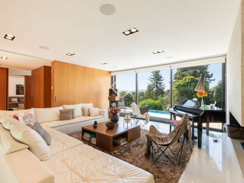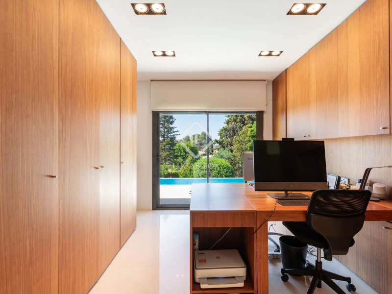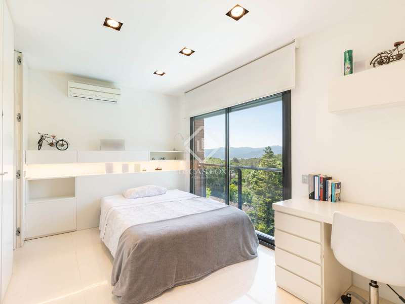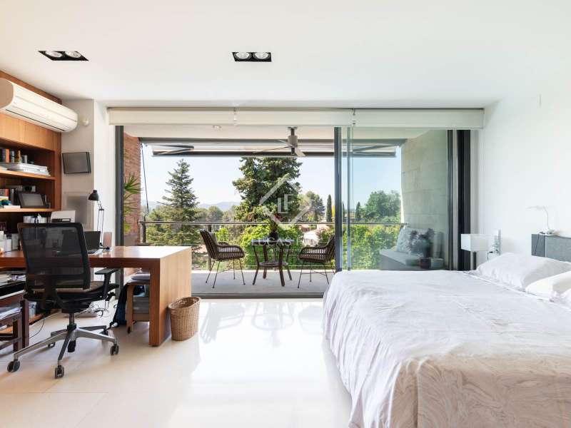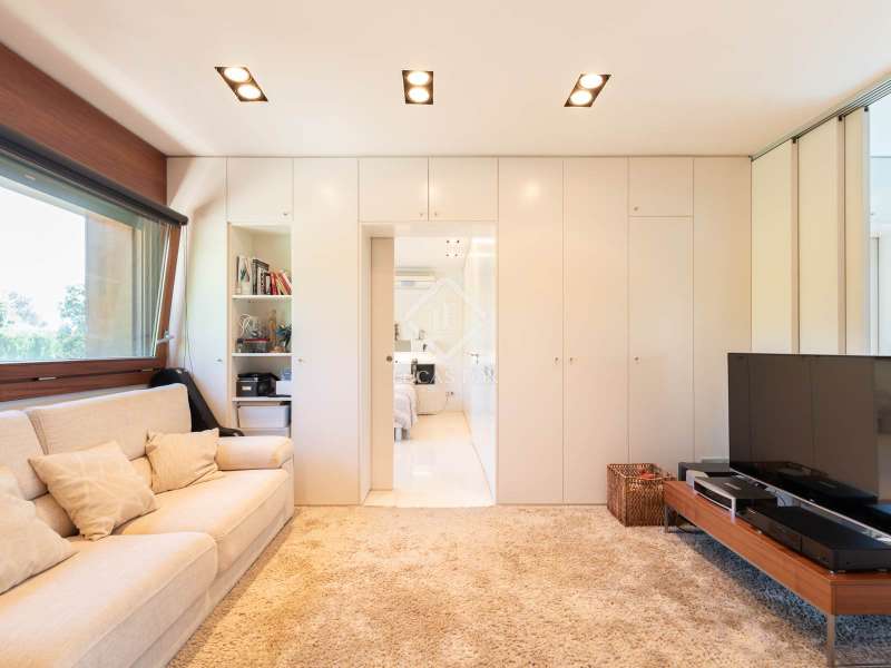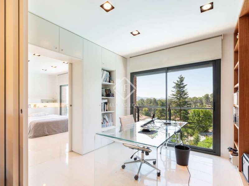 Lucas Fox is pleased to present this exclusive avant-garde style home in one of the most prestigious and privileged residential areas of Bellaterra. The property has 429 m² of built area on a 984 m² plot . It is characterized by its southerly aspect and privileged location, with wonderful views of Collserola. This luxurious property boasts an elegant, contemporary, avant-garde design with modern architectural lines, ideal for those seeking a unique and exclusive property . We enter through the ground floor, where we find the fully equipped day area . It features a semi-open kitchen, designed with high-end materials. There is also a double bedroom that can be used for different purposes, a full bathroom , and a large living-dining room with large windows and a beautiful fireplace, which adds warmth to the space. The living room access onto the beautiful garden with a large pool and waterfall. From the property, you can enjoy stunning views of Tibidabo. The upper floor houses a bright living room, an study , and two double bedrooms, each with its own full bathroom and stunning views. The master bedroom features a large dressing room and access to a private terrace with unparalleled panoramic views. Finally, on the lower ground floor, we have a large parking lot with capacity for three cars, a gym, a water room and a gym. In terms of efficiency and comfort, the house is equipped with underfloor heating and solar panels. A perfect property for those who value designer architecture, privacy, and an excellent location just minutes from Barcelona and close to all amenities. Contact us for more information.