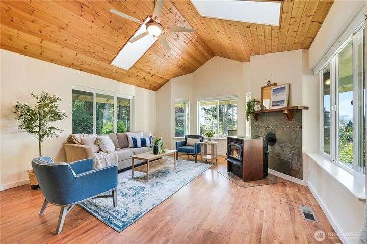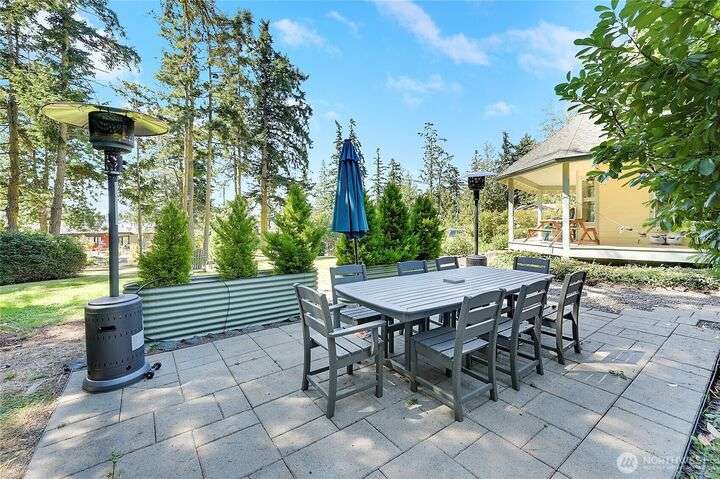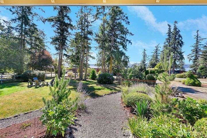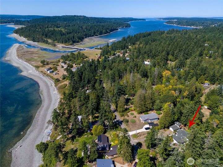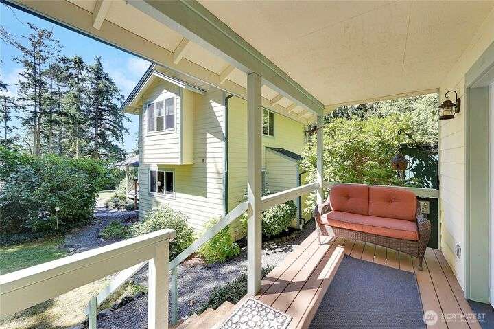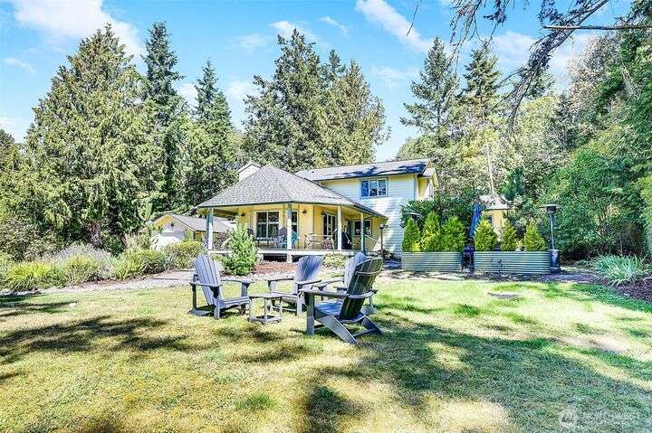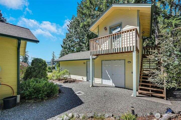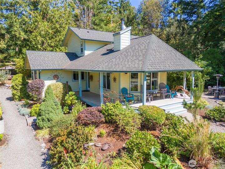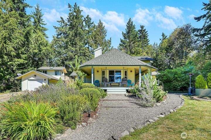 Charming south-facing home on tranquil Marrowstone Island w/ peek-a-boo water views. Vaulted cedar ceilings, a cozy pellet stove & abundant windows create a warm, inviting space. Well-appointed kitchen w/ propane cooktop opens to the dining area. Spacious main-floor bedroom offers walk-in closet & full bath w/ jetted tub while the oversized bedroom upstairs features views, a walk-in closet & ¾ bath. Detached single-car garage includes a private art studio w/ views & workshop below. Plus an additional studio behind the home creates a ideal gym, craft, or bunk room. Enjoy evenings on the wrap-around porch overlooking a thoughtfully planted yard with fruit trees & garden space, or relax on the spacious private patio.