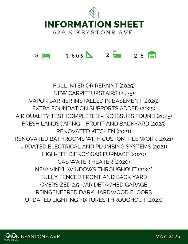 Seller is offering up to $5,000 in closing cost assistance AND a one year home warranty with a strong offer. Welcome to 629 N Keystone Ave-where charm meets convenience just minutes from downtown Indy. This 3-bedroom, 2-bath home is fully updated and move-in ready, featuring an open-concept main floor, and a large kitchen island perfect for entertaining or weeknight dinners. The thoughtful layout includes a rare pantry/laundry combo and two main-level bedrooms, while the entire upstairs serves as a versatile retreat-ideal for a bedroom, office, or studio space. You'll love the cozy living room, complete with blackout curtains for the perfect movie night setup. Outside, enjoy a fenced in back and front yard as well as a 2.5 car garage. Located just blocks from Bottleworks District, Amelia's Bread, Kan-Kan Cinema, and Ellenberger Park, you'll have the best of Indy at your doorstep.