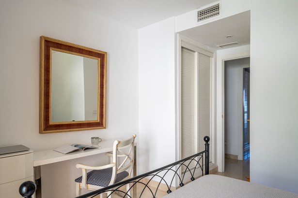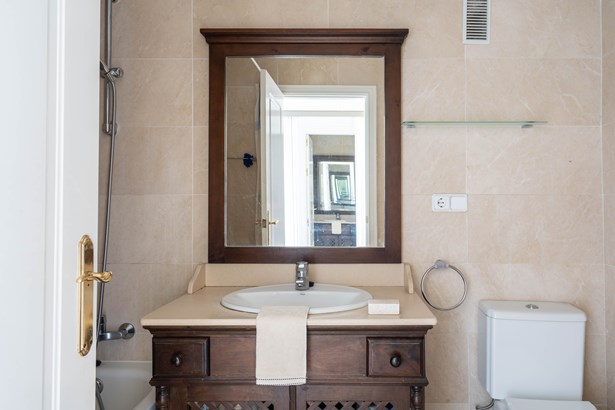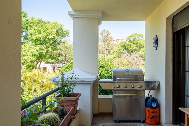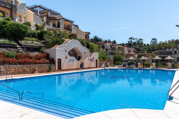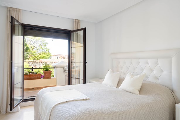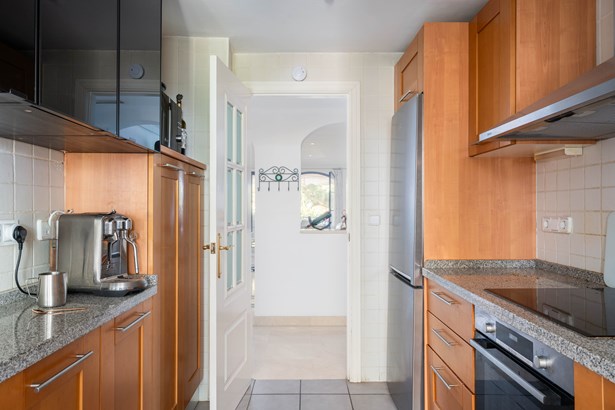 This elegant 2-bedroom, 2-bathroom apartment offers a more generous and charming interior layout than most properties on the market, located within the highly sought-after Los Arqueros Golf & Country Club, a romantic Andalusian-style community nestled in the hills of Benahavís. Just 7 minutes from the beach, Golden Mile, and Puerto Banús, it combines spacious living, timeless architecture, and a peaceful resort lifestyle.Step into the bright, open-plan living and dining area, where arched double French doors lead onto a covered terrace surrounded by mature gardens. These beautifully curved doors add a romantic, architectural elegance while also highlighting the apartment’s larger layout, in contrast to nearby units that typically offer only a single French door or modern sliding doors.The kitchen is equally impressive, boasting a double-sided design with extended countertops and additional cabinetry, providing more space and functionality than comparable apartments. Whether enterta