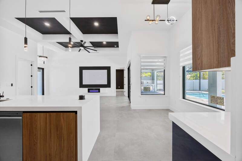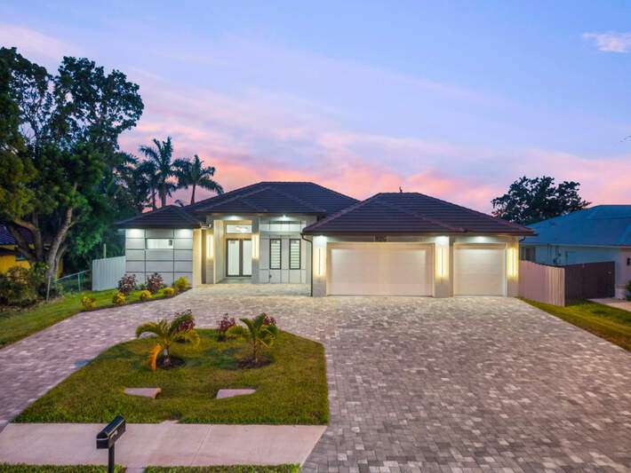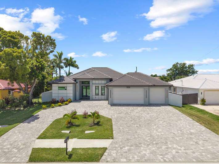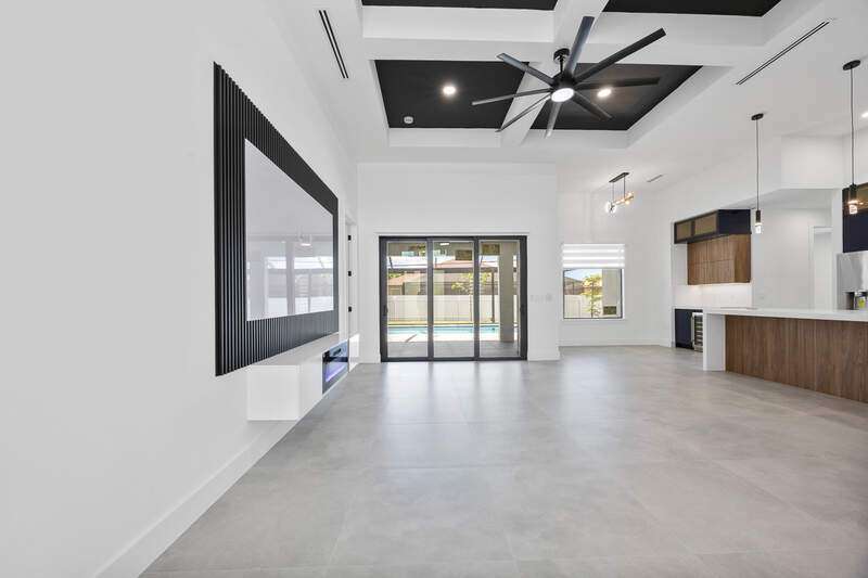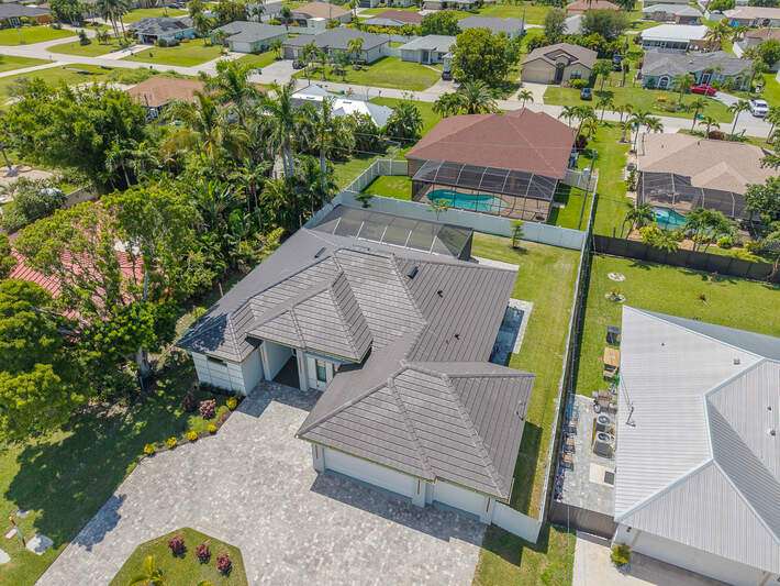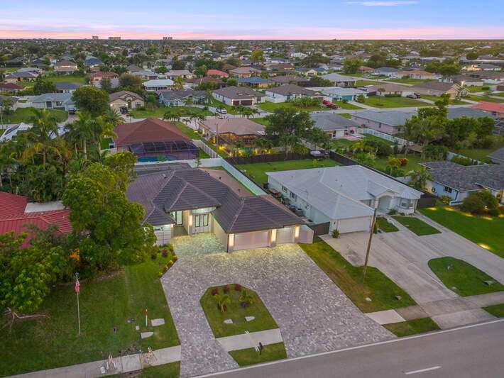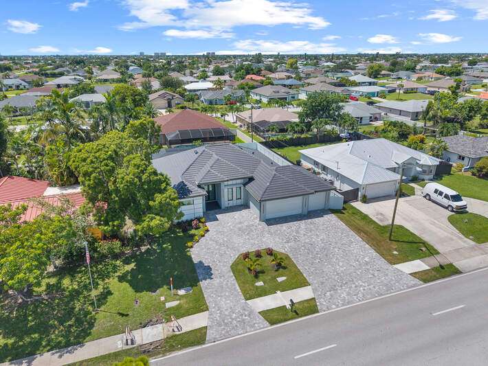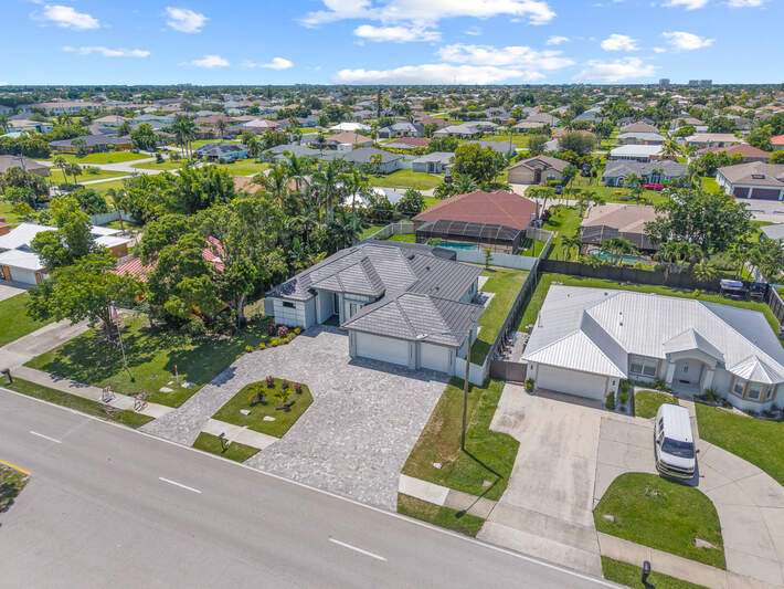 Welcome to this stunning new construction home in the heart of Cape Coral, offering a perfect blend of luxury and functionality. This 4-bedroom, 3-bathroom residence is thoughtfully designed with high ceilings and an open-concept layout, creating a spacious and inviting atmosphere for modern living. The gourmet kitchen is a true showpiece, featuring custom cabinetry, full-height cabinets, a convenient pot filler, and a designated dry bar/coffee station. Every bedroom closet is equipped with built-in cabinets, adding style and organization throughout the home. Tile flooring runs seamlessly across every room, enhancing the elegance and durability of the interior. The primary suite is a private retreat, highlighted by expansive his-and-hers walk-in closets with built-in cabinetry, and a spa-like bathroom featuring a jetted soaking tub, dual vanities, a walk-in shower, and a self-open toilet for added convenience. The home also includes a full laundry room complete with a laundry tub and cabinetry for extra storage. Step outside to your private oasis, where you'll find a screened-in pool area with a pool bath, perfect for entertaining. The backyard also offers a paved open area within the fenced yard, providing even more space for relaxation or gatherings. Additional features include a 3-car garage, circular driveway, durable tile roof, and impact-resistant doors and windows for peace of mind. This home delivers everything you need to enjoy Florida living at its finest. Whether it's hosting poolside parties, cooking in your chef-inspired kitchen, or simply unwinding in your spa-like owner's suite.