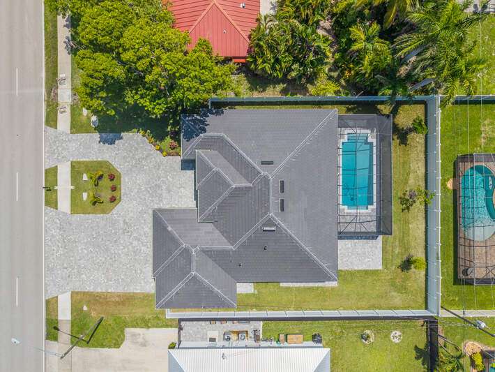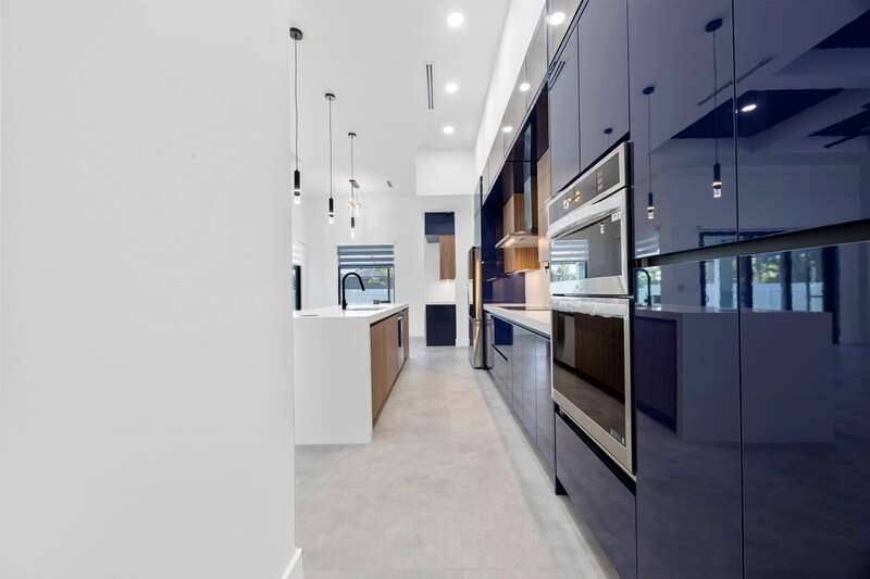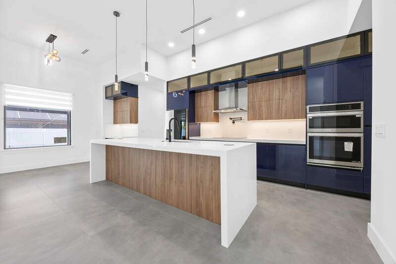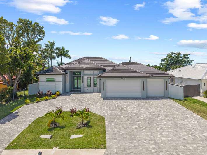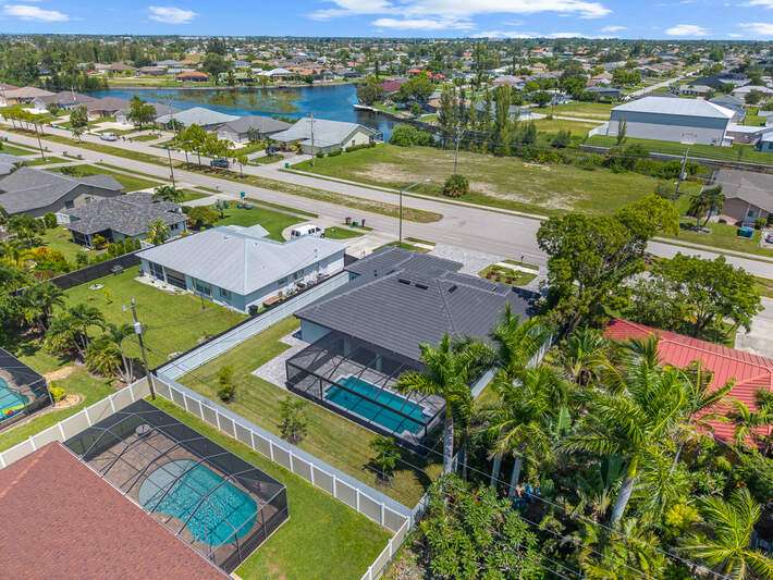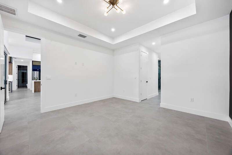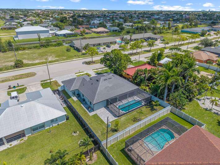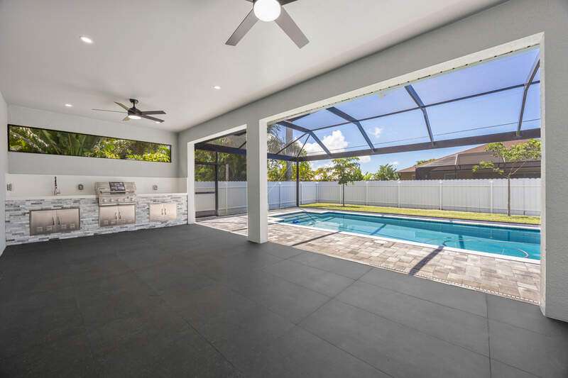 Welcome to this stunning new construction home in the heart of Cape Coral, offering a perfect blend of luxury and functionality. This 4-bedroom, 3-bathroom residence is thoughtfully designed with high ceilings and an open-concept layout, creating a spacious and inviting atmosphere for modern living. The gourmet kitchen is a true showpiece, featuring custom cabinetry, full-height cabinets, a convenient pot filler, and a designated dry bar/coffee station. Every bedroom closet is equipped with built-in cabinets, adding style and organization throughout the home. Tile flooring runs seamlessly across every room, enhancing the elegance and durability of the interior. The primary suite is a private retreat, highlighted by expansive his-and-hers walk-in closets with built-in cabinetry, and a spa-like bathroom featuring a jetted soaking tub, dual vanities, a walk-in shower, and a self-open toilet for added convenience. The home also includes a full laundry room complete with a laundry tub and cabinetry for extra storage. Step outside to your private oasis, where you'll find a screened-in pool area with a pool bath, perfect for entertaining. The backyard also offers a paved open area within the fenced yard, providing even more space for relaxation or gatherings. Additional features include a 3-car garage, circular driveway, durable tile roof, and impact-resistant doors and windows for peace of mind. This home delivers everything you need to enjoy Florida living at its finest. Whether it's hosting poolside parties, cooking in your chef-inspired kitchen, or simply unwinding in your spa-like owner's suite.
