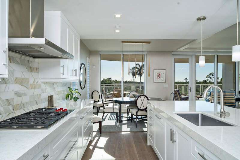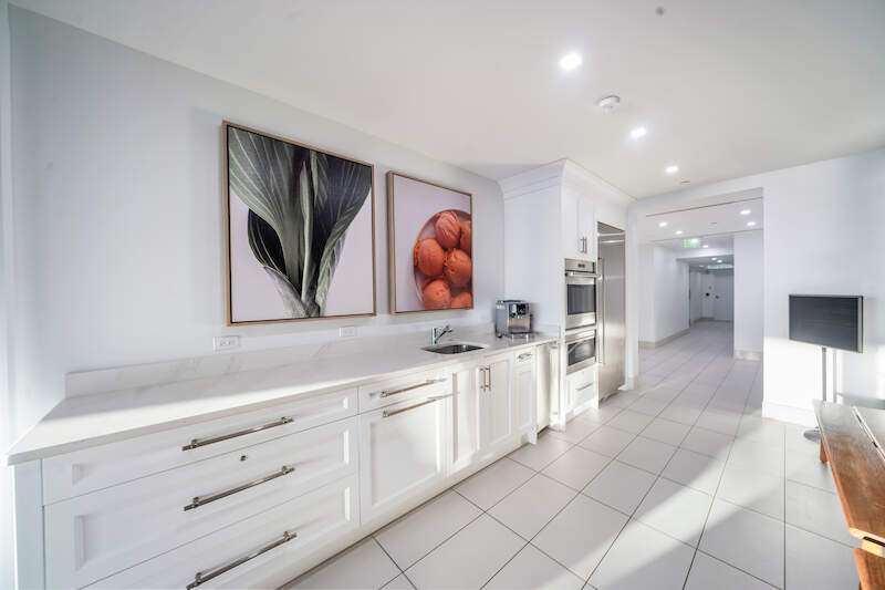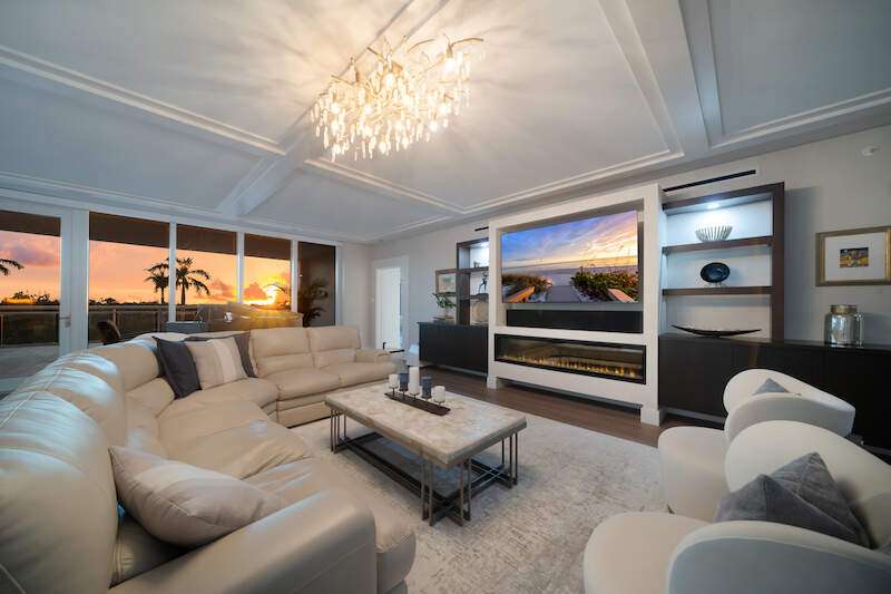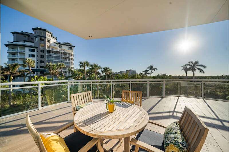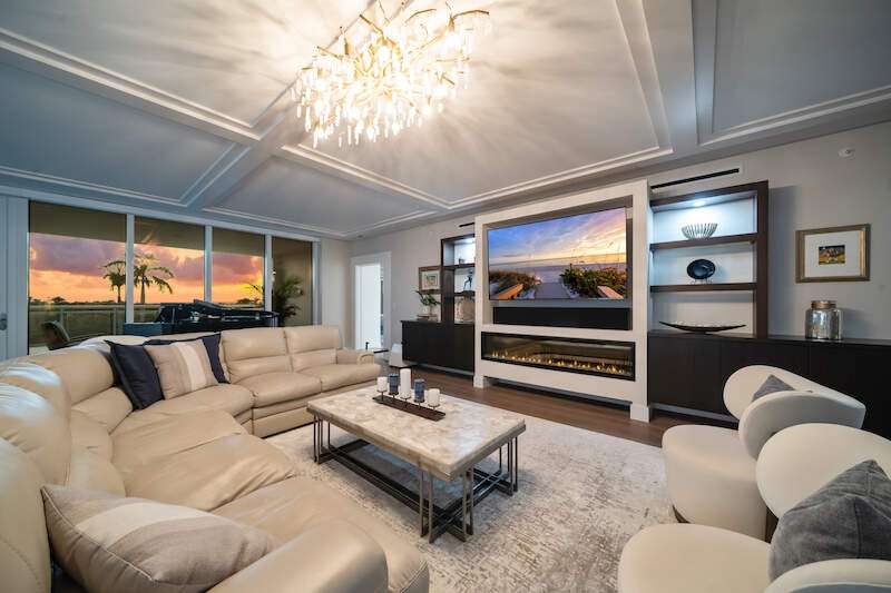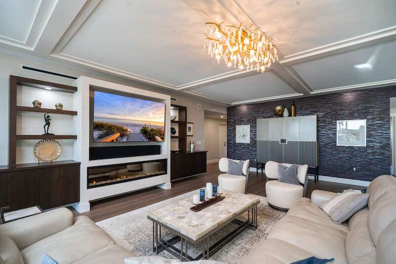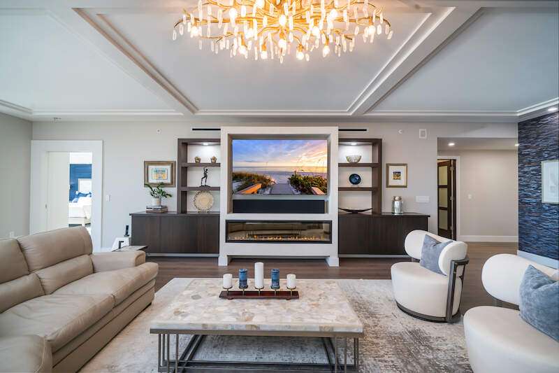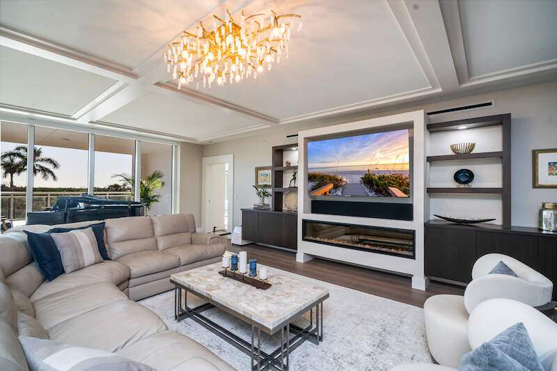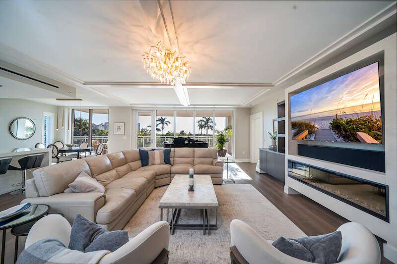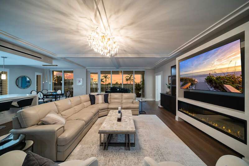 Fabulous lower-floor condo in Building One on the desirable southwest side, featuring the coveted "01" stack with an expansive wraparound balcony offering much more outdoor space than other units. Tiled plank "wood-look" flooring complements warm-toned hardwood floors throughout, creating a seamless indoor-outdoor flow. The open great room floor plan includes a custom built-in media wall with a linear gas fireplace, designer ceiling details, and a striking quartz chandelier. The gourmet kitchen boasts white cabinetry, waterfall quartz island countertops, a tiled backsplash, and top-tier appliances, plus a walk-in pantry with a beverage area and ample storage. The owner's suite opens to the lanai and features a luxurious bath with a walk-in shower, floating tub, dual vanities, and a built-out closet. Three additional en-suite guest rooms offer plantation shutters and large closets. A spacious laundry room and separate service entrance add convenience. Kalea Bay residents enjoy world-class amenities at the exclusive club, with over 100,000 square feet of luxury amenities. Includes: pools, expanded and remodeled fitness area, casual and formal dining, a beach park, fire pits, a dog park, tennis, pickleball, and short-term guest villas. Live the lifestyle of your dreams at Kalea Bay! Just minutes to sandy beaches, Mercato, fine dining and shopping.