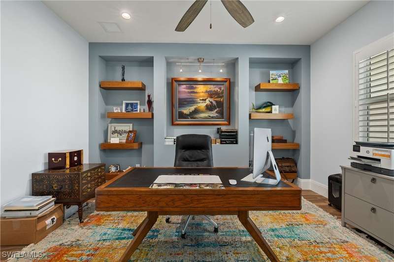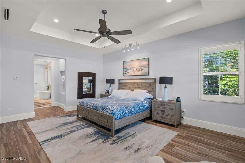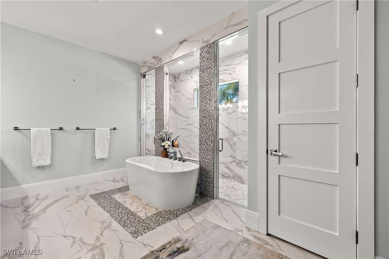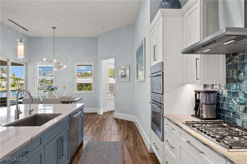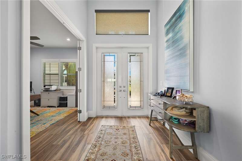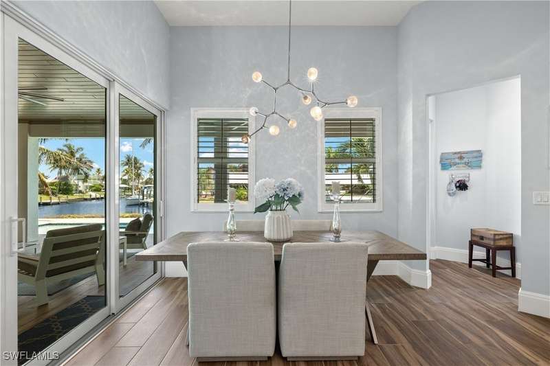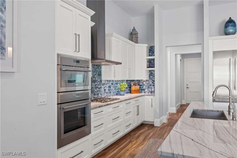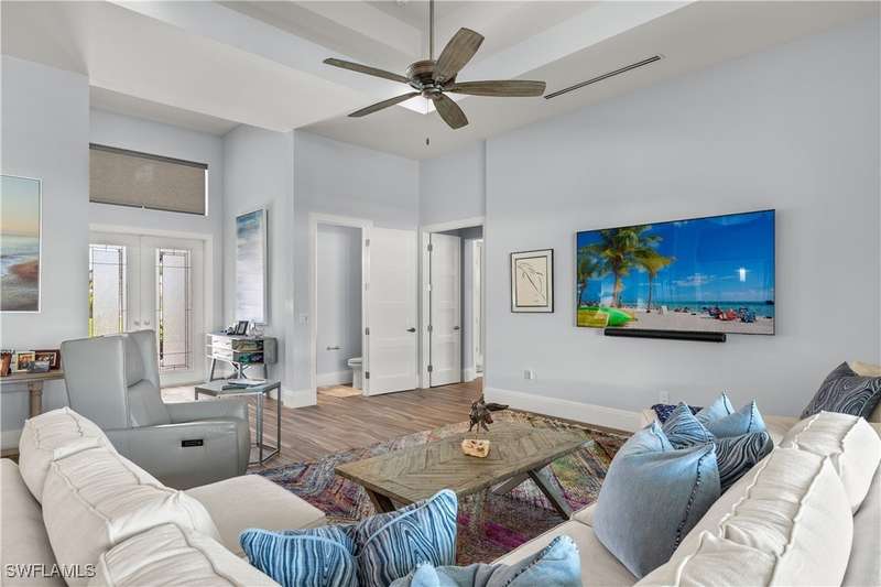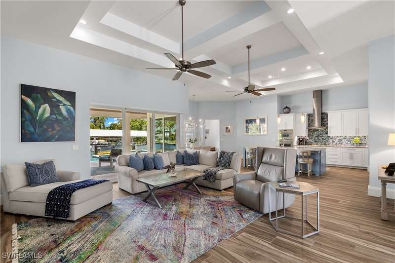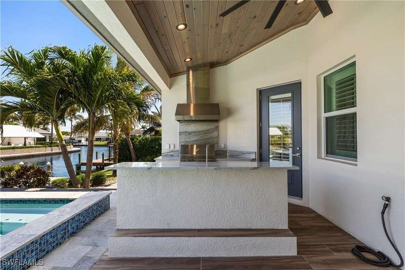 Luxurious waterfront living in one of Southwest Florida's premier boating communities - located on one of the most desirable streets within the Town & River subdivision. This 2020-built concrete residence was thoughtfully designed to impress, offering a spacious and functional layout paired with high-end custom finishes throughout. Inside, enjoy soaring tray ceilings, zero corner sliders, linear diffuser cooling vents, recessed lighting, level 5 interior drywall finishes, and 1 3/4 solid core interior doors that speak to the quality of construction. The gourmet kitchen is outfitted with premium Thermador appliances and includes a dedicated ice maker capable of producing up to 400 lbs of ice per day - ideal for entertaining or prepping for a day on the water. The home is also equipped with Icynene foam insulation, enhancing energy efficiency and year-round comfort. The generously sized bedrooms include a luxurious VIP suite with serene views of the pool and canal, along with a spa-inspired bath featuring a soaking tub and large walk-in shower. Additional interior highlights include spacious guest suites, a versatile den/flex area, a full-house water filtration system, and a water softener for added comfort. Outside, enjoy breathtaking wide water views from the negative edge pool and expansive outdoor living area. The fully fenced backyard is beautifully landscaped and features a private outdoor kitchen with gas grill, fridge, and bar. Boaters will appreciate the covered dock with a 15,000 lb boat lift and 40' cover, offering deep water access and a wide canal perfect for maneuvering larger vessels. The home also features sealed stucco soffits, adding both durability and aesthetic appeal. With modern construction, Gulf access, and a curated list of luxury upgrades, this home delivers true Florida waterfront living at its finest - designed for comfort, style, and effortless coastal entertaining.