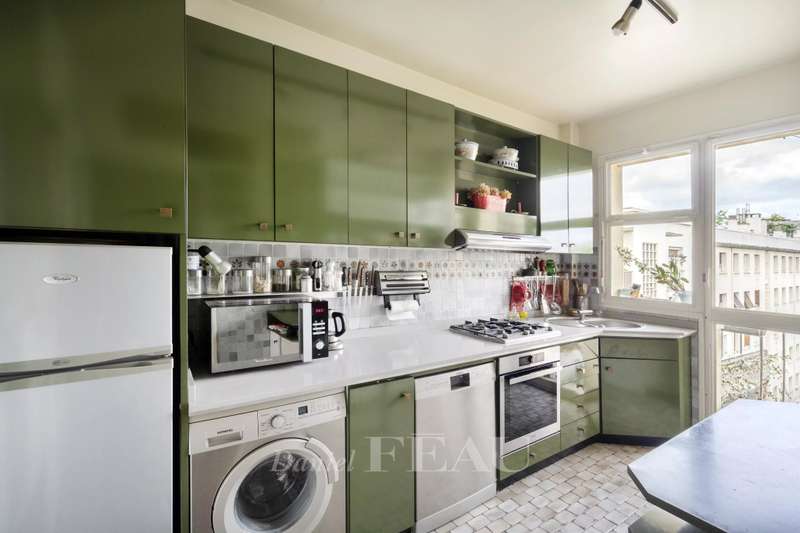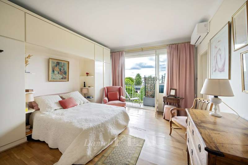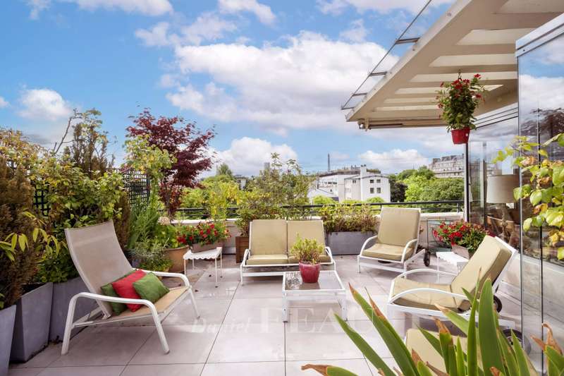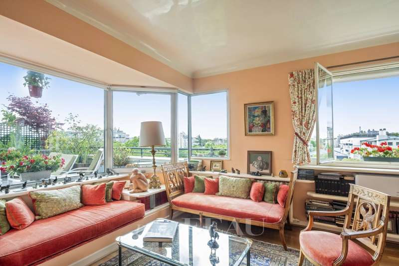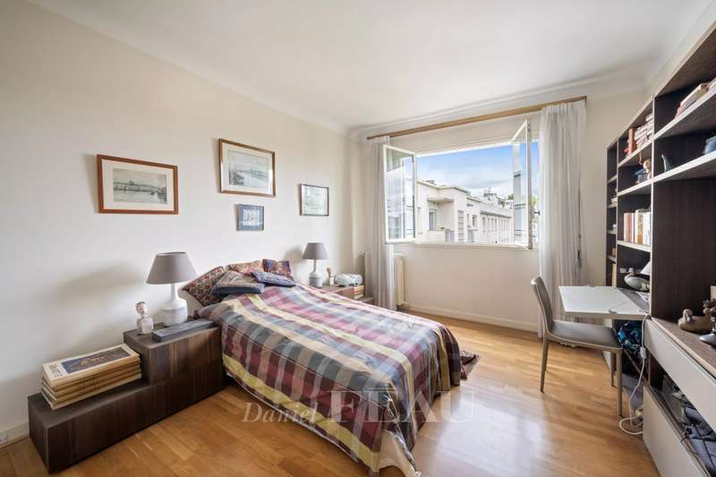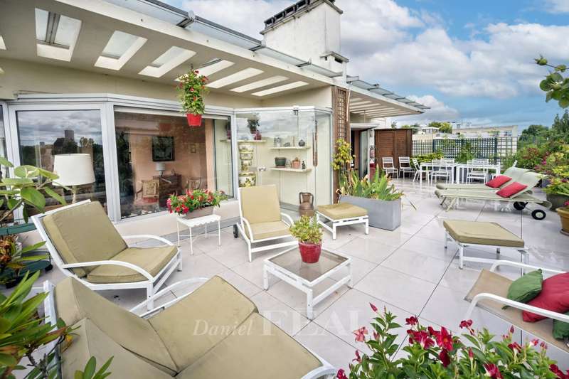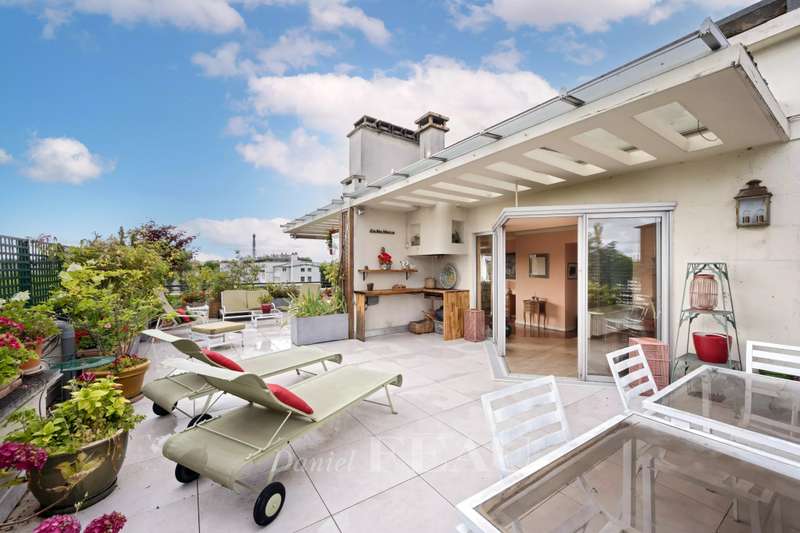 Boulevard la Saussaye. This apartment on the top floor of a mid 20th century building includes a triple living/reception room opening onto a 64 sqm terrace, a separate kitchen, a master suite with a bathroom and a study, a bedroom with a shower room, and a guest wc. A third bedroom would be possible. With two cellars. Two lock-up garages may be acquired for a further 40000€ each. Pasteur catchment area. Renovation is required to exploit the full potential.