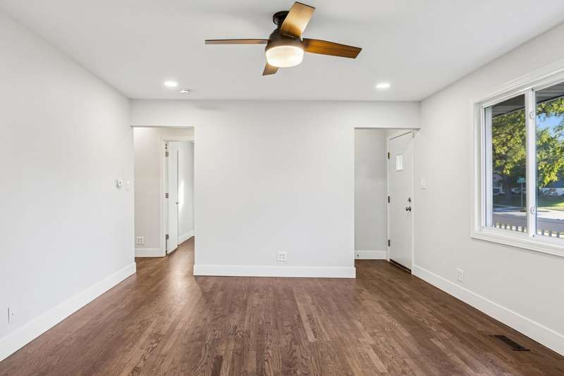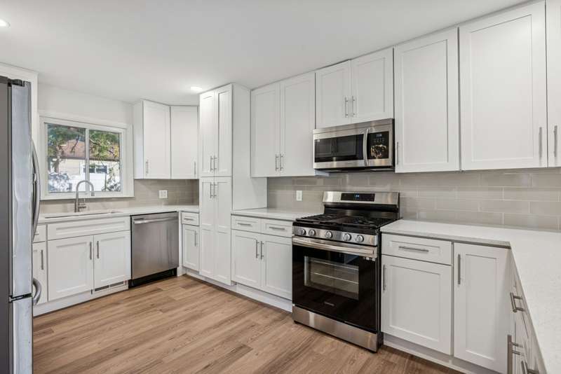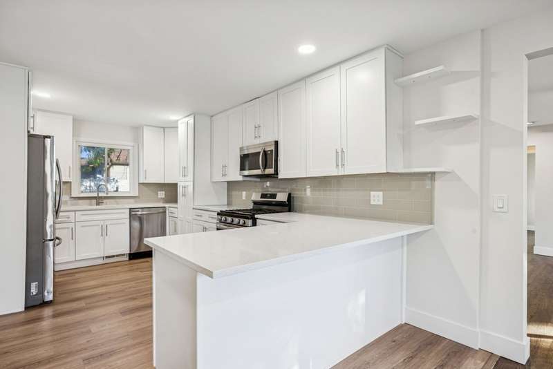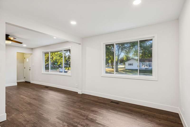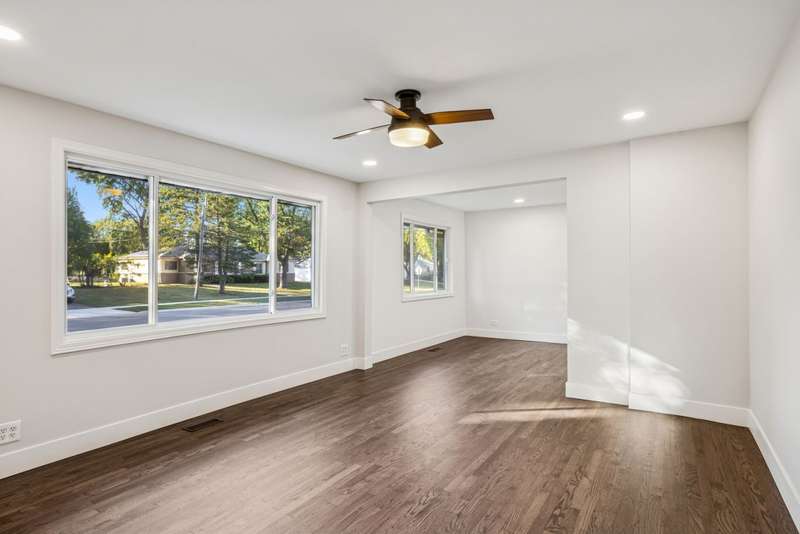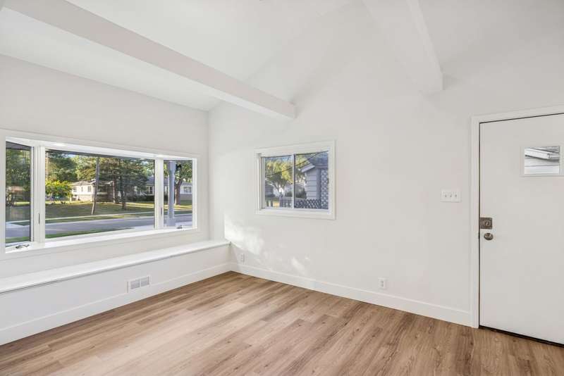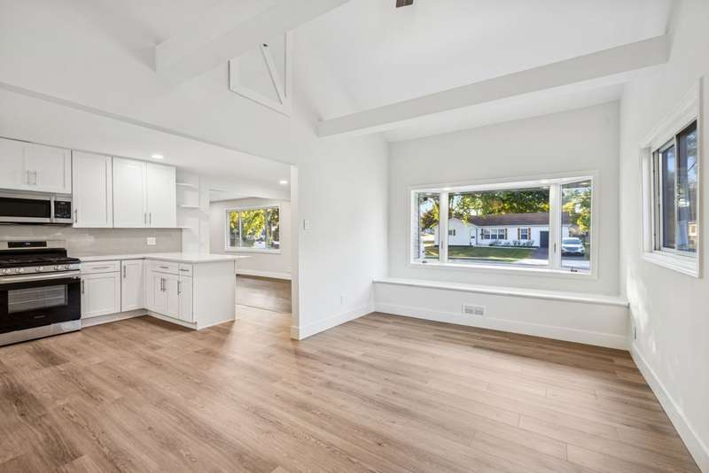 Fully rehabbed brick ranch in Hoffman Estates! This 3 bed/2 bath home offers modern updates with classic charm. Step inside to a spacious living room filled with tons of natural sunlight and hardwood floors throughout the main level. To the right, you'll find three generously sized bedrooms, including a primary suite with a private full bath and walk in cedar closet. The front living room flows into the dining area and a beautifully renovated kitchen featuring white shaker cabinets with soft-close drawers, quartz countertops, breakfast bar seating, and stainless steel appliances. A large second living space, also bright with natural light, boasts soaring vaulted ceilings, a bay window with built-in storage bench, and convenient utility closet with washer and dryer. Outside, enjoy your huge two-tier deck, perfect for entertaining, along with a 4-car tandem garage complete with a walk-up attic. A large backyard shed adds extra storage. Prime location just steps to Fairview Elementary and Fairview Park, as well as Schaumburg Golf Club nearby. Highly rated Schaumburg school district, and minutes to Woodfield Mall, shopping, dining, and major highways.