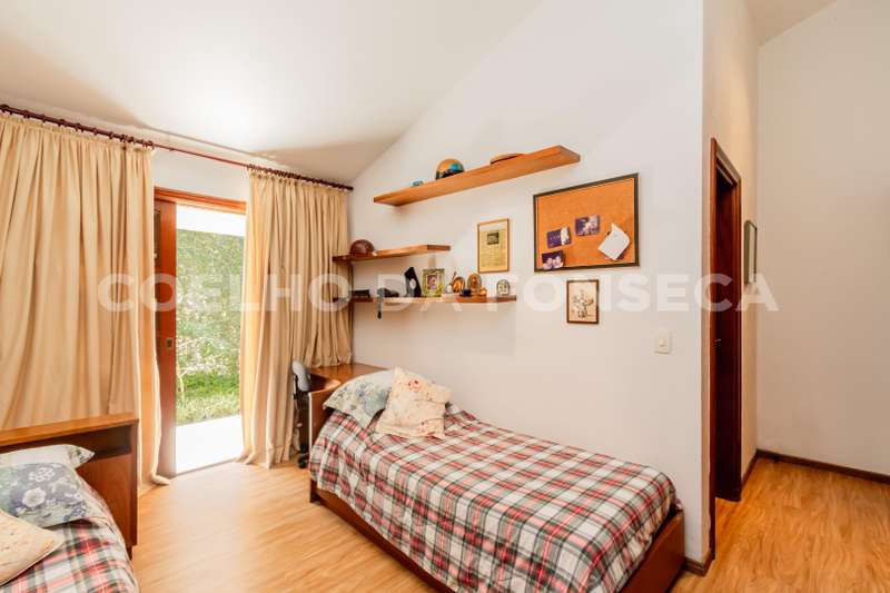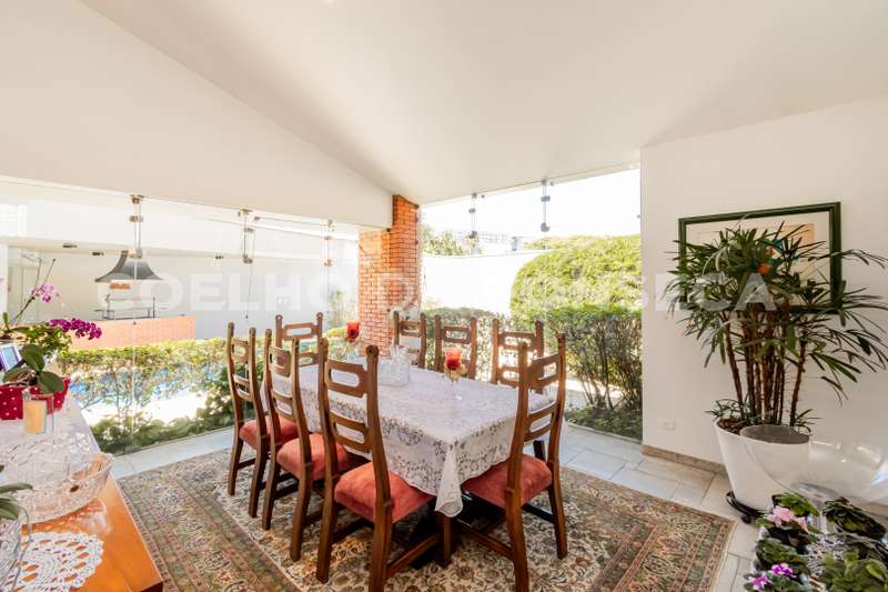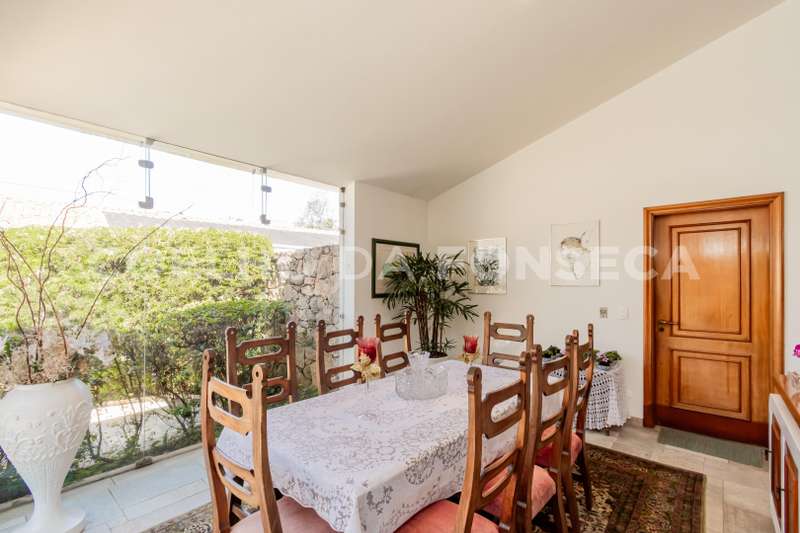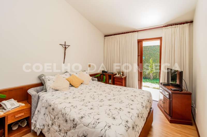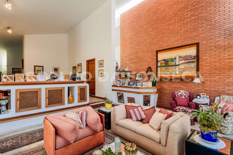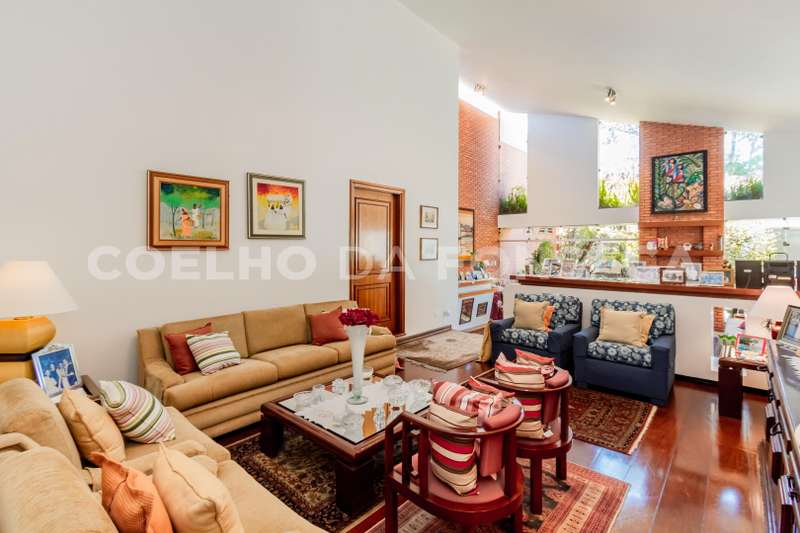 Casa térrea ajardinada, com pé direito alto e permitindo a entrada de muita luz natural na área social, possui amplo living com lareira e vários ambientes, sala de estar, sala de jantar, sala de almoço, copa e cozinha, área de serviço, escritório, lavabo e área externa com piscina, sauna com 2 vestiários e muito verde em torno da churrasqueira integrada ao espaço gourmet fechado e envidraçado que ainda abriga a academia e 01 suite, internamente contém 04 suites, sendo 01 master com closet que se ligam ao home theater com saída para a garagem para 5 ou 6 carros.