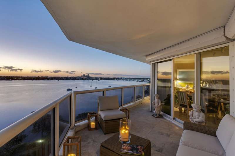 Stunning Waterview Towers, gorgeous Intracoastal setting. Premiere full-service building boasts newly renovated lobby, elevators, terrace overlooking Palm Harbor Marina. Breathtaking view overlooking the island, Poinciana Plaza, The Breakers. Open spaces boasting modern updates with artful decor. Rare design has full wall of retracting sliding doors for an uninterrupted meld from outdoors to in. Bar offers open views thru the main spaces. Kitchen w black granite, Bespoke fridge, custom sink, pantry. MBR en-suite bath, custom vanity, renovated walk-in shower, walk-in closet. 2nd BR has modern built-in office & shelving. Newer HVAC, HWT, lighting, electric, windows, blinds. In-unit laundry & trash chute. Building amenities incl. concierge, 24hr valet, pool, sauna, tennis, pickle ball, gym.