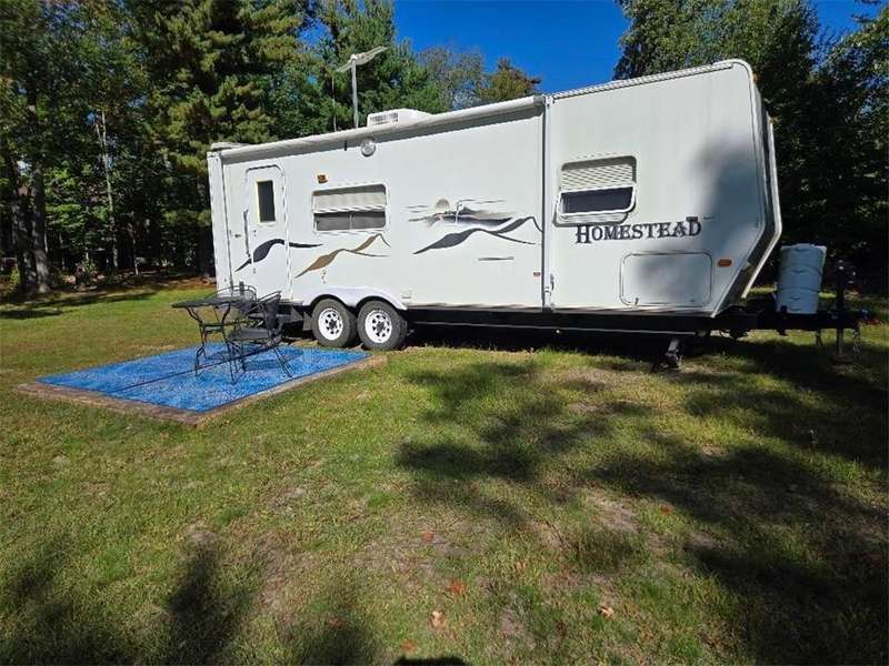 Check out this amazing lake lot with 142 feet of sandy frontage on Little Hubert and 127 feet of frontage on Galdstone Lake. This hard to find 1.39 acre lake lot has nice level elevation to the sandy shoreline on Little Hubert Lake, a newer storage shed, and a 2004 - 24 foot StarCraft travel trailer. Use the travel trailer to enjoy the property while you build your dream lake home. This property was recently surveyed and the setback stakes are visible.