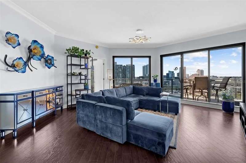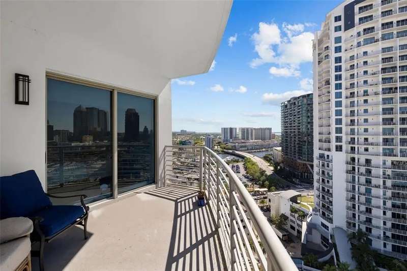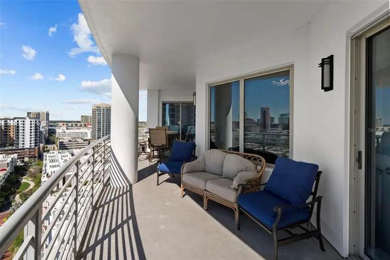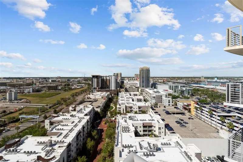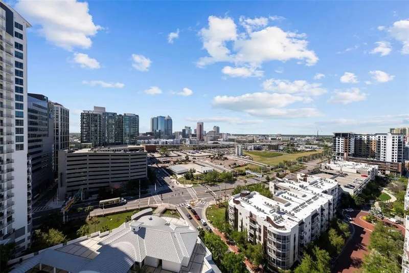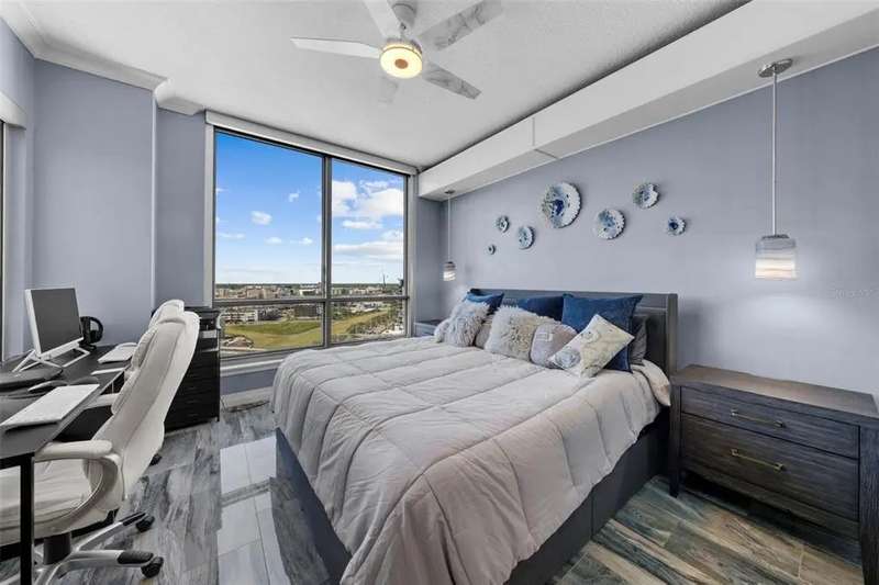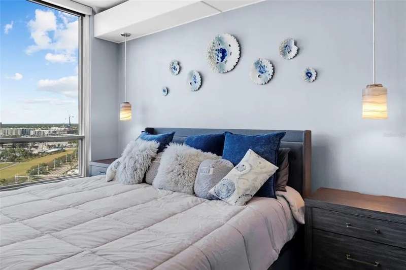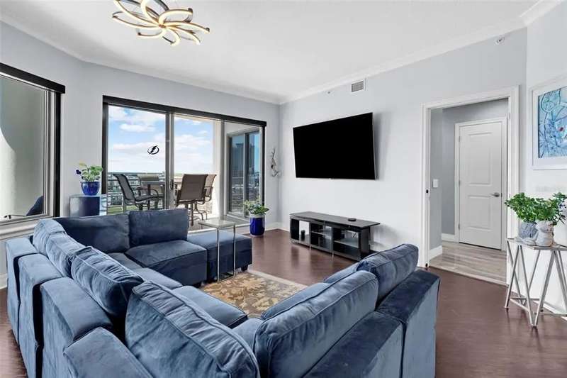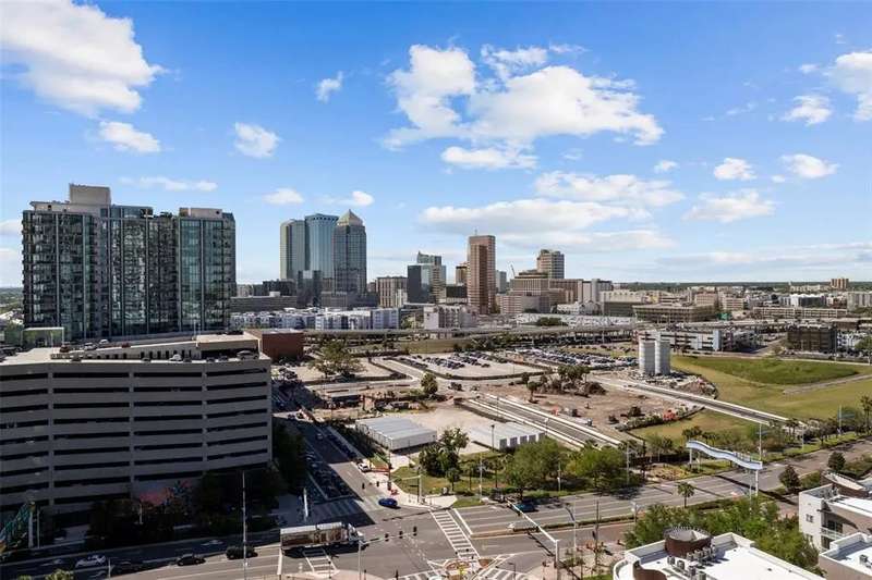 Beautifully furnished 17th-floor condo offers stunning panoramic west-facing views of downtown Tampa, showcasing breathtaking sunsets. The spacious two-bedroom layout features two upgraded ensuite bathrooms, with each bedroom boasting a sliding glass door that opens onto the balcony. The chef-inspired kitchen is equipped with sleek white quartz countertops, a deep farmhouse sink, and rich deep blue accents throughout. The kitchen is fully equipped for your everyday cooking needs. The first bedroom includes a smart TV, a king sized bed. The second bedroom features a twin bed (with the option to add a second for a king) and a large closet. The living area offers an 82" TV and a spacious, comfortable deep blue sofa. Step outside to your private balcony for al fresco dining at the Mosaic high-top table, all while taking in views of the city and Water Street area. Walking distance of Sparkman’s Wharf, Amalie Arena, and Water Street. Resort-style pool. 24/7 security. Electric blinds on all windows.