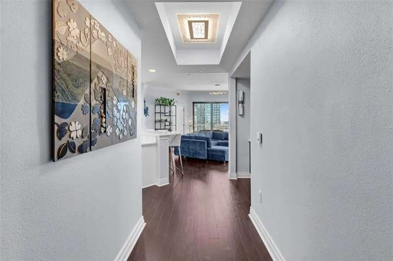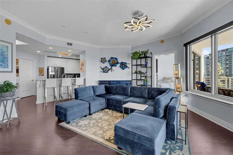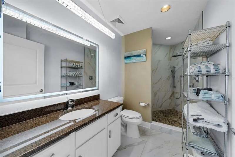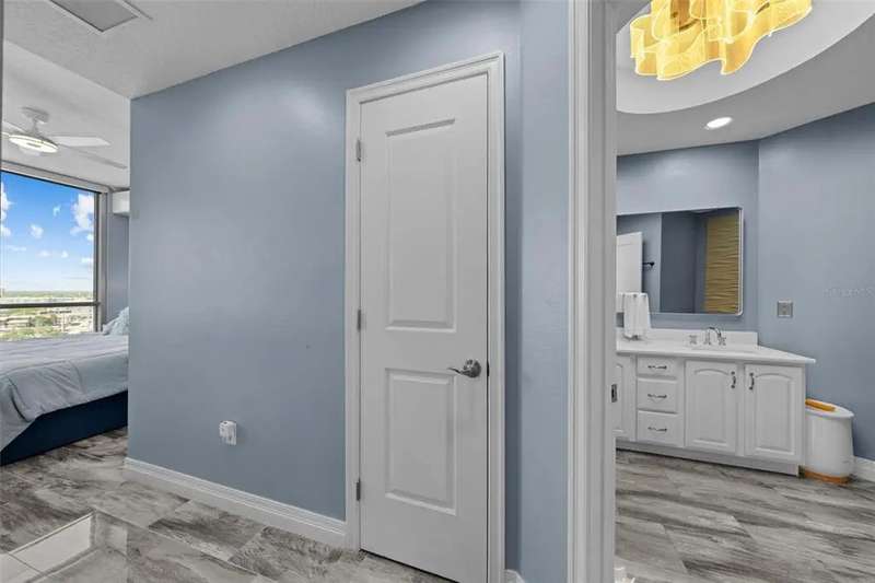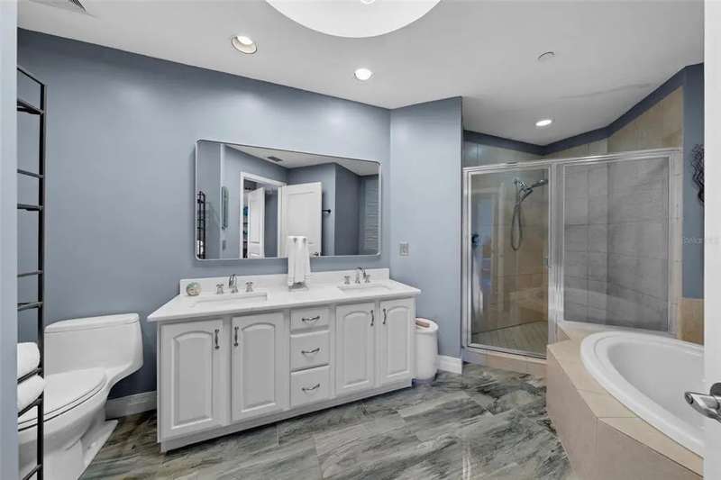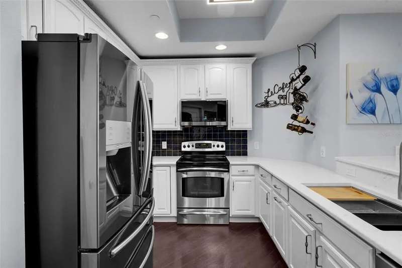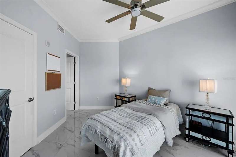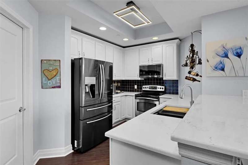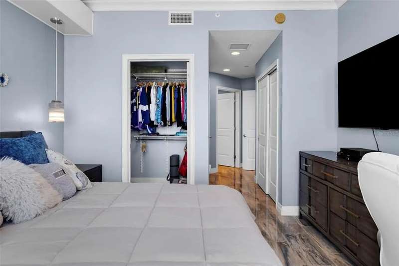 Beautifully furnished 17th-floor condo offers stunning panoramic west-facing views of downtown Tampa, showcasing breathtaking sunsets. The spacious two-bedroom layout features two upgraded ensuite bathrooms, with each bedroom boasting a sliding glass door that opens onto the balcony. The chef-inspired kitchen is equipped with sleek white quartz countertops, a deep farmhouse sink, and rich deep blue accents throughout. The kitchen is fully equipped for your everyday cooking needs. The first bedroom includes a smart TV, a king sized bed. The second bedroom features a twin bed (with the option to add a second for a king) and a large closet. The living area offers an 82" TV and a spacious, comfortable deep blue sofa. Step outside to your private balcony for al fresco dining at the Mosaic high-top table, all while taking in views of the city and Water Street area. Walking distance of Sparkman’s Wharf, Amalie Arena, and Water Street. Resort-style pool. 24/7 security. Electric blinds on all windows.