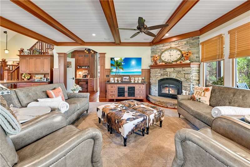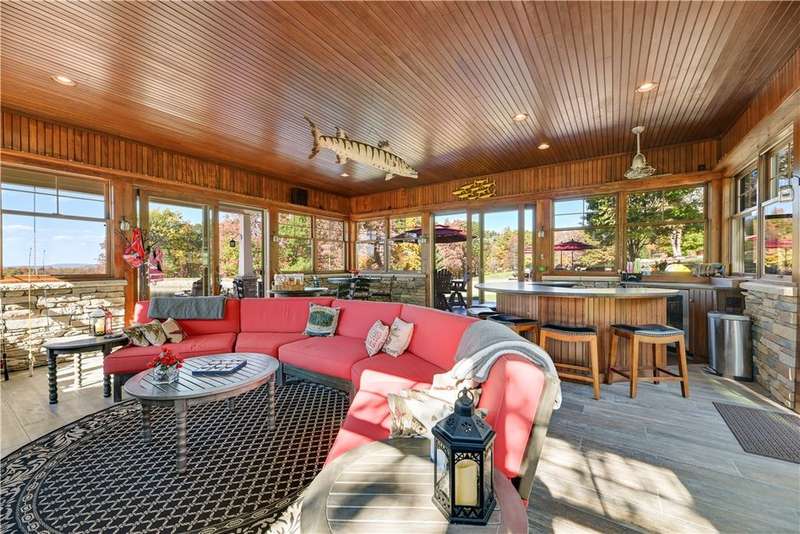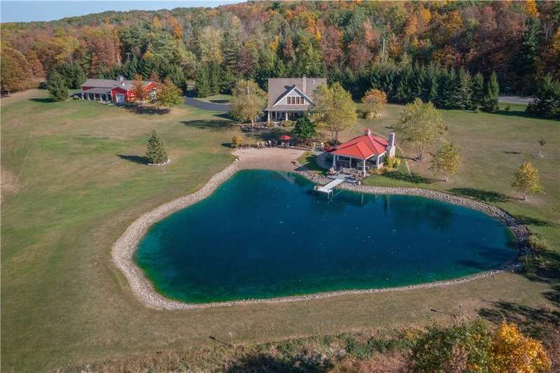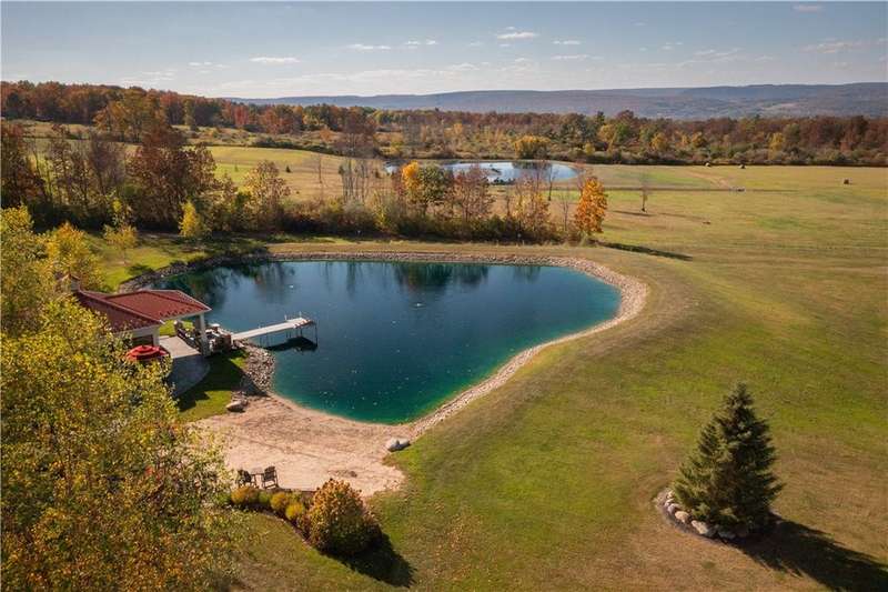 Experience timeless craftsmanship and modern luxury in this extraordinary custom-built 3 bedroom, 2 full bath country estate, nestled on top of 20 picturesque acres of rolling countryside, with views that stretch all the way to Bristol Mountain! Every inch of this home was handcrafted and thoughtfully designed by the owners, blending rustic charm with refined elegance. Step inside to discover a soaring floor to ceiling stone fireplace, tray ceiling, custom built cabinetry throughout, and expansive living spaces ideal for entertaining or relaxing in comfort. Wrapped in windows, the home is bright and cheery and you can enjoy the view from every room! The gourmet kitchen features stunning granite counters, commercial-grade top-of-the-line appliances, perfect for both family meals & grand gatherings. Gorgeous hardwood floors throughout. Walk-in pantry with first floor laundry. Small office nook off of kitchen. First floor Primary bedroom with custom built-in closets and tiled primary bath. A lovely winding staircase leads upstairs where you will find 2 additional bedrooms, and a cozy family room with piano and a spa like bathroom complete with Aquatic airbath tub. Outdoors, a private swimming pond w/ sand beach, dock & enclosed entertainment pavilion creates a resort-like oasis right at home. Enjoy serene evenings by the water, host unforgettable parties, or simply unwind in natures embrace. A large finished outbuilding offers multiple storage bays and a "man cave" fit for a king, ideal for entertaining weekend guests, with walk-out covered porch for enjoying the views! Take a stroll and explore the woods and enjoy the wildlife. Multiple groomed trails throughout the wooded acreage invite you to take a stroll and explore the woods and enjoy the abundance of wildlife! This Finger Lakes estate combines the best of luxury, privacy and craftsmanship- a rare find for those seeking a private retreat without compromising on comfort or timeless style.