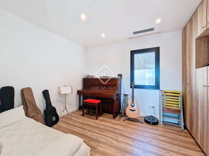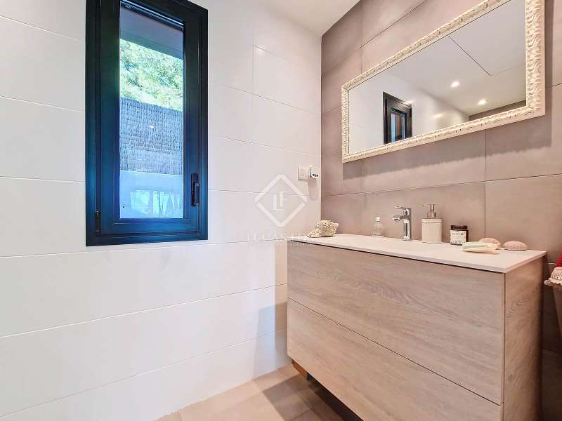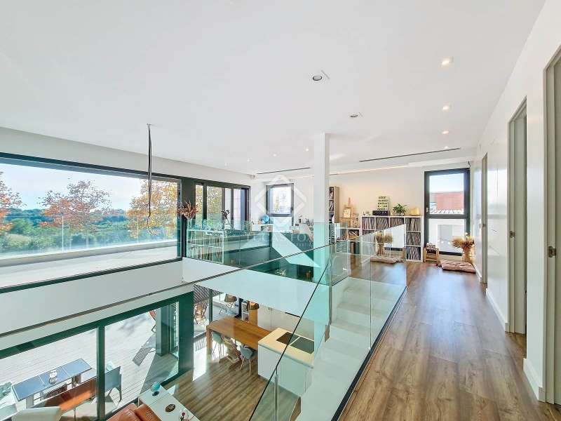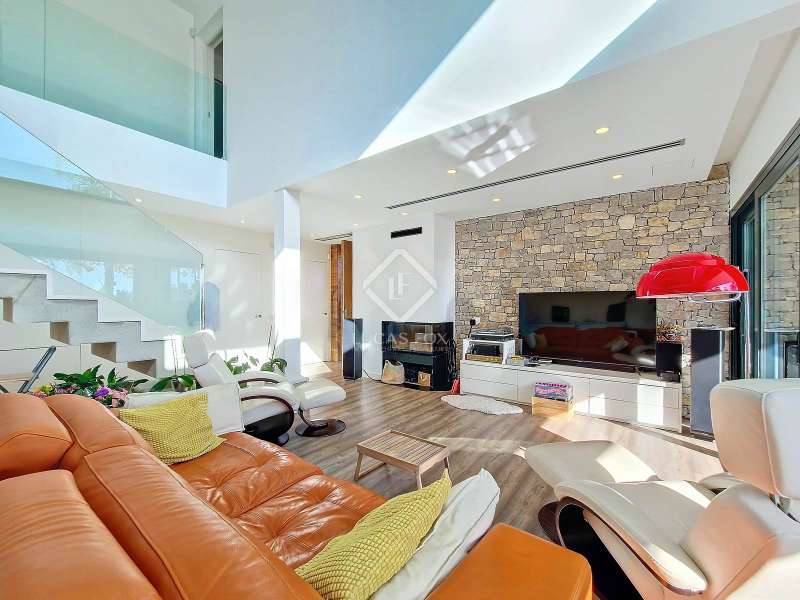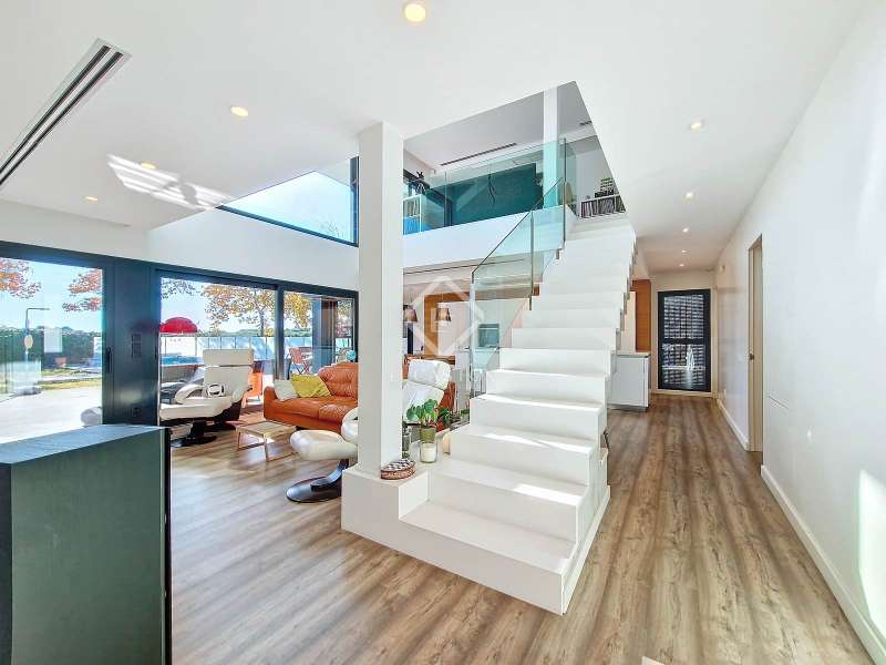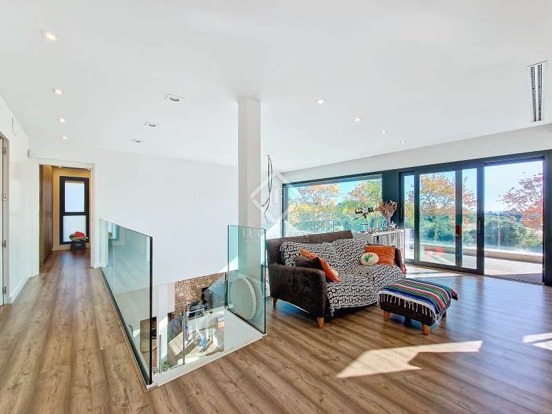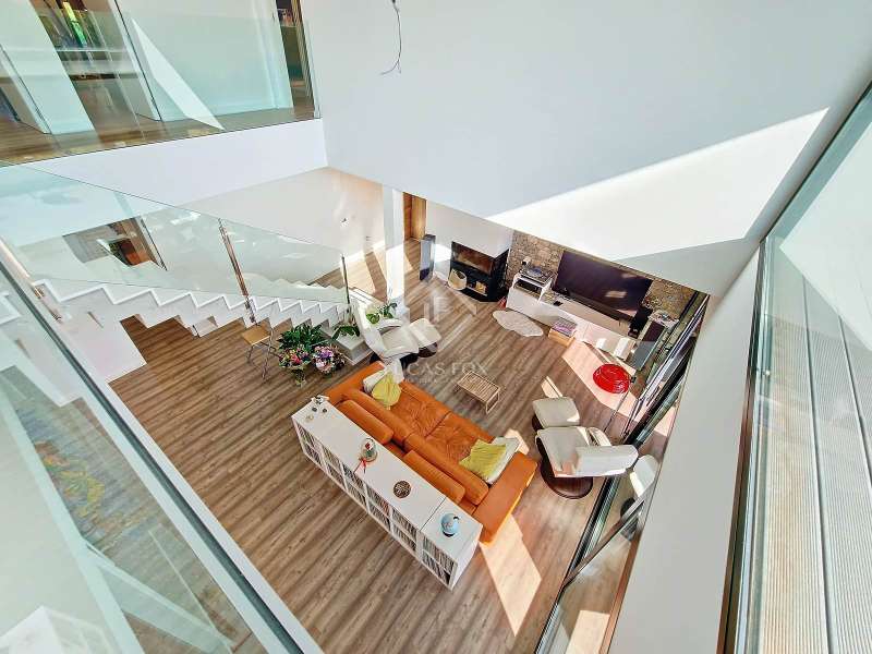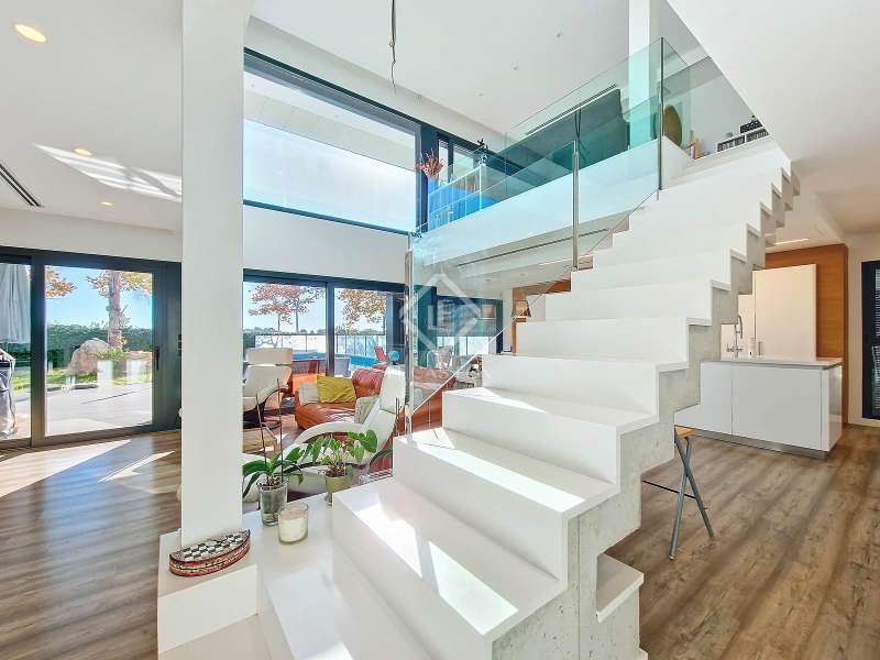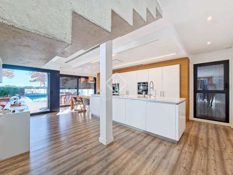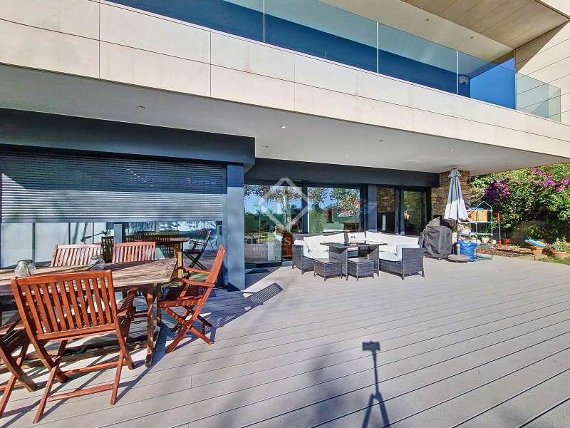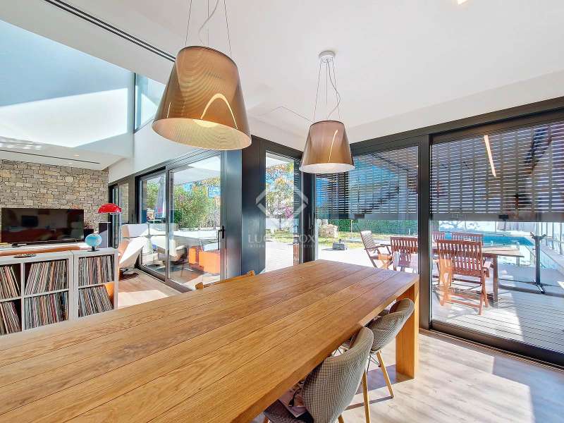 Lucas Fox presents this detached villa located in one of the most exclusive areas of Vilanova i la Geltrú. The property, which stands out for its modernity and functionality, is located just a few minutes from all amenities and is ideal for those seeking an exceptional lifestyle. The property enjoys a perfect layout. The day area is open plan, in a single room, with spacious and bright environments. It offers a comfortable living room, the dining area and an elegant integrated kitchen that connects to the exterior. Above the dining room, there is a multipurpose loft that can function as an additional living room, library or creative space. From the dining room and from the kitchen, we have access to the exterior porch. Here there is a chill-out area to relax, an infinity pool and an exterior dining room . Behind the porch, there is a garden to enjoy outdoors. On this same floor, we find a utility area, as well as a guest bathroom with a shower and a large bedroom on the ground floor ideal for guests. On the upper floor , there is the spacious and elegant main bedroom , which comes equipped with a dressing room and a private bathroom with a spacious shower. The other two bedrooms, which are bright and versatile, can be adapted to different needs. There are also two complete bathrooms with modern finishes and designer showers. On the lower ground floor, we find a multipurpose room that is currently used as a dressing room, with the possibility of converting it into a bedroom or study. There is also a wellness area with the possibility of installing a gym, jacuzzi or indoor pool, according to your preferences. The large double garage has capacity for two vehicles inside and there is an additional space for two more cars on the exterior ramp. The garage also has space to park motorcycles and even a small workshop to always have tools at hand. The machine room and wood room are complementary spaces to maximize the functionality of the home. The property includes exclusive features and high quality. The façade of the house has a modern design that guarantees thermal and acoustic efficiency. The entire property has advanced home automation that allows you to control LED lighting, air conditioning and other systems from anywhere. It has solar panels and other systems to achieve class A energy efficiency. It is also prepared to install a lift that gives access to all floors from the floor to the night area. From the first floor, there are views of the sea. In addition, thanks to its privileged orientation and its large windows, it enjoys abundant natural light in all spaces. This property is located in one of the most exclusive areas of Vilanova i la Geltrú, offering privacy while being close to all necessary amenities : schools, shops, restaurants and leisure areas . Its residential setting is ideal for enjoying tranquility without giving up the convenience of a central location. This property boasts luxurious design, quality, innovation and sustainability. Every detail has been carefully thought out to offer comfort, exclusivity and style. Don't miss the opportunity to visit this unique property. Contact us for more information or to arrange a personalized visit.