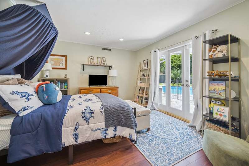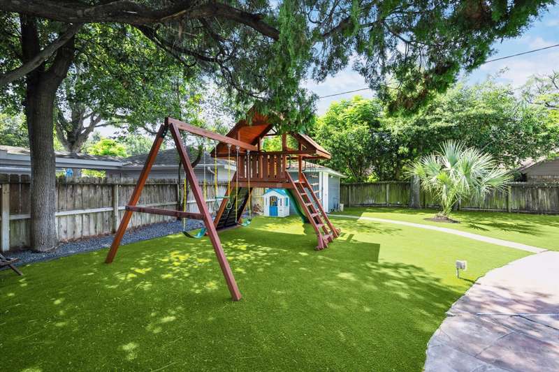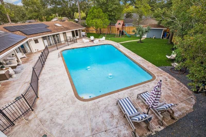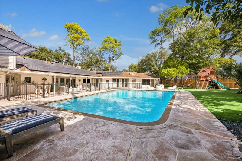 Situated on a coveted double lot, this sprawling villa-style residence offers serene views & expansive layout that blends luxury & comfort. Nearly every room overlooks the enormous pool, while natural light fills the generously sized living spaces. With 6 bedrooms & 5 full baths, including a guest suite, 2 private bedroom wings provide privacy while central living areas invite connection. The den features a wet bar, stone-accented fireplace, illuminated shelving, & access to patio & backyard. Recent updates include new underslab plumbing (Aug 2023), attic re-insulation & new upstairs AC unit (July 2024), turfed backyard (June 2025), & a whole-home generator (May 2025). Additional improvements in fall 2025 include fresh front-yard landscaping, new exterior paint for the entire home, and replaced mastic joints on the pool deck. Solar panels further enhance the home’s energy efficiency. Conveniently located near Loop 610 and just minutes from the Texas Medical Center. All info per seller.