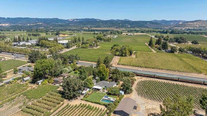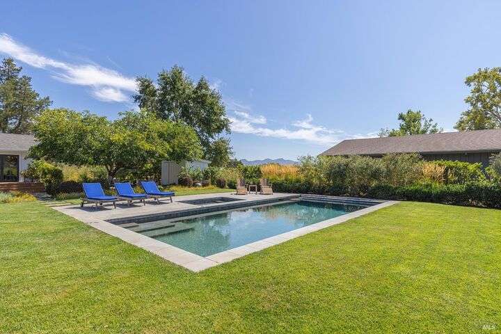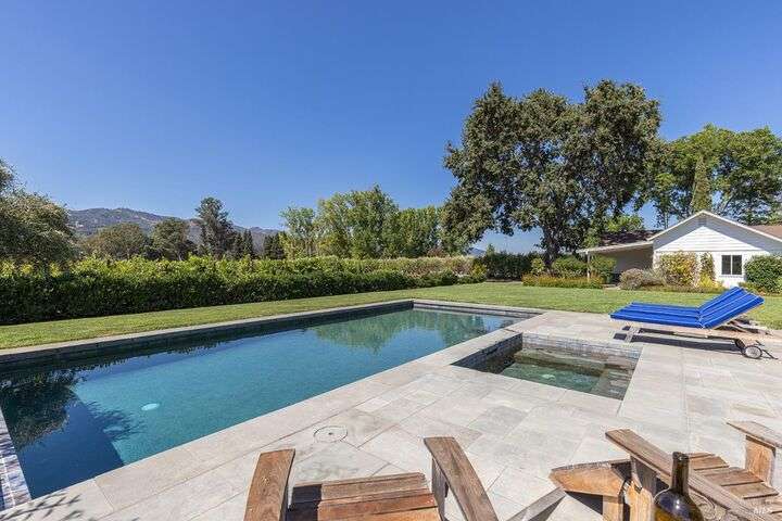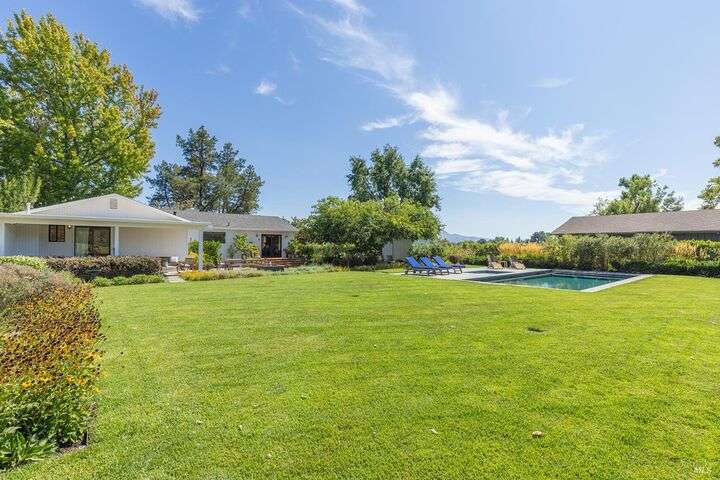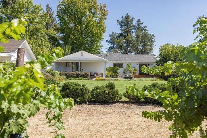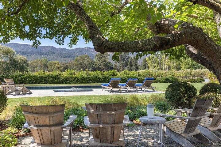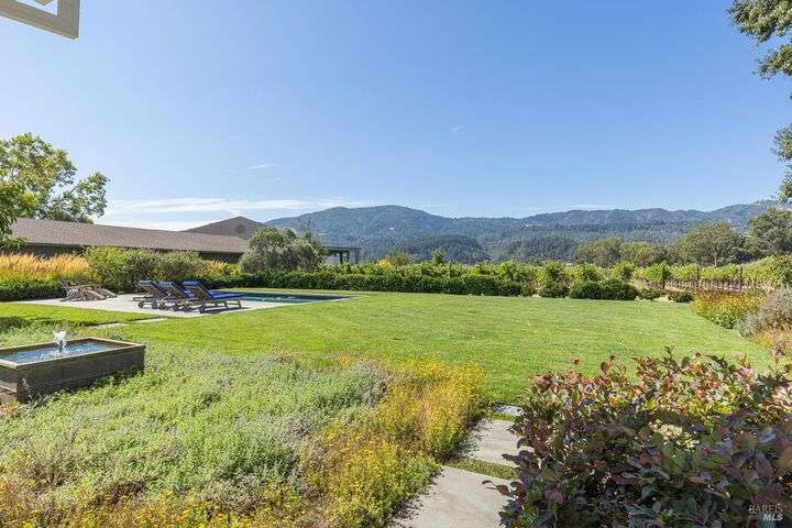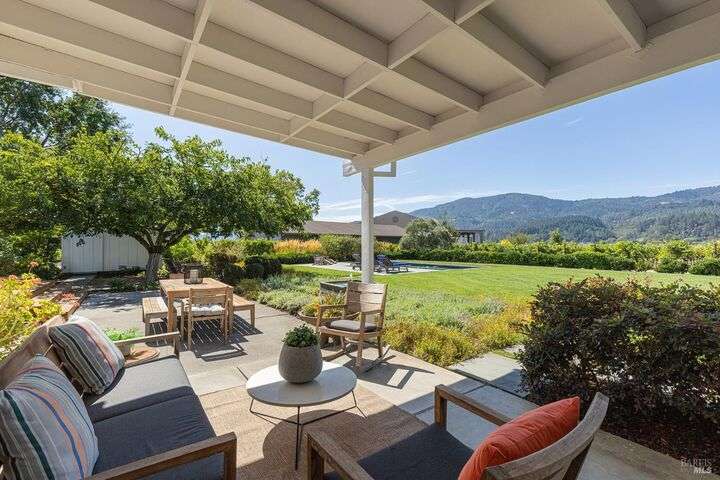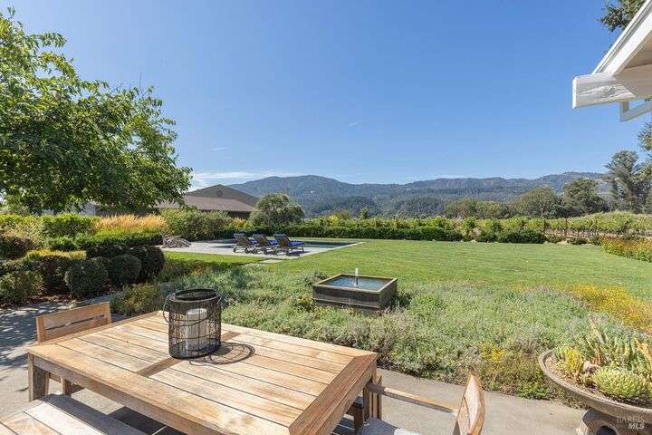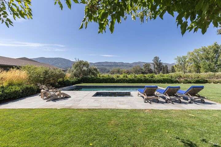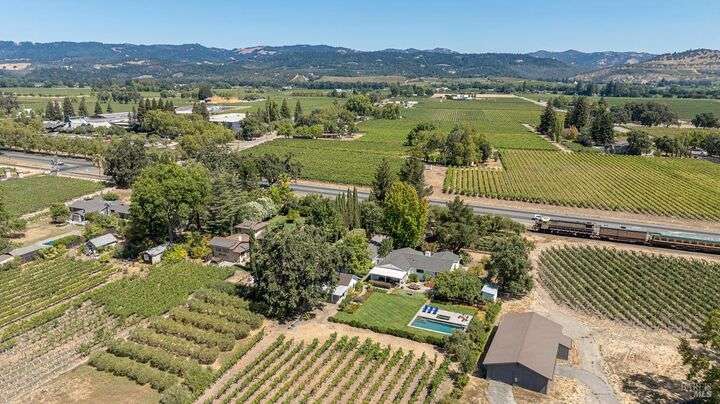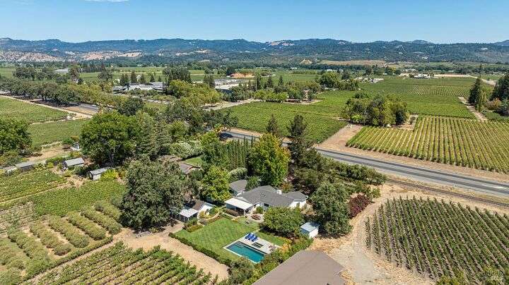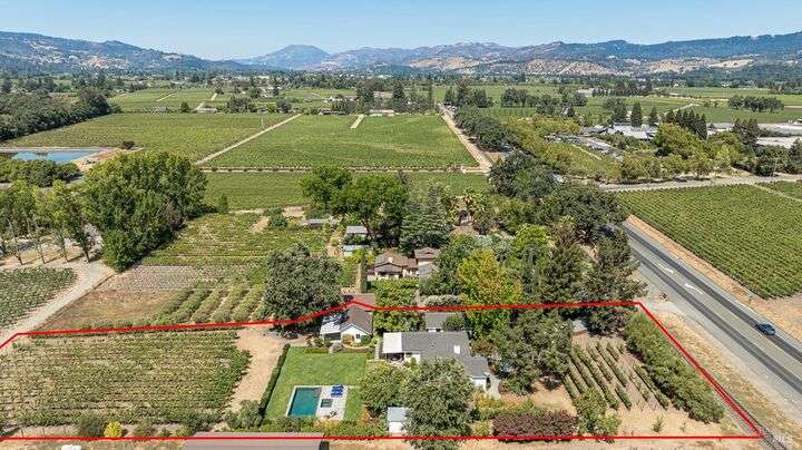 Vineyard views and wine country living at your own enchanting retreat on the Napa Valley floor! This very private oasis boasts of light-filled interiors, inviting outdoor spaces, a verdant lawn, fruit trees, and a sparkling swimming pool with spa...all overlooking acres and acres of grape vines and the majestic Mayacamas Mountain Range, which define the geography and vistas of Up Valley Napa. Approximately 2/3 of an acre planted to Cabernet Sauvignon, yielding about 2 tons of grapes annually. All of this incredible escape is minutes from Napa Valley's finest dining, a short hop north to Saint Helena, a bit further to Calistoga, and south through Rutherford to Yountville and the city of Napa.