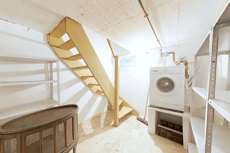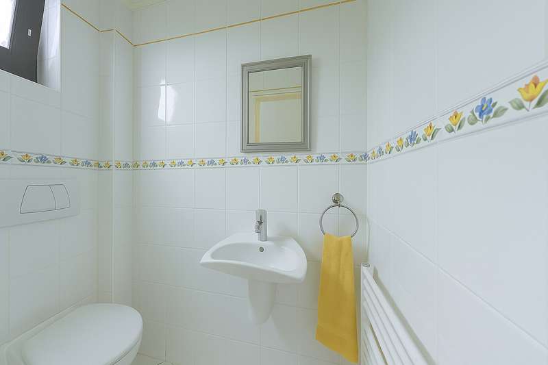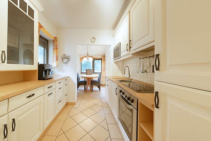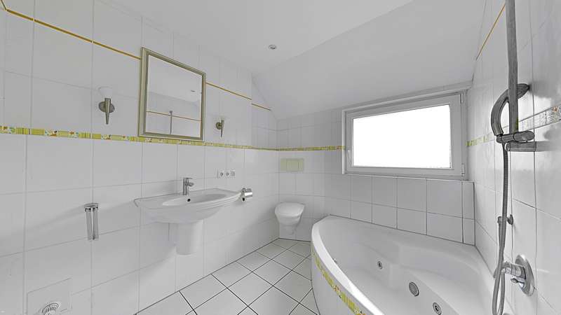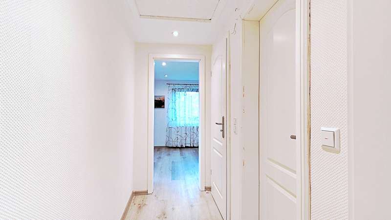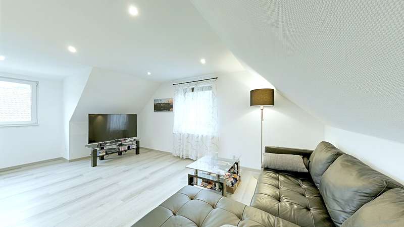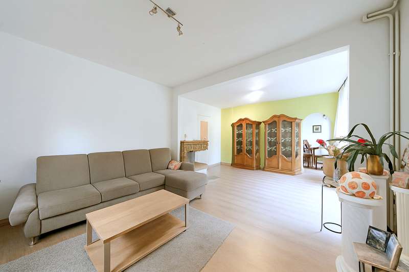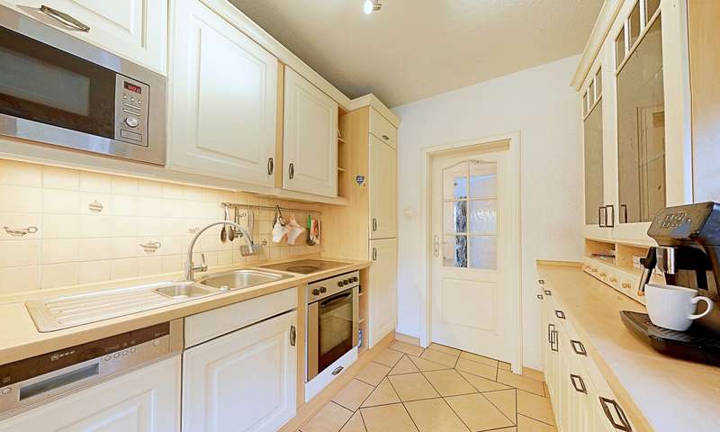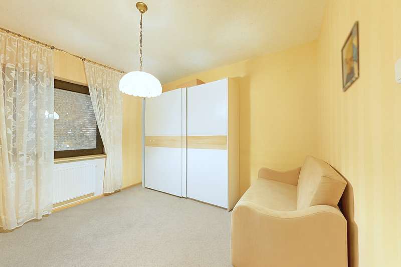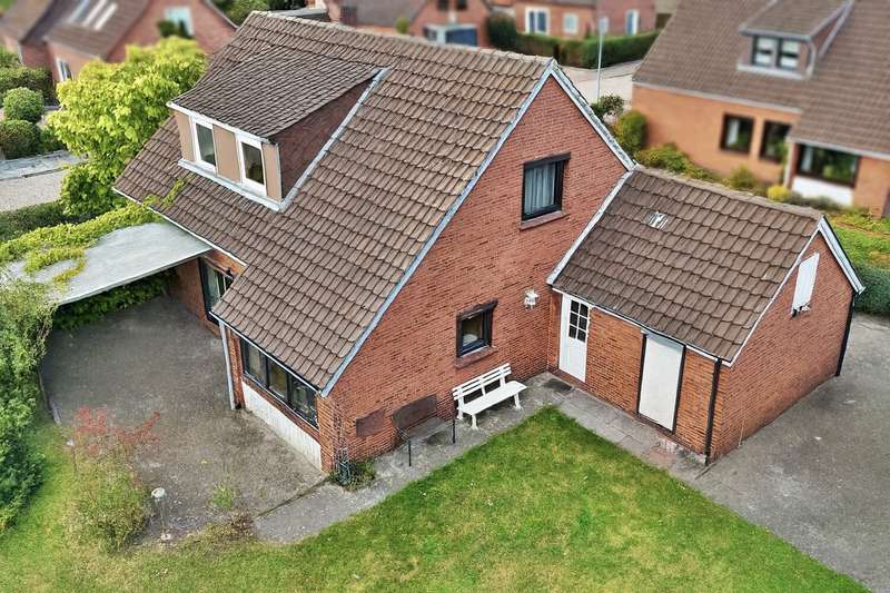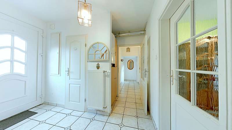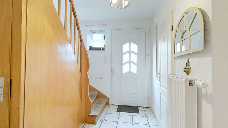 This detached single-family home from 1958 presents itself in a solid solid construction and impresses with its successful room layout and versatile usage options. With a living space of approx. 151 m² spread over two floors, the property offers enough space for families, multi-generational households or a combination of living and working. The well thought-out layout of the rooms allows for both classic living concepts and the creation of a separate granny apartment on the upper floor. The large garden with a well-kept wooden tool shed and the solid double garage round off the attractive overall package. You enter the entrance area, from which an easily accessible wooden staircase connects both floors. To the left is the white-tiled guest WC with window ventilation. A few steps further you reach the lower hallway, which provides access to all rooms on this level. The spacious living room with open fireplace and direct access to the garden forms the heart of the house. Here you can spend happy hours with family and friends or simply relax at the end of the day. The kitchen can be accessed from both the hallway and the living room. Equipped with an inviting breakfast nook and a neat fitted kitchen, it offers a functional solution that harmoniously integrates the dining area into everyday living. The space is complemented by a brightly tiled bathroom with a bathtub and natural light. Here you will find the potential to create your own oasis of well-being. Two further rooms can be used flexibly as bedrooms, children's rooms, offices or hobby areas. The upper floor opens up a wide range of possibilities and can be used as an independent granny apartment if required. Here you will find a living room with a semi-open kitchen, a bedroom and a modern shower room. The eat-in kitchen is equipped with a modern fitted kitchen and combines practical cooking with a pleasantly designed living area. The brightly tiled shower room impresses with a skylight that provides natural light and good ventilation, as well as its own washing machine connection. The additional bedroom offers a retreat and turns the floor into an independent living unit. This area is ideal for adult children, guests or for renting out - and provides additional privacy. The building services include central heating from 2000, which has been regularly serviced and maintained. The windows were replaced with double-glazed plastic elements back in 1982 and also fitted with practical external blinds. The floor coverings are predominantly low-maintenance tiles and laminate, which ensure a functional yet attractive living atmosphere.