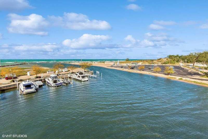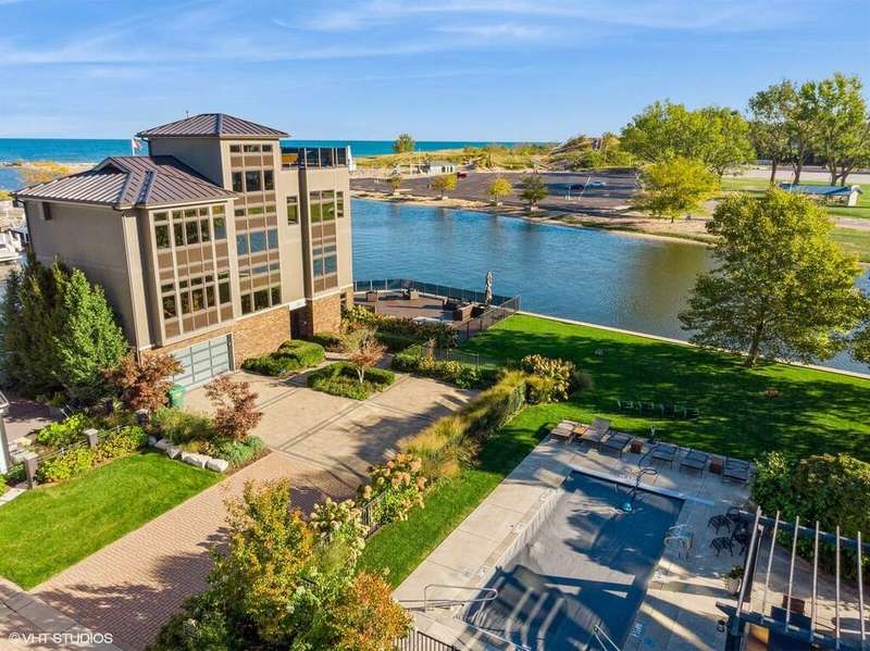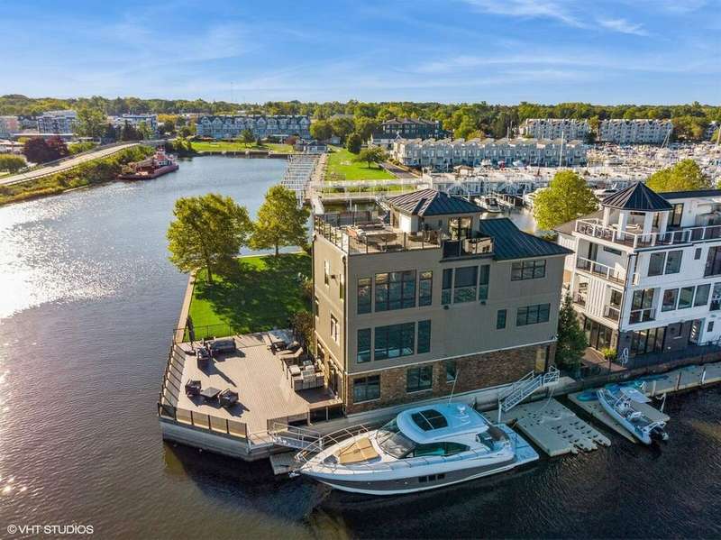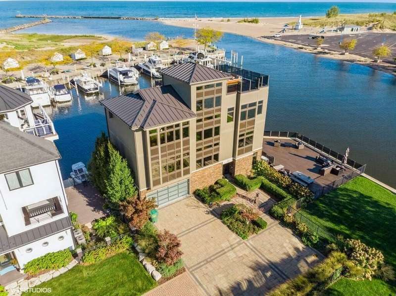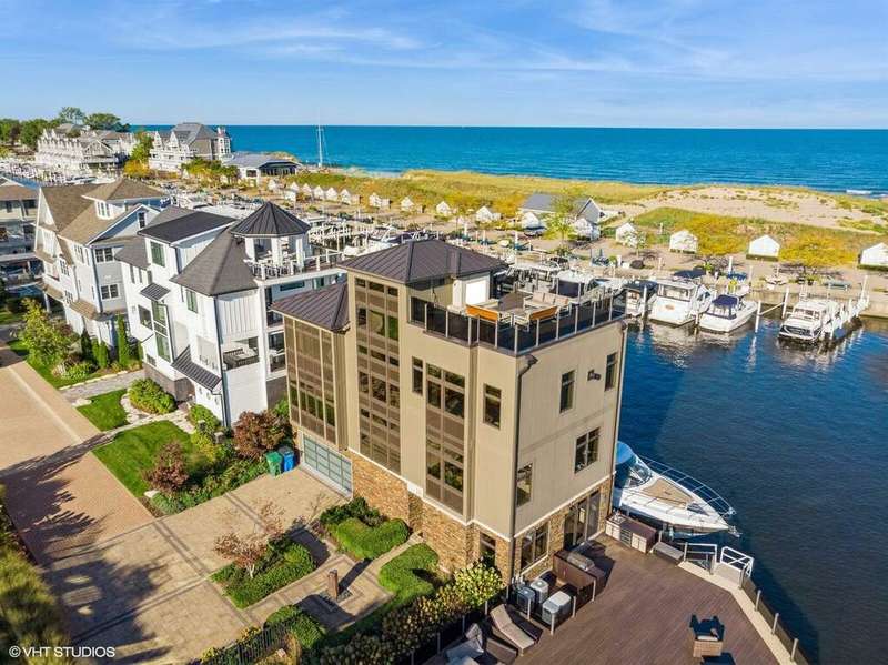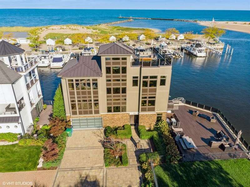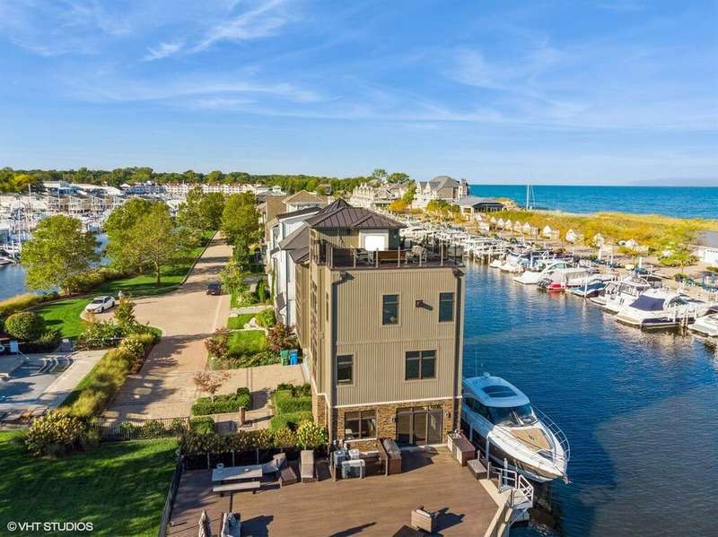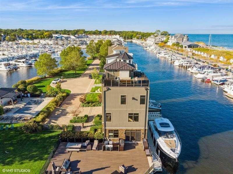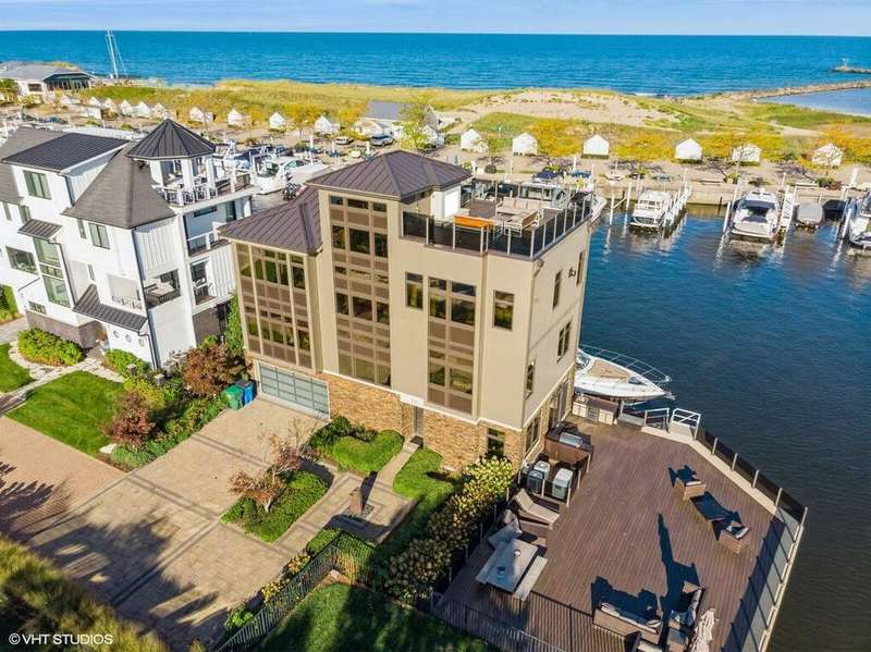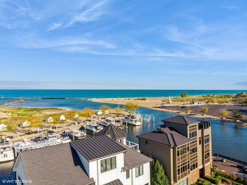 The Show Stopper: Now available, this unique contemporary mansion located at the penultimate location. Your private and exclusive peninsula at the intersection of Lake Michigan, the Michigan Yacht Club, New Buffalo Harbor, and the Galien River. Dock your yacht and wave runners right next to your party pad. This home spans four levels, with panoramic and breathtaking views. A glass elevator adds style and convenience. The third floor, featuring a state-of-the-art kitchen and spacious living area, is perfect for year-round entertaining. The infinity deck is a host's dream, the ideal backdrop for any event. Stroll to fine dining and end your evening on the rooftop deck, enjoying a fire and unparalleled views of Lake Michigan sunsets.
