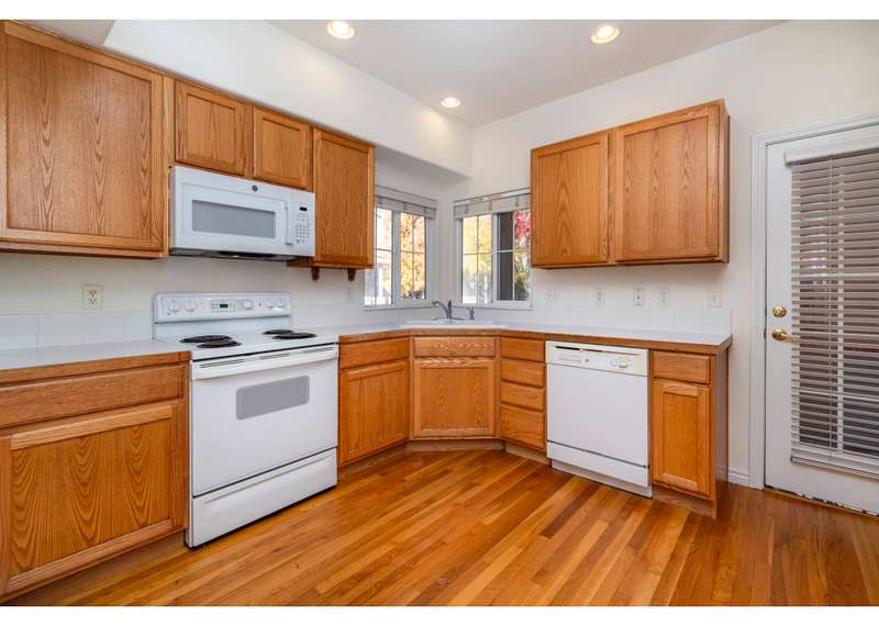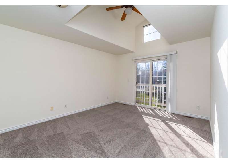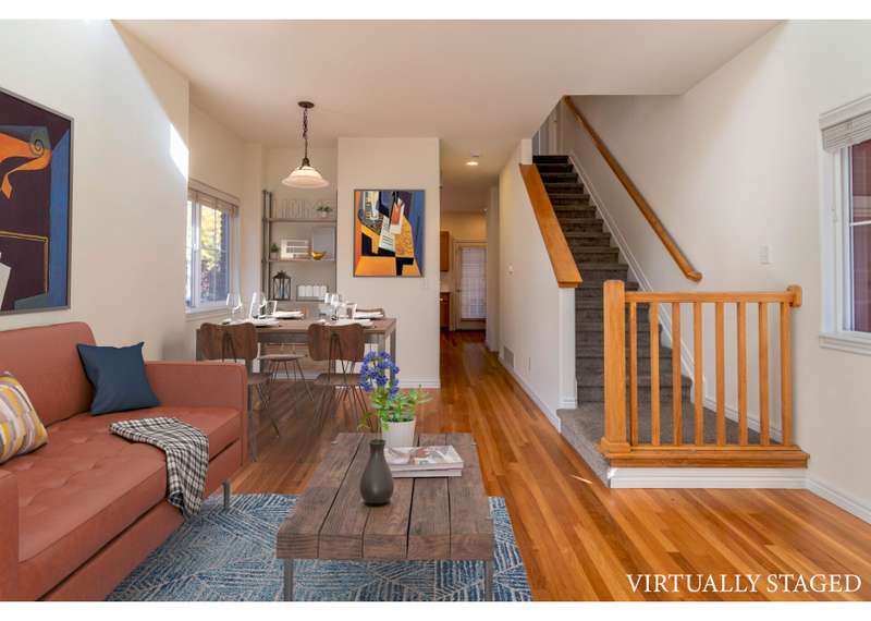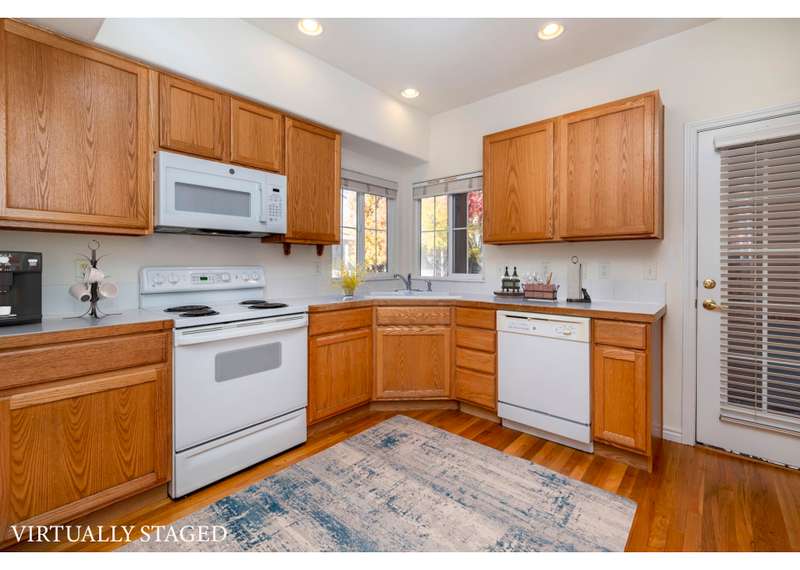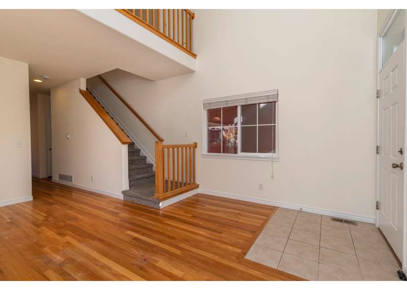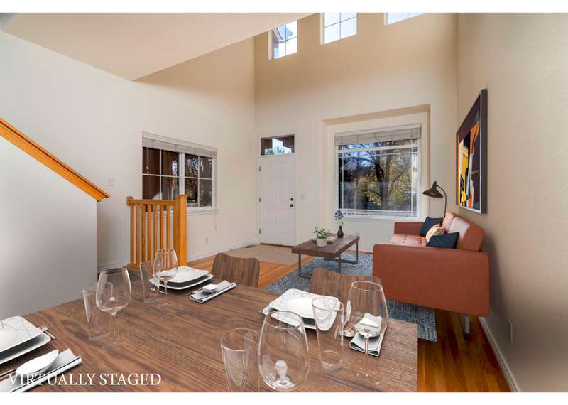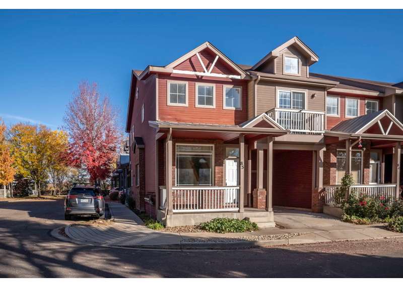 Charming three-bedroom townhome in a sweet location! South facing end unit flooded with natural light. Home is situated on a very quiet interior street, with only 1 shared wall! Enjoy looking out over the HOA green space from your covered front porch. New carpet, fresh paint, wood floors on the main level and dramatic vaulted ceilings. Primary bedroom with private bath, walk-in closet, and large south facing windows. Sunny laundry room on the upper level. One-car attached garage. NOT in a metro tax district!