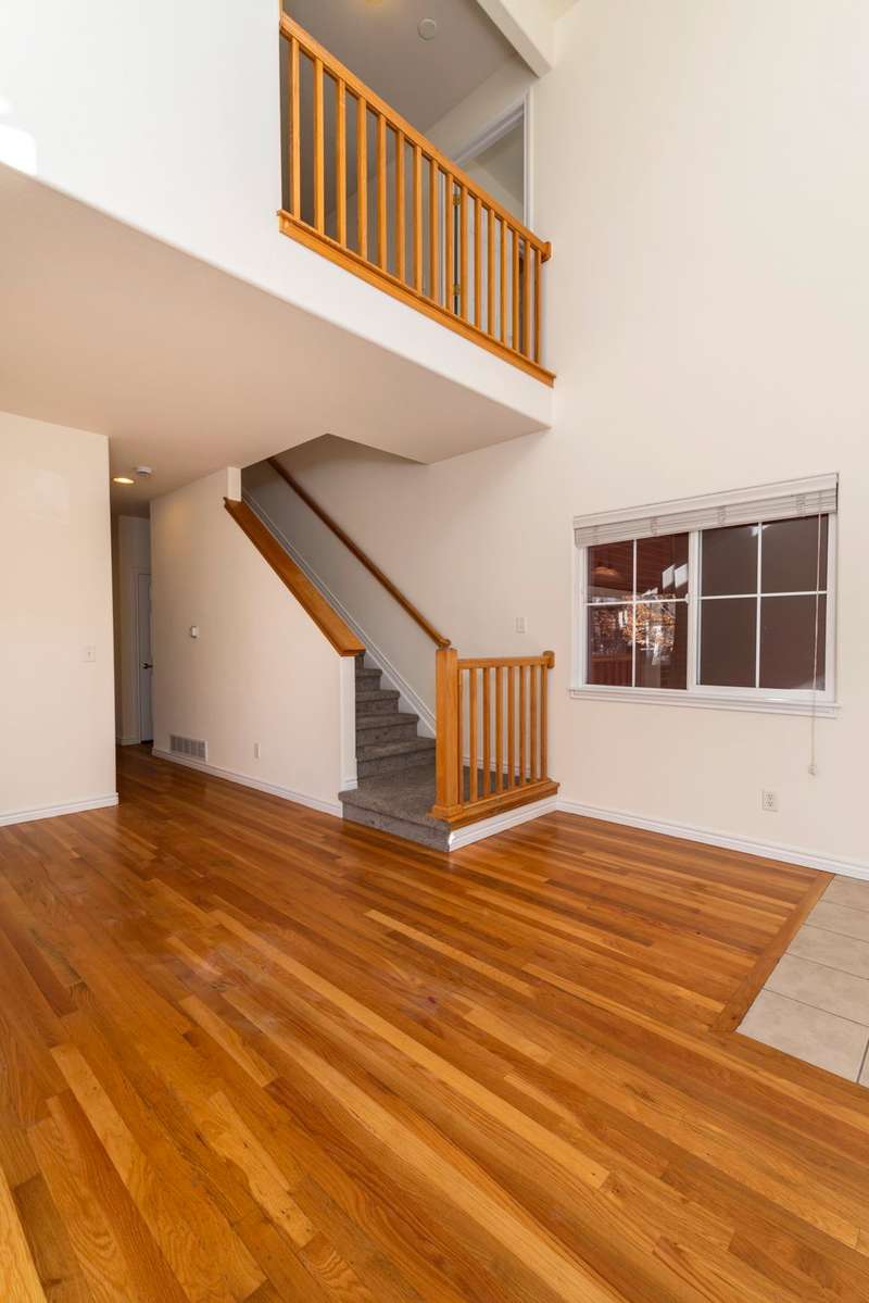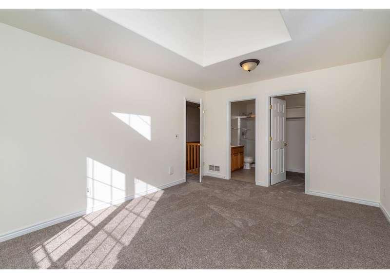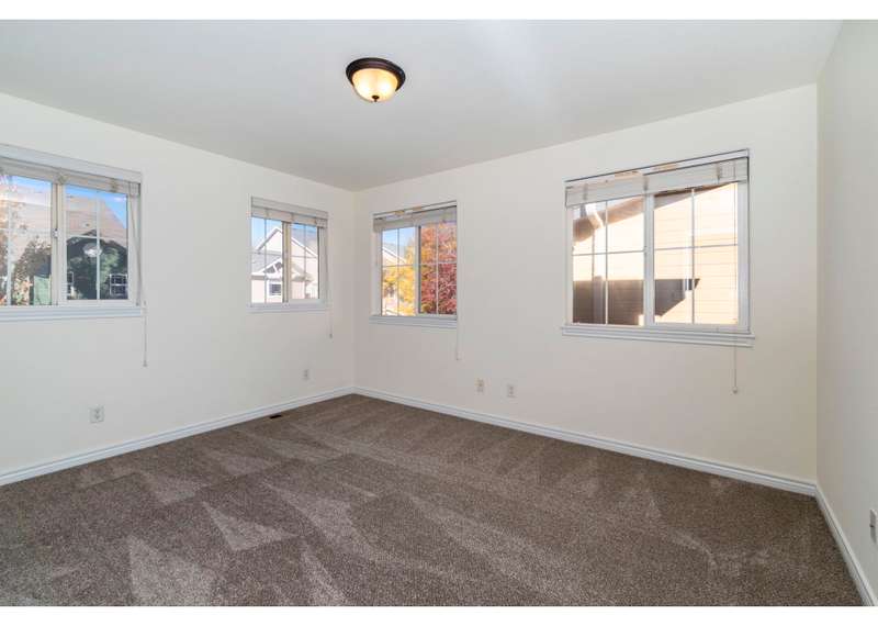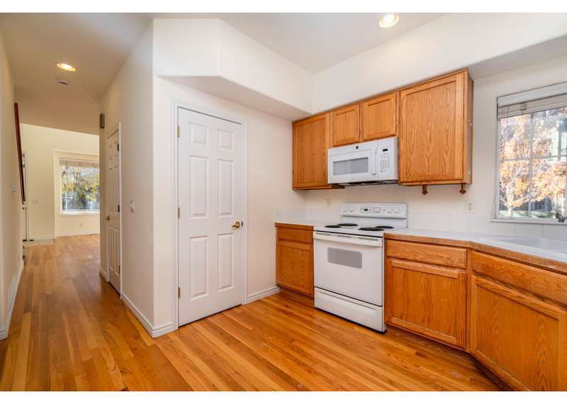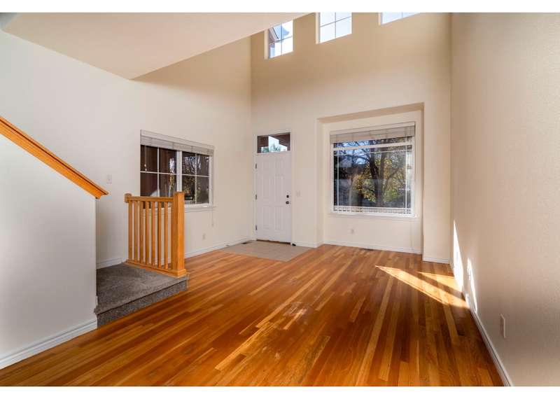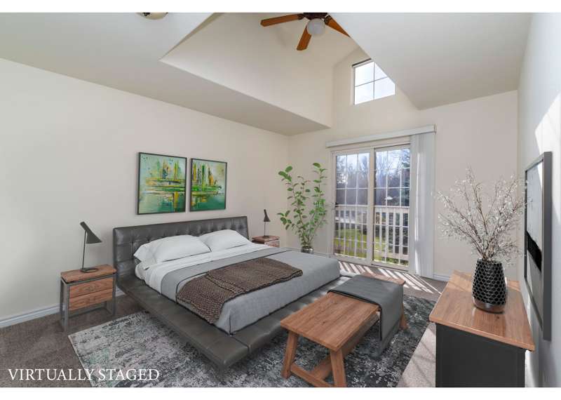 Charming three-bedroom townhome in a sweet location! South facing end unit flooded with natural light. Home is situated on a very quiet interior street, with only 1 shared wall! Enjoy looking out over the HOA green space from your covered front porch. New carpet, fresh paint, wood floors on the main level and dramatic vaulted ceilings. Primary bedroom with private bath, walk-in closet, and large south facing windows. Sunny laundry room on the upper level. One-car attached garage. NOT in a metro tax district!