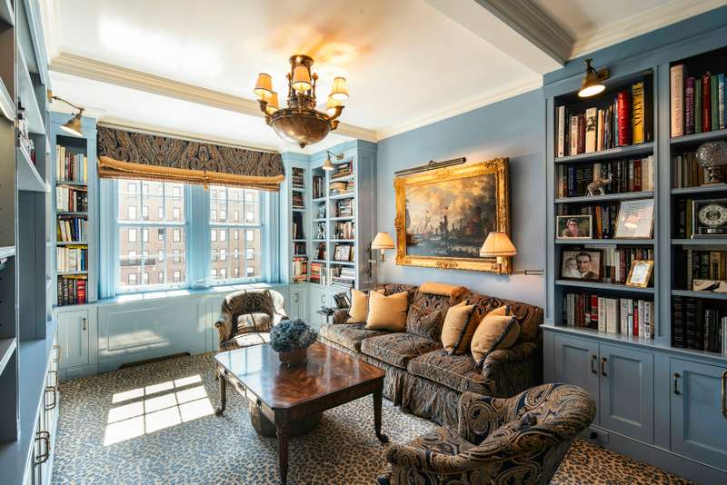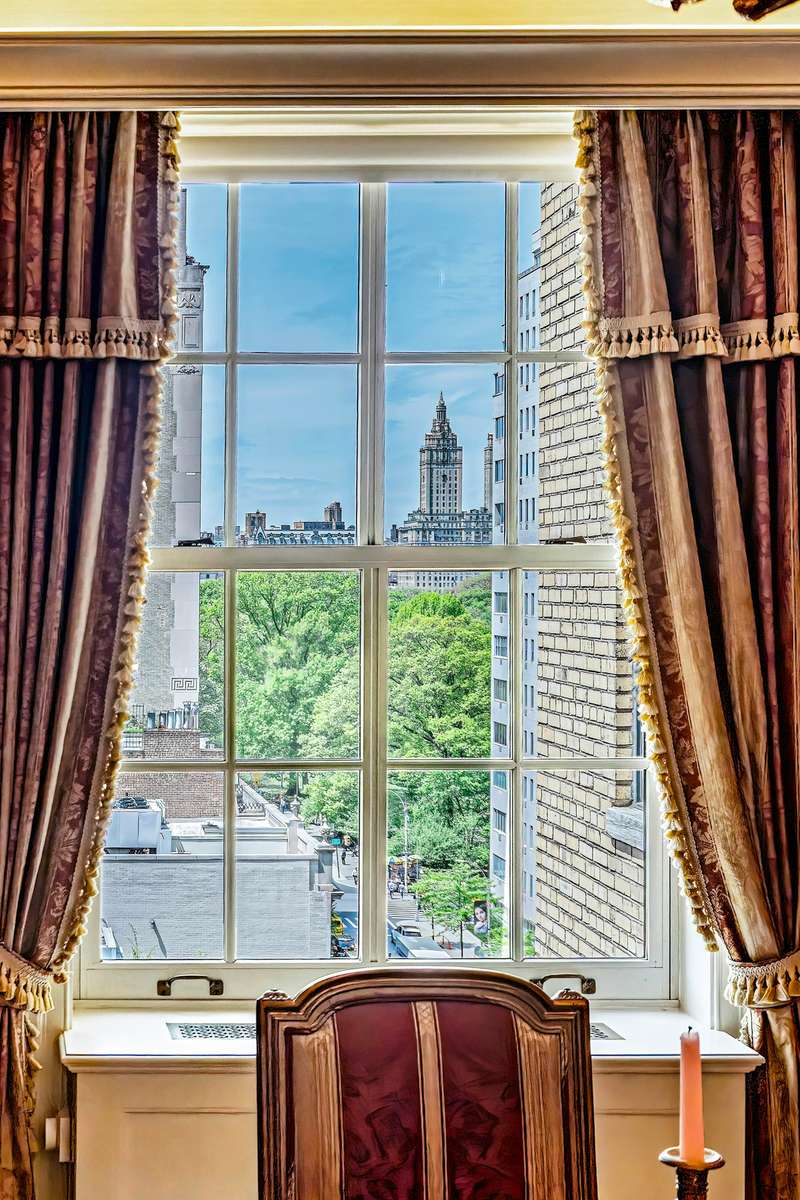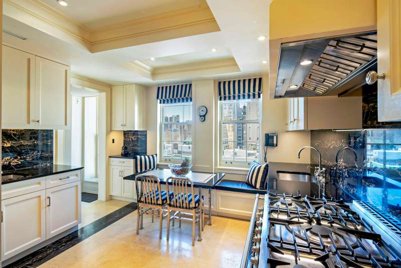 The stunning 22 x 10 entrance gallery leads to an impressive 60 foot enfilade of entertaining space which includes an exceptionally grand living room with a wood burning fireplace and an adjacent triple-exposure library with captivating views of Central Park in the distance. The formal dining room also faces west and has views of Central Park. The adjacent oversized chef's eat-in-kitchen has been fully renovated with top-of- the-line appliances and is flooded with natural light throughout the day. A large table can seat as many as six. It too faces west and captures Central Park views in the distance.