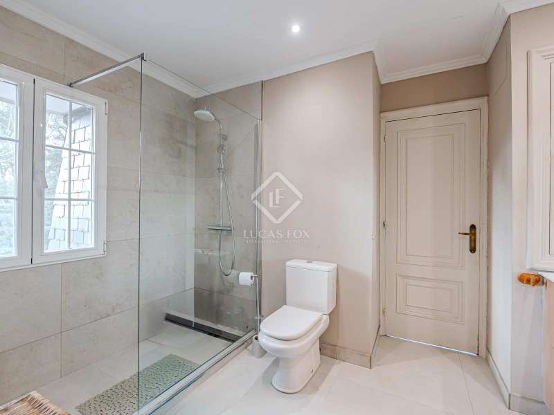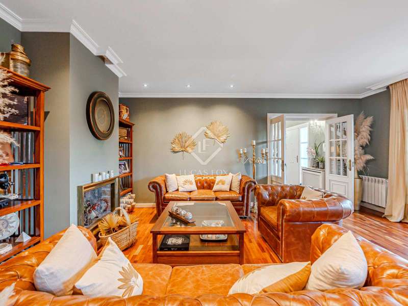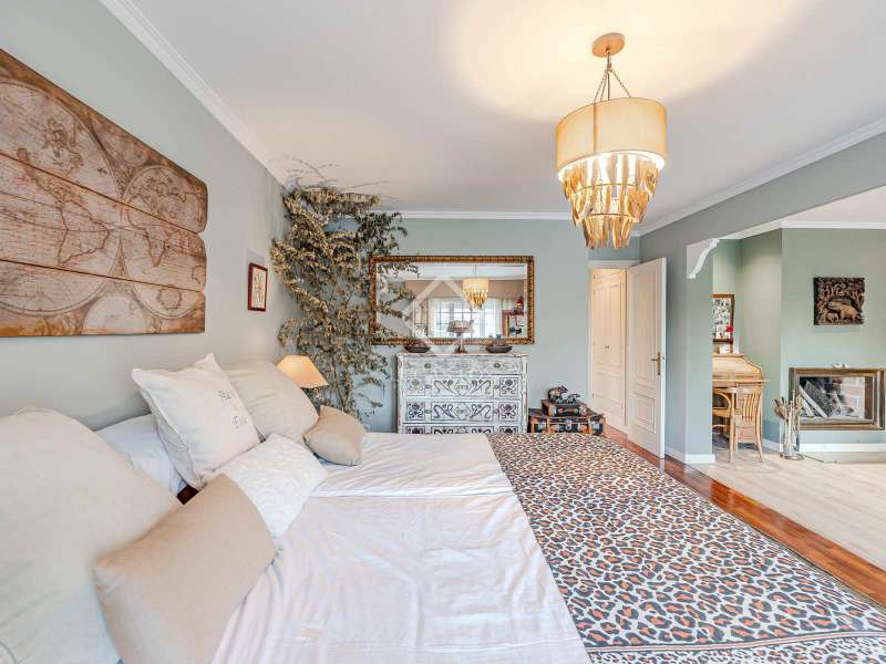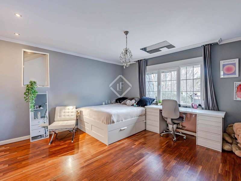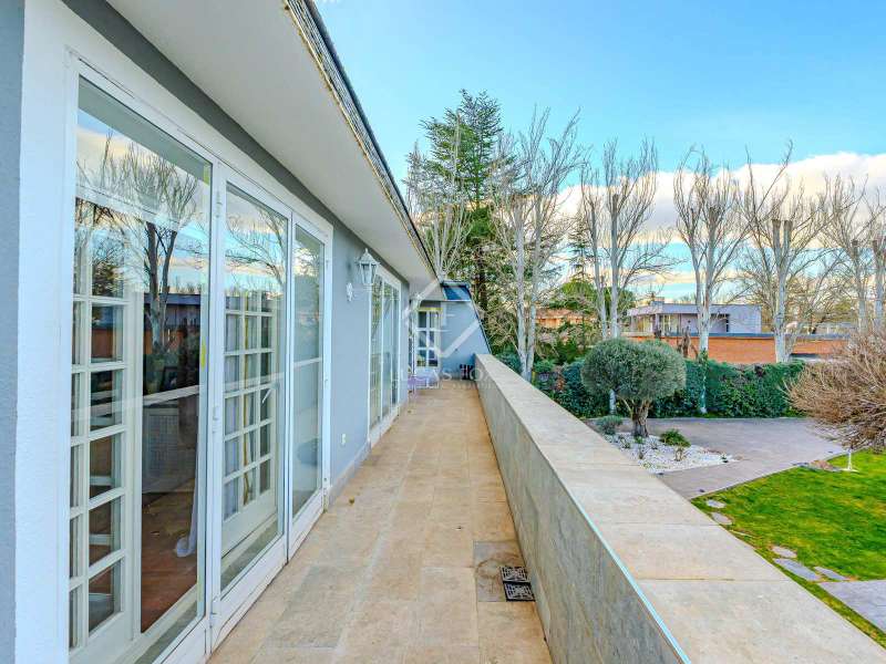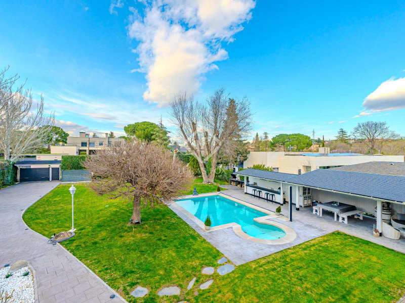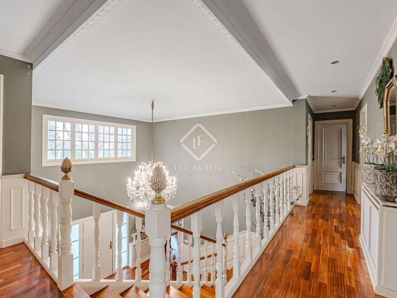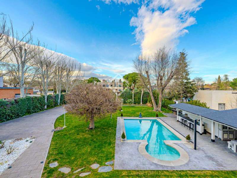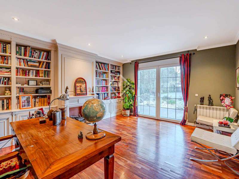 Lucas Fox Las Rozas presents in the heart of Villafranca del Castillo this spectacular independent villa with a classic European style and a marked identity that makes it truly special and unique. In its 631 m² built on a flat plot of 1603 m², it has 5 double bedrooms, 3 living rooms with fireplace, study library, leisure living room with pool table, sports area with gym, sauna and hammam, and a beautiful garden with a water pool. salty The charming villa is located just 10 minutes by car from Moncloa and with quick access to the A6. Villafranca is a residential area of independent villas, in a private development with 24-hour security. The property offers an excellent layout over 2 floors, and is completely renovated with a high level of finishes and materials. On the main floor , we are greeted with an elegant hall with a huge Murano glass chandelier, and a wide and majestic wooden staircase. The large dining room living room and a large study library with spectacular views of the front garden are distributed on both sides. Connected directly to the dining room from the living room, the kitchen is integrated with a very cozy office and access to the rear garden . On this ground floor, we also find a games living room with billiards and fireplace, as well as a bedroom, a full bathroom and a guest toilet. On the first floor we find a large hall that gives access to four double bedrooms. The main bedroom suite is a spectacle in terms of privacy and dimensions, as it has a bedroom with a King Size bed, a beautiful living room with a fireplace, a large bathroom with a bathtub and shower, and is connected to two completely independent dressing rooms. This bedroom has access to a private and discreet terrace that offers unique views of the garden. Two other double bedrooms are connected to each other by a large and complete bathroom and the fourth bedroom has a third complete bathroom next to it. The property has wide stairs and huge windows that give a lot of clarity and spaciousness to the environment. The large windows are of top quality: double climalit glass with air chamber and thermal break. Exterior, next to the pool, there is a barbecue area, a complete bathroom with a dressing room to serve this area and a pleasant covered gallery or porch, as a picnic area, which creates a perfect chill-out and rest area. in various environments. In the back garden of the property we can find the sports area, with a gym, putting green, games area, Finnish sauna, hammam and jacuzzi. Likewise, it has 12 solar panels that give it daytime energy autonomy, LPG heating (liquefied gas in radiators), air conditioning and interior and perimeter alarm. It has a large closed garage for 2 cars with direct access to the property, a covered garage for 2 more cars with electric charging stations and a large area in the garden where guests' vehicles can be parked. This house is ideal for demanding people who want to live in a unique villa with a special and discreet atmosphere, surrounded by nature and at the same time, with a high quality of life very close to the centre of Madrid, surrounded by natural green spaces and wonderful views. . Contact us to organize a visit. You can also visit us at our Lucas Fox Property Lounge, Las Rozas, at 8 Camilo José Cela Street, so we can discuss your requirements in more detail.