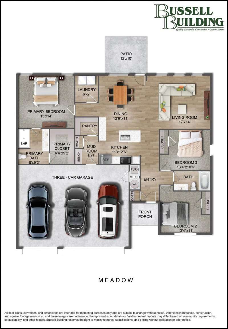 Discover the Meadow - a beautifully crafted home that offers a perfect blend of modern design and comfortable living. With just under 1,700 sq. ft. of well-thought-out space, this home is designed to suit a variety of lifestyles. The living room, featuring a cozy fireplace, is the heart of the home and flows effortlessly into the kitchen, making it an ideal space for entertaining or simply enjoying a quiet night in.The master suite is a true retreat, boasting a spacious shower and a walk-in closet that offers ample storage. The other bedrooms are generously sized, perfect for family members or guests. High ceilings throughout give the home an airy, open feel, while details like the tray ceiling in the master bedroom add a touch of elegance.Practical features include a three-car garage and a conveniently located laundry room, ensuring that everything you need is right at your fingertips. Step outside to the patio, where you can enjoy the outdoors in comfort, whether you're hosting a summer BBQ or just relaxing with a book.*Photos may be of a similar home*