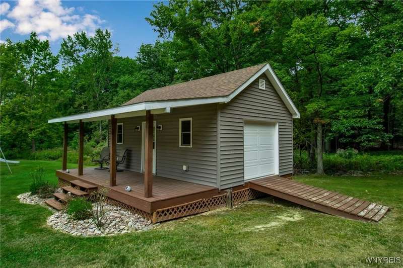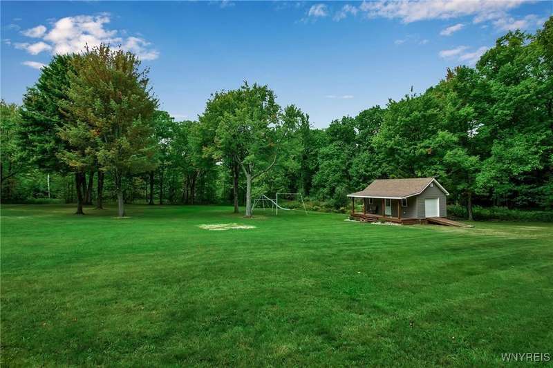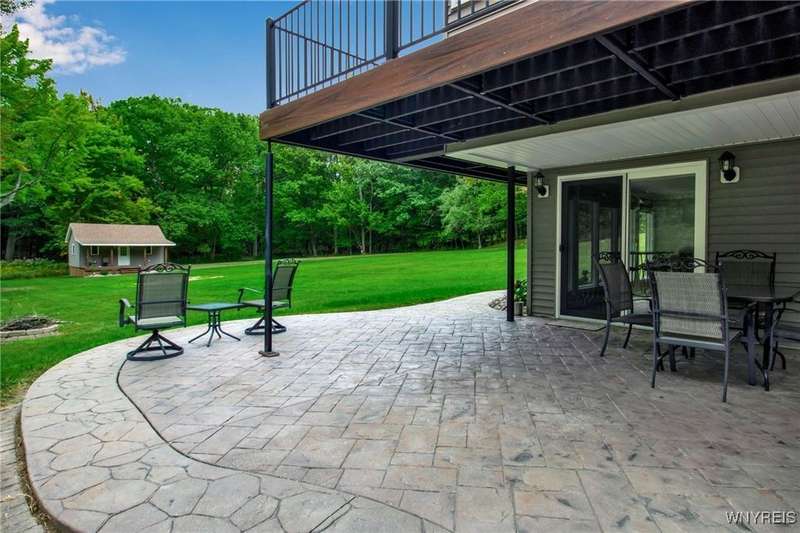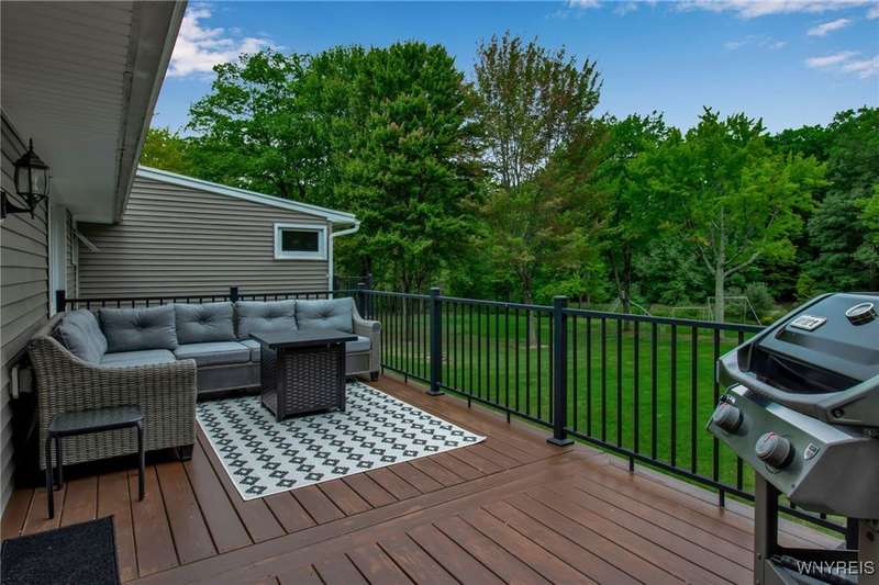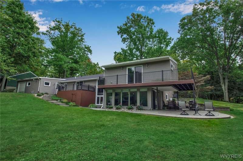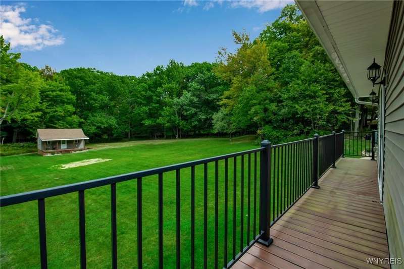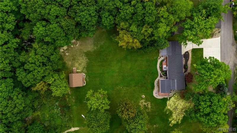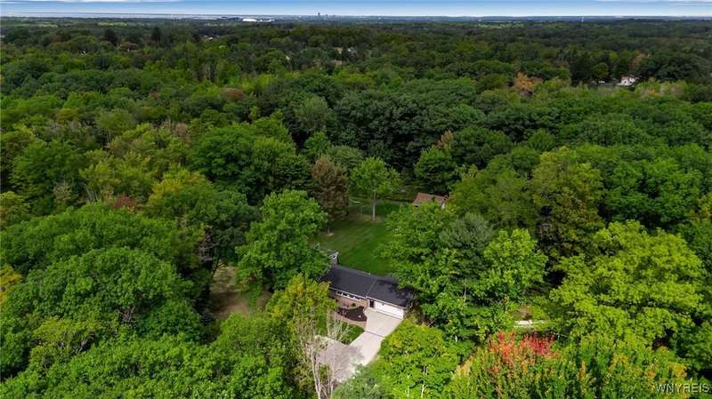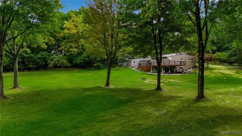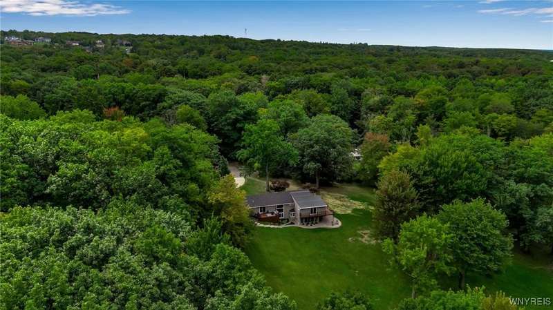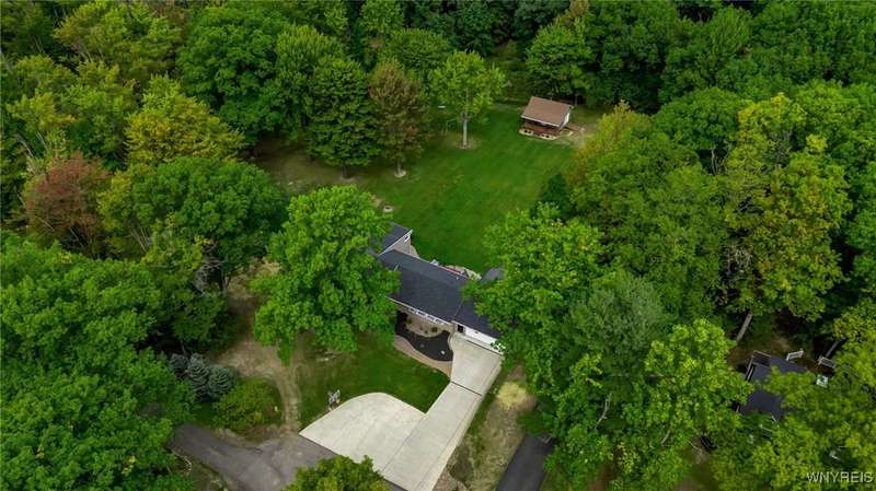 This home is as unique as it is beautiful! It's full of surprises, each one better than the last. You simply must see it to believe it! Privately set on a sprawling 2.7 tree-lined acreage at the end of a dead-end road, it offers a rare combination of peaceful seclusion and everyday convenience, just minutes from Route 219 and the village of Orchard Park.Step inside and you're greeted by a bright, welcoming main level filled with natural light from large windows and sliding glass doors. The layout includes three comfortable bedrooms and two full baths, plus a spacious eat-in kitchen, with newer appliances, that opens to a charming deck?perfect for morning coffee or evening meals. The primary bedroom boasts a private porch as well, offering an ideal place to unwind and take in the views.Downstairs, the fully finished lower level has been thoughtfully designed as a complete in-law suite, with its own entrance, bedroom, full bath, and generous living space. On the lower level, you'll find two gas fireplaces that add warmth and character, and a third set of sliding doors that open to a covered patio?ideal for guests, BBQ, or simply spreading out.Additional features include central air conditioning, first-floor laundry, plus a second laundry area on the lower level. You'll also find an oversized 4-car attached garage with electric, water, and heater, as well as a versatile shed equipped with water, electric, and a garage door opener?ideal for a workshop, studio, or extra storage. There are a multitude of updates throughout including newer roof, water purifier, leaf gutters and more!From the natural light throughout to the private wooded setting, this is a home that truly has it all.Delayed negotiations begin 9/29 at 3 PM.