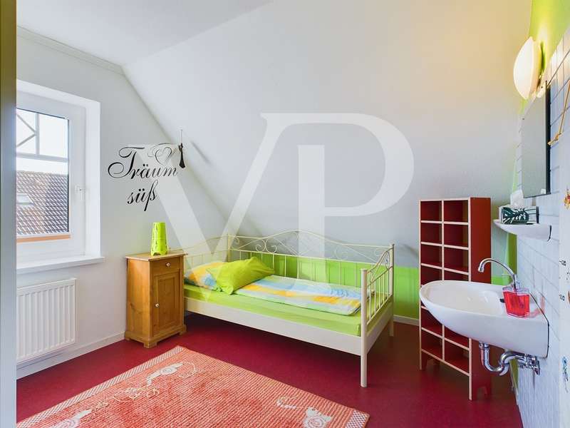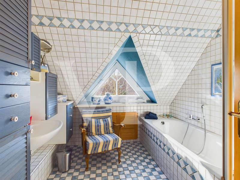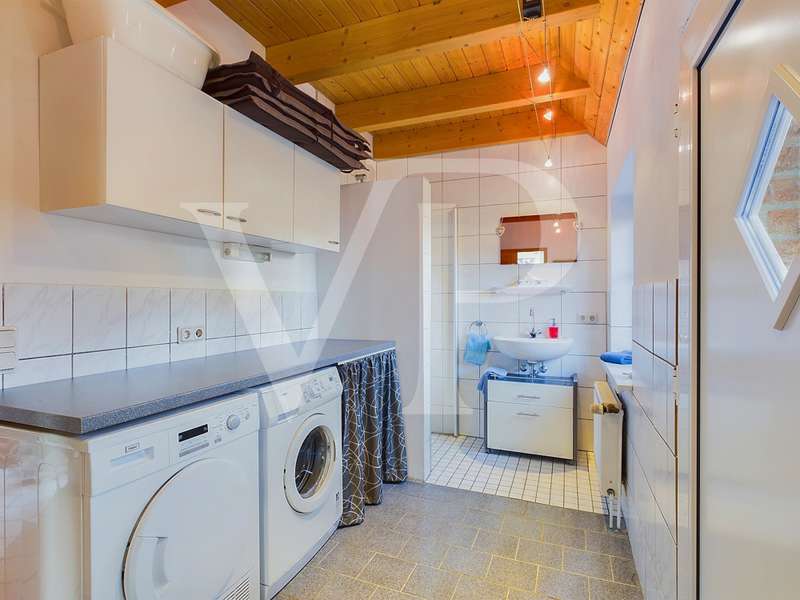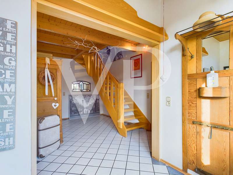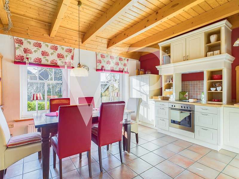 This well-kept detached house in Frisian style was built in 1994 with a living space of approx. 125 m². In an idyllic location, surrounded by a beautifully landscaped garden, you will find a plot of approx. 713 m². The entrance area leads into the spacious hallway, from which all rooms on the first floor are accessible. The house has a total of four rooms, including three bedrooms and a large living room. A stylish design and many small special details create an appealing ambience. The living room offers plenty of space for cozy evenings in front of the fireplace. Floor-to-ceiling windows allow plenty of natural light into the room and lead directly onto the sunny terrace, which is ideal for relaxing and sunbathing. The adjoining terrace area, which is covered and enclosed by a roundel, allows you to enjoy the fresh North Sea air in all weather conditions. The high-quality kitchen is generously proportioned and has plenty of storage space. An integrated dining area extends the use of the kitchen. Here you will find some lovely design details, such as a small hatch into the living room. The first floor is usefully extended by a utility room with integrated shower and a separate WC. You can also reach a north-facing terrace via this part of the house, which offers you a pleasantly cool outdoor space on particularly hot days. You enter the attic via the curved solid wood staircase. Once upstairs, you will first find the master bedroom on your right. It extends across the entire gable end and offers space for a walk-in closet. The bathroom is equipped with a bathtub and a separate shower. Light-colored tiles and a small gable ensure a greater sense of space and brightness. The two bedrooms have a similar number of square meters and are ideal as children's rooms or offices. The lovingly landscaped garden is best accessed via the double doors in the living room. Here you first reach the sun terrace with a small adjoining pond. Curved paths lead you through the garden, along small flower beds and lovely seating areas, right up to a cute little bakehouse. Here you can spend relaxing hours outdoors and enjoy the peace and quiet. This garden is truly a highlight of the house, as it completes the dreamlike appearance. This property is a very well-maintained detached house in an idyllic location with stylish furnishings and East Frisian charm. The spacious garden and terraces offer many opportunities to enjoy nature and relax.