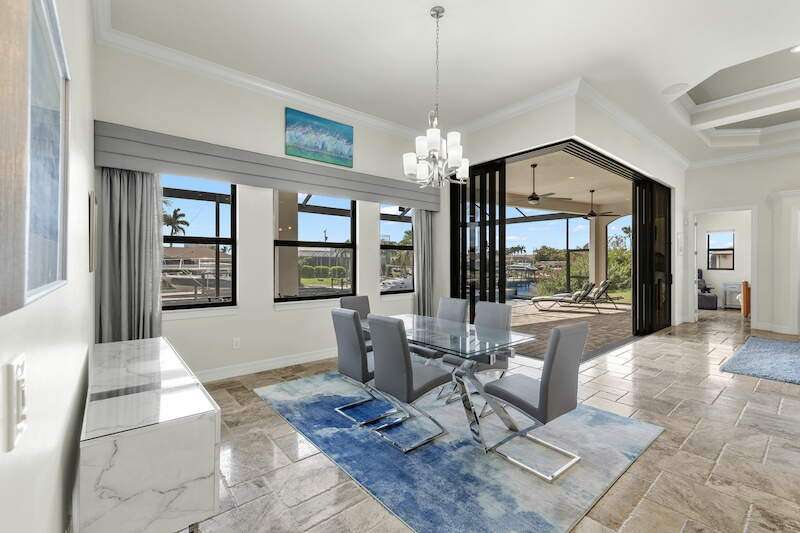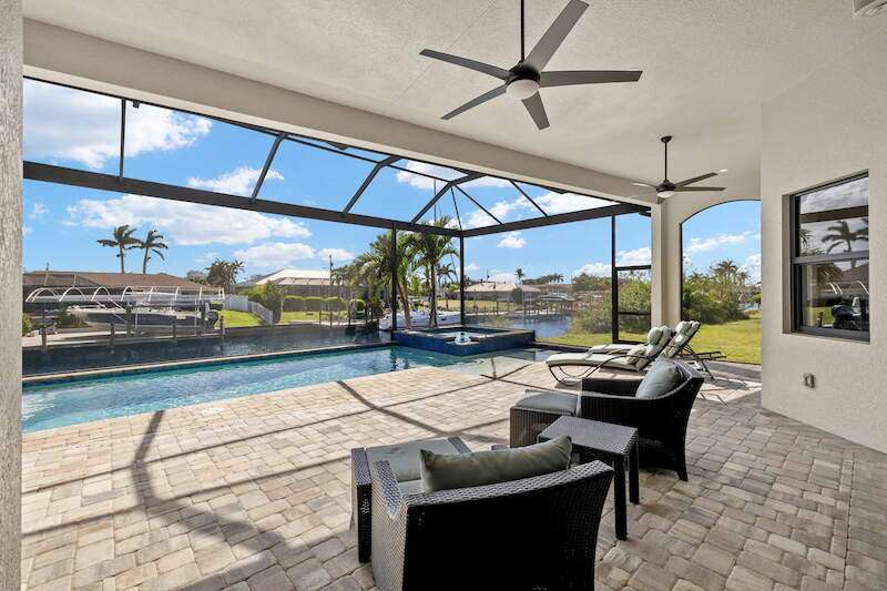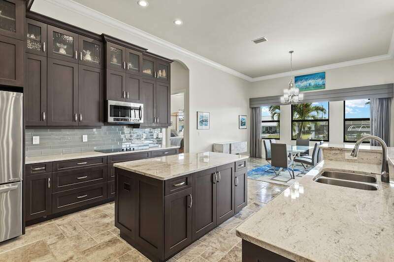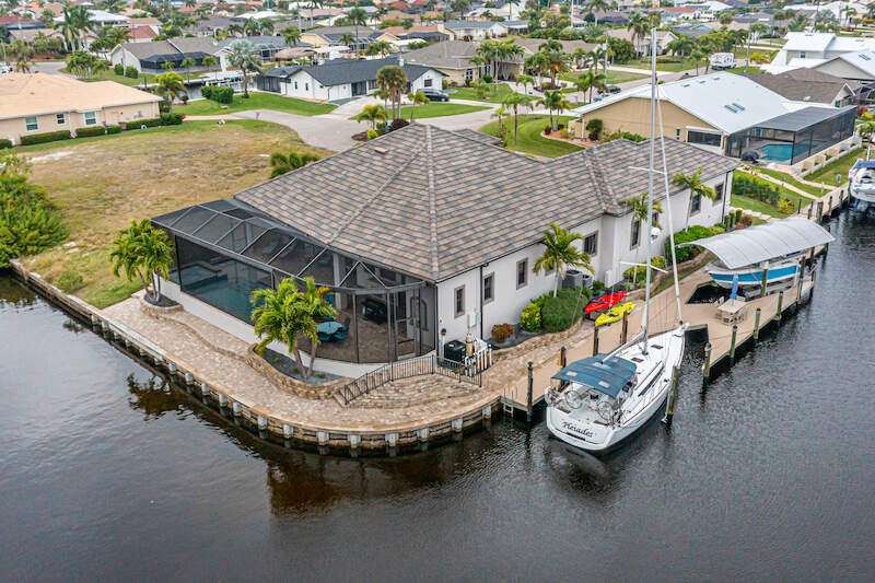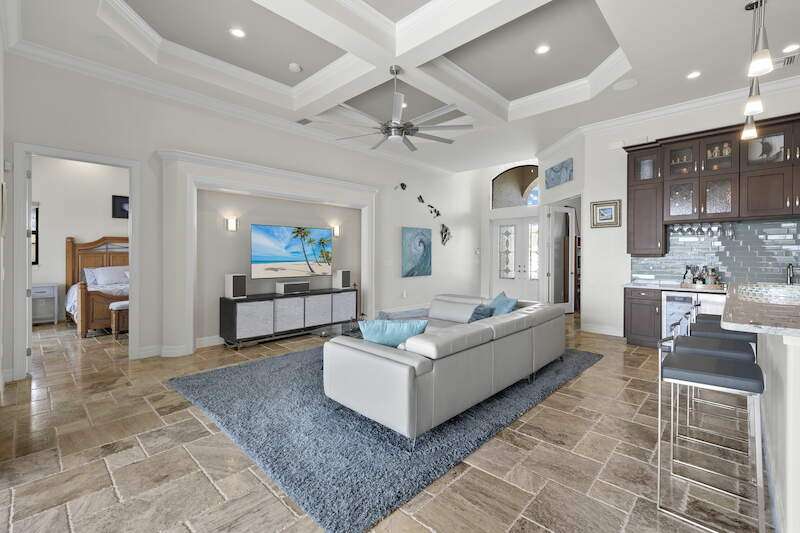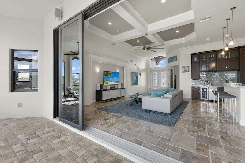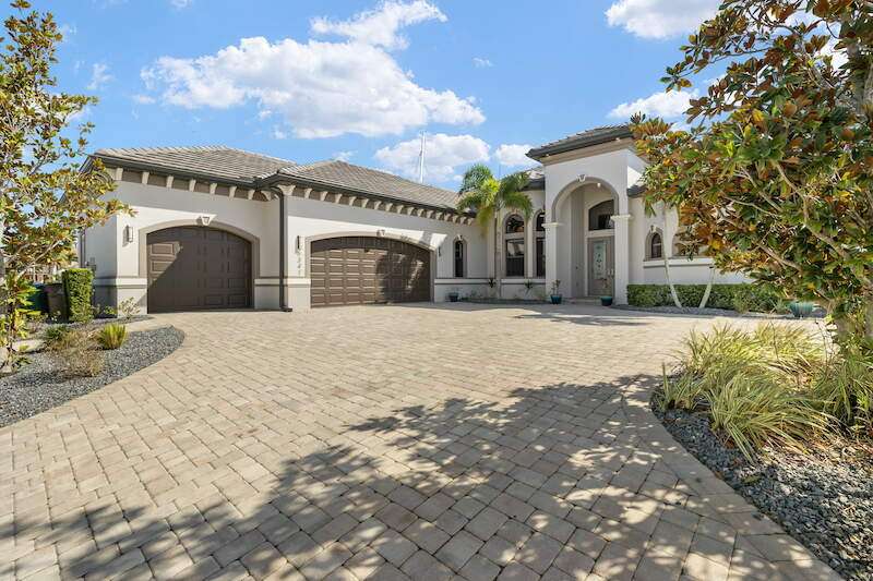 Introducing the exceptional Sinclair 2017 Builder's Showcase Home of the Year, a proud recipient of all nine awards in its category. This stunning custom-built Trinidad model boasts an impressive 12-foot ceiling height throughout, enhancing the sense of spaciousness and luxury. Set on a corner lot with 219 feet of seawall canal frontage, this residence is located on intersecting canals, providing direct access to the water without any bridges or locks. This prime location ensures unobstructed navigation, making it an ideal setting for boating enthusiasts. The gourmet kitchen features 11-foot handcrafted custom cabinets, two large islands with under-counter storage, and a two-level outer island equipped with a double sink and dishwasher. The raised bar top seats six and is complemented by a stylish wet bar with a new wine cooler and double oven. The primary bedroom is a luxurious retreat, featuring 8-foot sliders that open to the lanai, a coffered ceiling, dual walk-in closets by Design Closets, a walk-through shower, a six-foot soaking tub, and large dual vanities. The luxurious mother-in-law suite provides convenient access from both the garage and the main part of the house. This versatile space includes a living room and is equipped with kitchen cabinets, a countertop, sink, and refrigerator-ideal for independent living. The bedroom features a spacious walk-in closet, and the attached bathroom boasts a wide entry and a walk-in shower for ease of access. Key features of this home also include silver travertine flooring throughout, level 3 granite, a 17-foot ceiling in the entry study, two new AC units, and triple-pane, argon-filled hurricane windows and impact-resistant doors.The outdoor space is a breathtaking retreat, enhanced by expansive 90-degree, 10-foot sliding doors that create a seamless transition between indoor and outdoor living. The generously sized lanai was thoughtfully designed to minimize columns, offering unobstructed views of the tranquil canal. It features a luxurious custom saltwater pool, an eight-seat spa with stunning fire and waterfall elements, and elegant designer pavers that add sophistication. Additionally, the lanai includes a convenient food preparation countertop with a sink and bar refrigerator, along with an outdoor shower for ultimate relaxation and enjoyment.This award-winning home includes a slip for a large sailboat, a 44-foot, 12,000 lb Synergy boat lift, a 32-foot canopy, and a lower dock for kayaks. The spacious three-car garage features a dedicated workshop area, a second electric box for expansion, a generator hookup, and a Tesla EV charging station. Hurricane impact insulated garage doors enhance security. A pull-down ladder and Versa Lift System offer easy access to an additional 580 sq. ft. of attic space, accommodating up to 250 lb boxes.Arrange your exclusive showing of this exceptional dream home today-this opportunity won't last long!