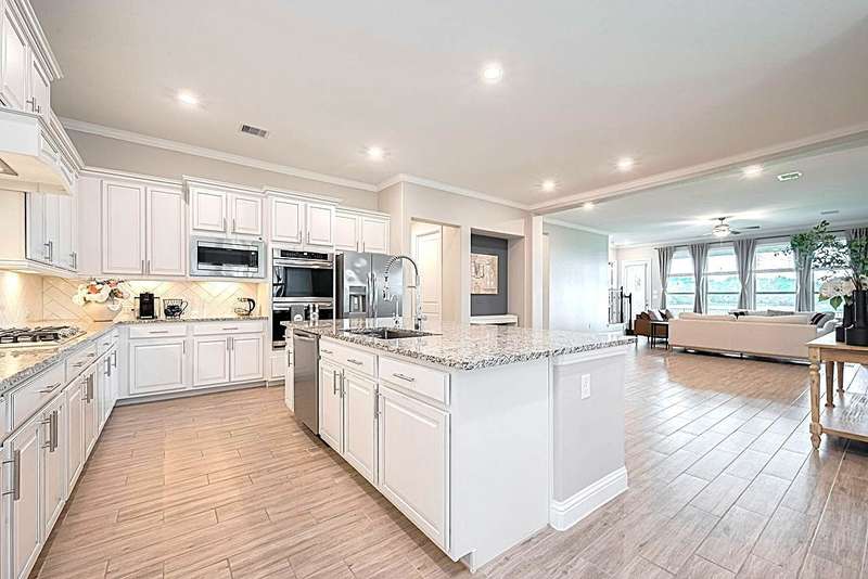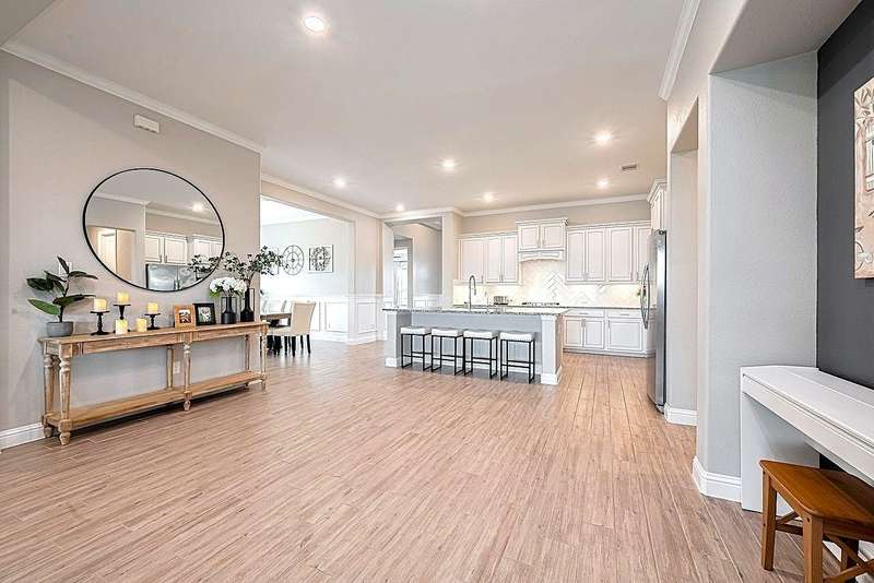 This one’s full of EXTRAS you don’t see every day! 5 BEDROOMS, 4 full baths, 3-car garage, LAKE VIEW!!! From the moment you walk in, you’ll notice the custom touches—tray ceilings, crown molding, accent walls, and a true chef’s kitchen with stainless appliances, a huge central island, and an AMAZING open floor plan. Beautiful natural light and nature views from the wall of windows across the living room overlooking the LAKE. Downstairs has 3 bedrooms plus a private office, media room, formal dining, extended pantry, and oversized laundry. Upstairs you'll find a big game room and two more bedrooms with walk-in closets joined by a Jack-and-Jill bath. It’s got the space, upgrades, and layout you’ve been looking for. TESLA charger, filtration system, custom garage flooring, and insulated garage door. Easy commute access. Resort-style community pool and amenities!