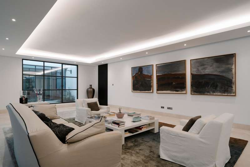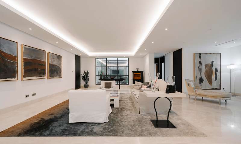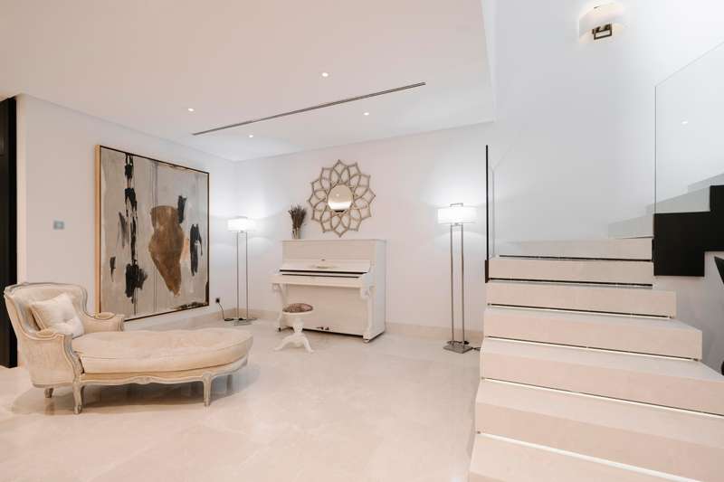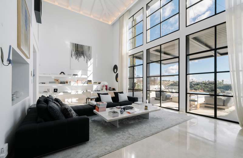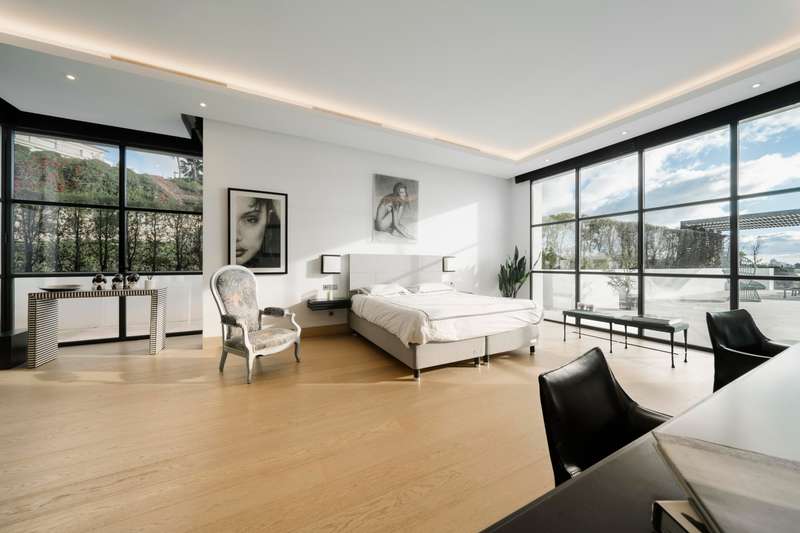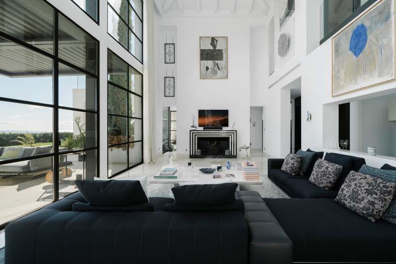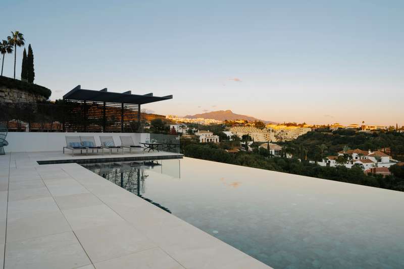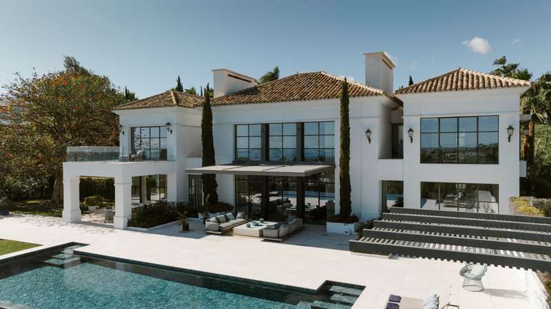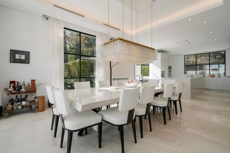 Perched in one of Benahavís’ most scenic and exclusive enclaves — Los Flamingos — this remarkable 3-level residence offers panoramic views of the Mediterranean, complete seclusion, and vast living spaces wrapped in natural beauty. A stately stone path welcomes you to the property, leading to a magnificent six-bedroom, seven-bathroom villa designed to harmonise with its lush surroundings while offering total privacy. On the main floor, a light-filled living area with soaring double-height ceilings and a central fireplace frames sweeping views through oversized windows. The warmth of wood-beamed ceilings contrasts beautifully with polished marble floors, creating a sense of timeless sophistication. This grand space flows onto an expansive terrace overlooking the manicured park, an infinity pool that appears to spill into the sea, and a serene barbecue area beneath a vibrant coral tree — perfect for alfresco entertaining. The generous kitchen is both refined and functional, featuring a