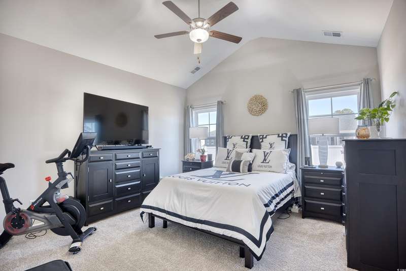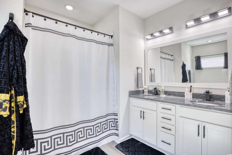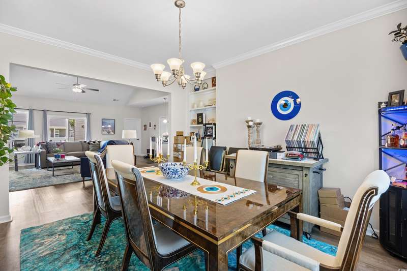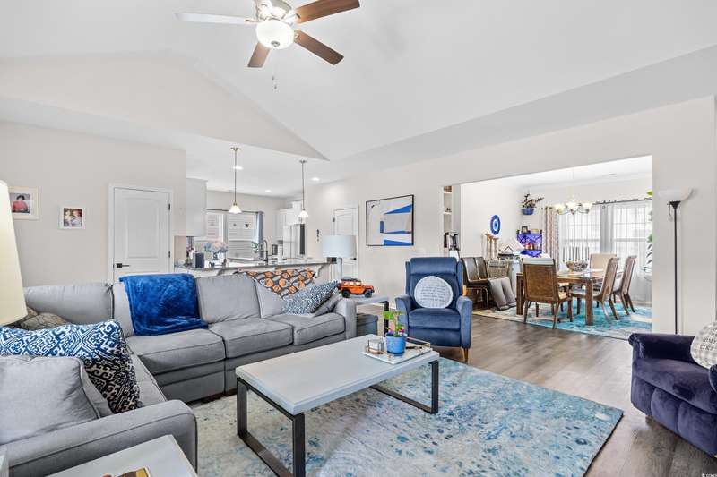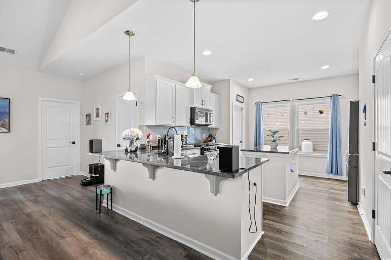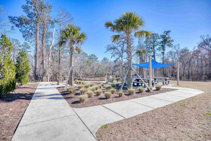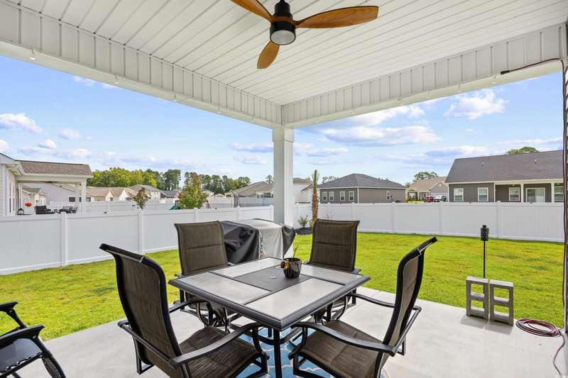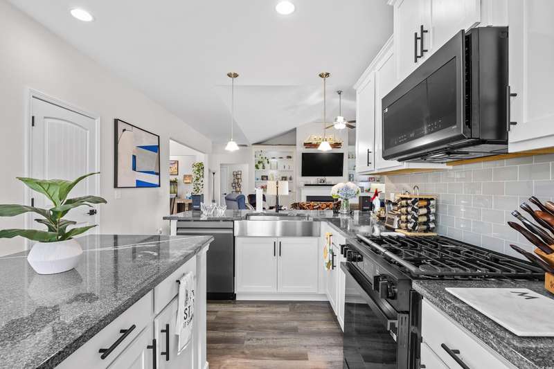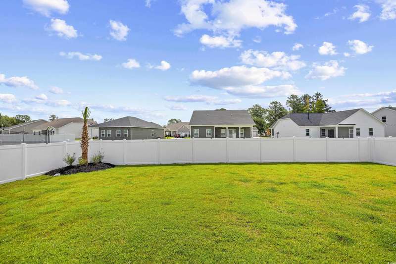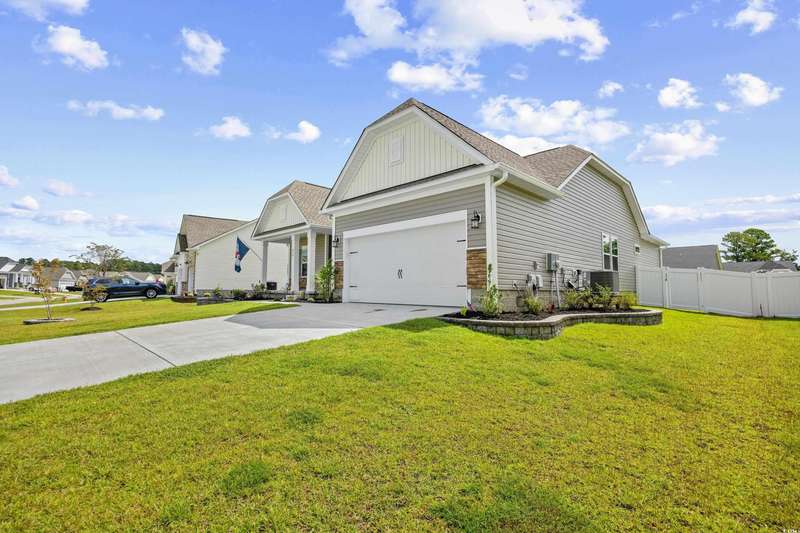 This popular Wisteria E ranch home is beautifully appointed with high quality upgrades! Vaulted ceiliings in the greatroom and Owner's suite make the well designed plan even more open and airy. Upgrades include a propane fireplace in the greatroom with a TV bracket in place above the fireplace-site built cabinets/bookshelves flank the fireplace and in the dining room and are all lighted; black accent upgraded hardware on cabinets, the kitchen is a cook's dream with a gas range; upgraded dishwasher; upgraded microwave; upgraded kitchen faucet and farm sink; tile backsplash, 3 cm granite countertops; large walk in pantry; kitchen island with storage; soft close doors and drawers, Luxury vinyl flooring everywhere except bedrooms; bathrooms have comfort height toliets and upgraded lighting; upgraded shower heads and faucets and a tiled shower with a tiled mudbed in the owner's bath. This home also has a nice covered patio on the back with raised cable and electrical outlets in place for a TV; a remote controlled ceiling fan; fully fenced back yard and irrigation system! Home also has a 220 outlet located in the garage, and gutters on the exterior. Beautifully landscaped yard featuring a raised retaining wall for raised flower bed with irrigation throughout the flowerbeds. This home is built on an elevated slab foundation, offering peace of mind, with no concerns about flooding or water intrusion. The raised design not only enhances durability but also provides a solid feel throughtout the home. Grissett Landing is located just 4 miles outside of downtown Conway located on the beautiful Waccamaw River. The community feautures a floating dock, a fire pit and green area for residents. Grissett is convenient to shopping, dining and approximately 25 to 30 minutes to the beach.