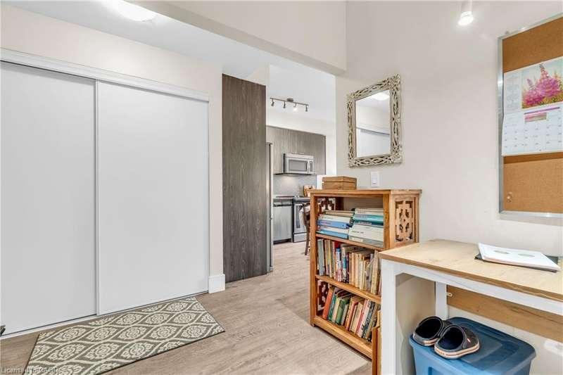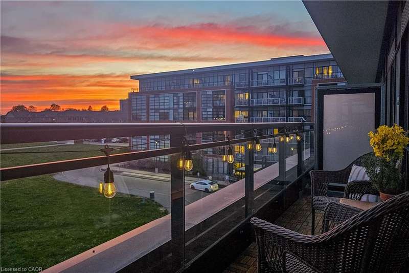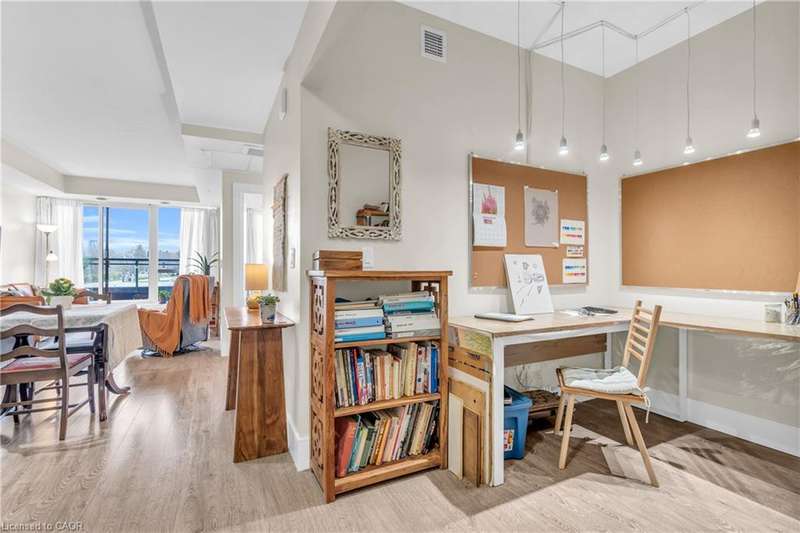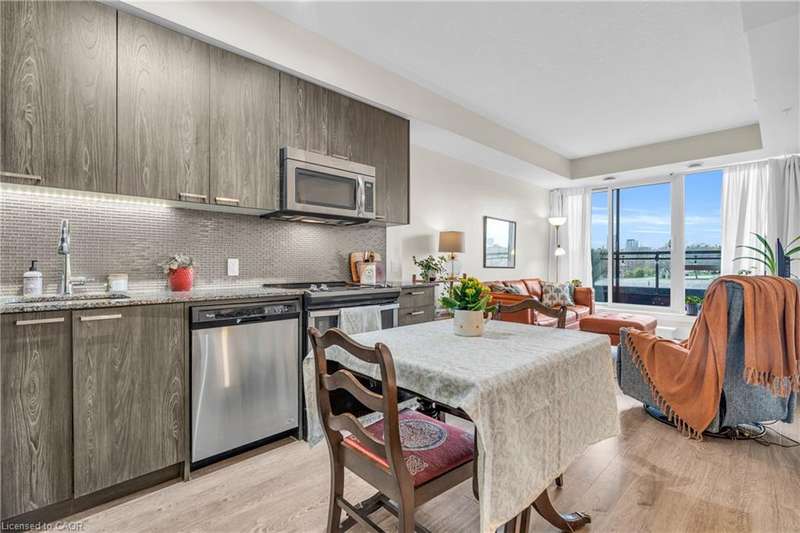 Welcome to Victoria Common, a unique and luxurious midrise development just minutes from downtown! This bright and cheerful 1 bedroom plus den condo is the perfect blend of modern style, comfort, and convenience. Embrace the the bright and inviting atmosphere of this freshly painted unit, featuring vinyl floors, granite countertops, modern wood design cabinetry, and sleek glass backsplash creating a sophisticated and contemporary feel. The expansive 4th-floor balcony offers breathtaking southwesterly views of Kitchener's downtown skyline and spectacular sunsets. Imagine sipping your morning coffee or enjoying a glass of wine in the evening, surrounded by the energy of the city. Building features include: - State-of-the-art geothermal forced air heating and cooling system - Well equipped main floor gym/exercise room with floor-to-ceiling windows. - Large and luxurious party room perfect for special occasions or community hangouts. - 1 Underground parking space and ample visitor parking for guests. -1 Storage locker included and secure bike storage in the parking garage. The best of downtown Kitchener's amenities and natural beauty, just steps away: - Short walk to parks and trails. - Just a stone's throw to downtown restaurants, shops and cafe's. - Easy access to public transportation and bike trails. And, as a pet-friendly building, you can bring your furry friends along!