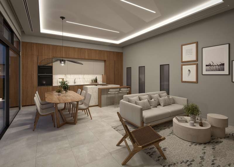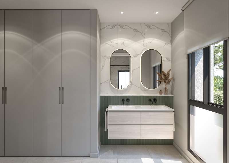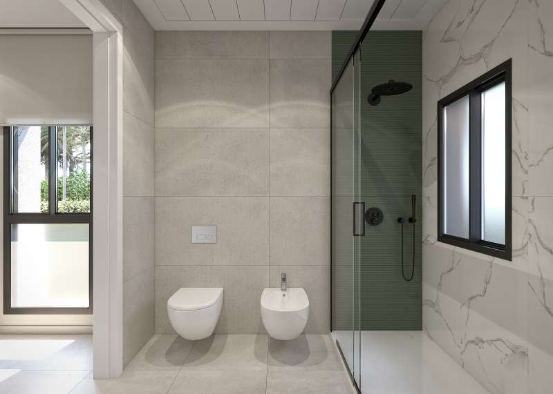 The villa features a spacious open-plan living room with a double-height ceiling, creating an airy and bright ambiance. The modern kitchen is seamlessly integrated into the living space. The master bedroom includes an en-suite bathroom, while the two additional bedrooms share a stylishly designed bathroom. A guest toilet is conveniently located for easy access. The 64 m² solarium provides an ideal outdoor space, complete with a summer kitchen. The 136 m² basement offers versatility for additional living space, featuring pre-installed air conditioning and ample natural light.