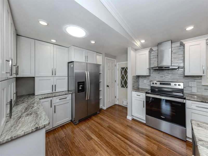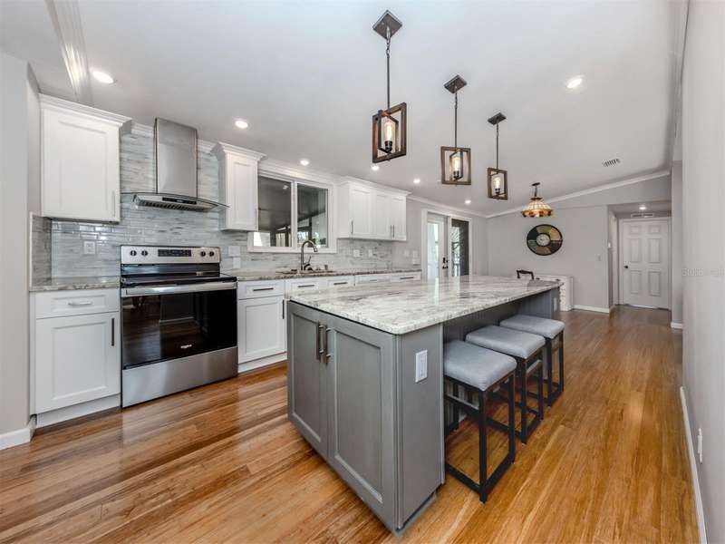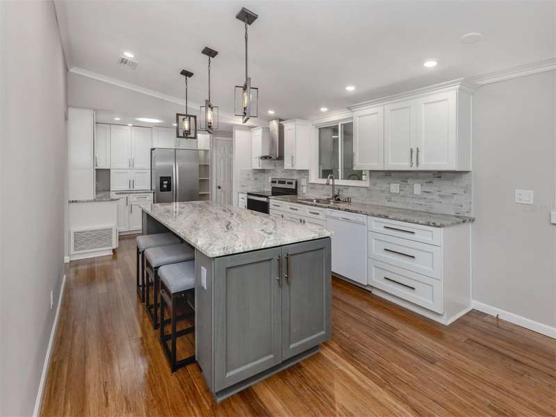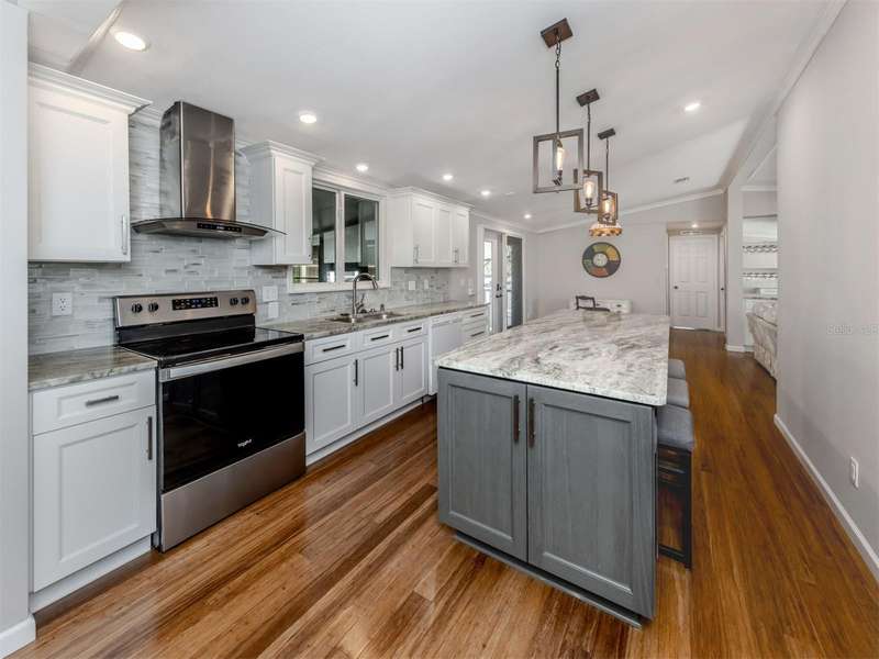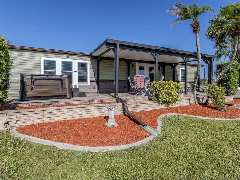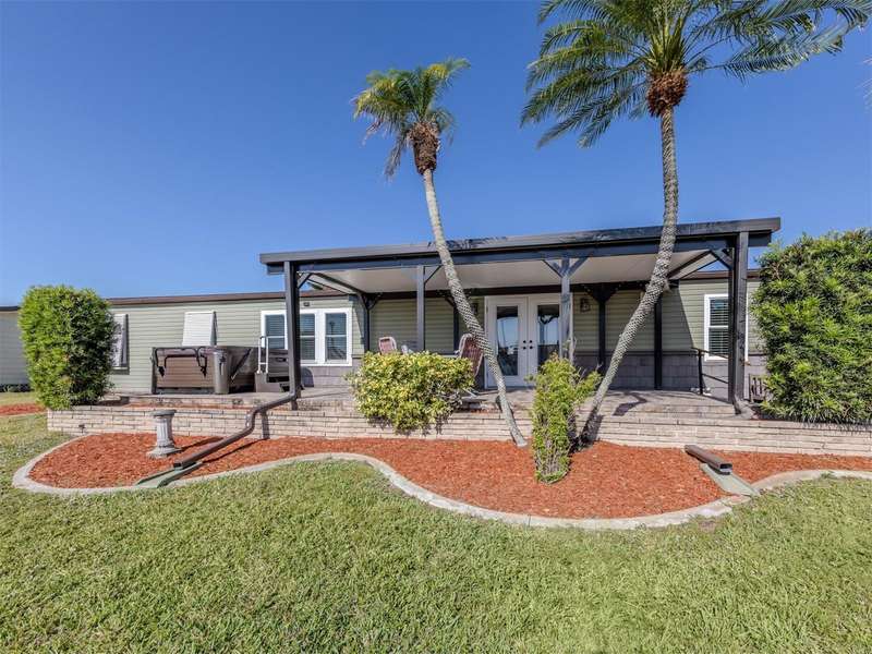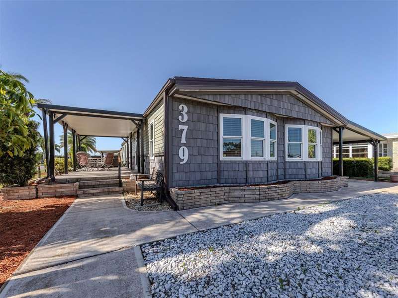 Welcome to this stunning 3-bedroom, 2-bath manufactured home offering 1,550 square feet of beautifully renovated living space in the highly desired, land-owned, pet-friendly community of Harbor Isles. Perfectly located directly across from the clubhouse and all of the community's fantastic amenities, this home delivers the ideal combination of luxury, comfort, and convenience. Every detail has been thoughtfully updated from top to bottom. The heart of the home is an impressive chef's kitchen featuring an oversized granite island with stylish designer lighting, brand-new stainless steel appliances, and an abundance of solid wood shaker cabinetry with gorgeous granite countertops. A matching dry bar in the living room and built-in buffet in the dining area create a cohesive look while adding even more storage and function. Engineered bamboo hardwood floors run throughout the home, enhancing the warmth and flow of the space. Vaulted ceilings with crown moldings add a touch of elegance and openness. The primary bathroom is a relaxing retreat, showcasing porcelain tile floors and a tiled shower, a double-sink vanity with marble countertop, a walk-in whirlpool tub, and a stacked washer and dryer for convenience. Exterior upgrades are just as impressive, including new siding with plywood sheathing and a moisture barrier, architectural shingle accents, a Cat 5 rated carport, new gutters and fascia, double-hung windows throughout, three new skylights, and extra tiedowns for added peace of mind. The roof was redone in 2023, the A/C system was replaced complete with all new ductwork in 2019, the water heater in 2021, and a whole-house surge protector was added in 2023. This home is truly move-in ready and waiting for its new owner.