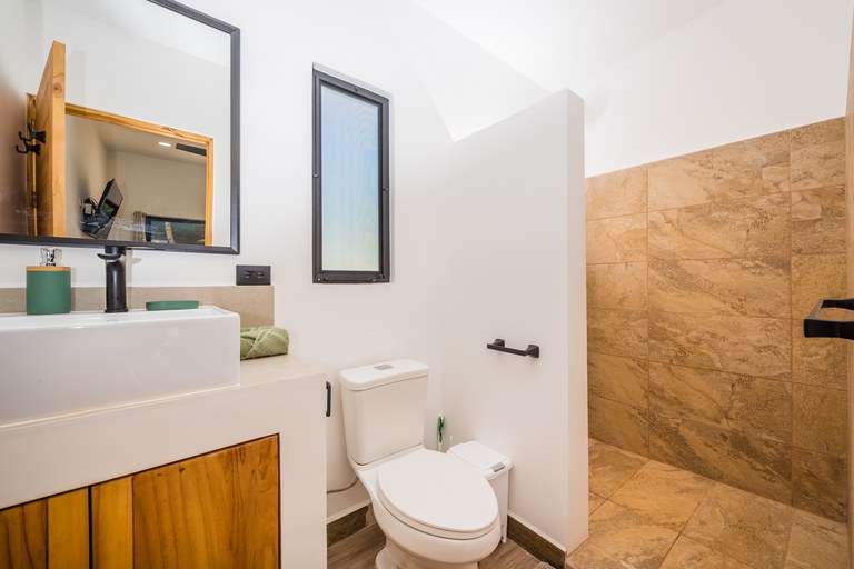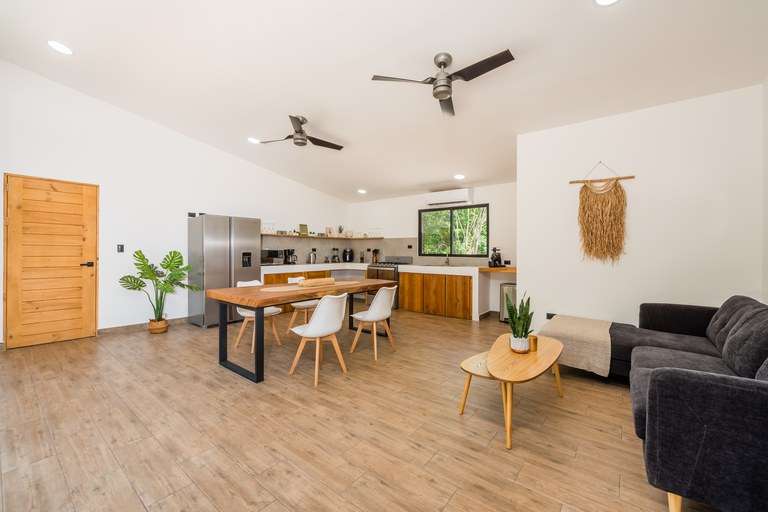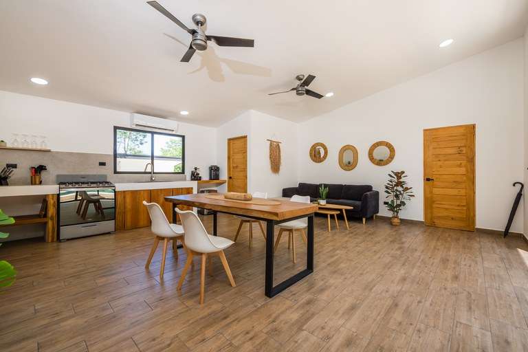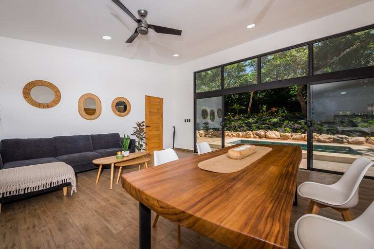 At the heart of the estate is a beautifully designed 112 m2 furnished villa featuring two bedrooms, two bathrooms, a spacious living room, and a fully equipped kitchen. The home is sold turnkey, including modern Whirlpool appliances, linens, utensils, and high-speed Starlink internet, allowing for immediate occupancy. Large terraces and an inviting 14 m2 pool extend the living space outdoors, blending comfort with Costa Rica's tropical lifestyle.