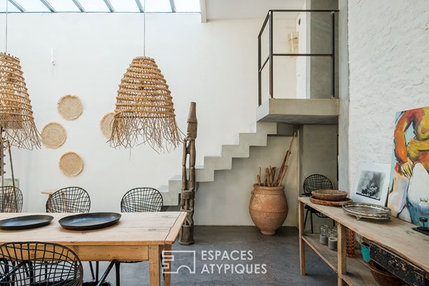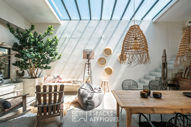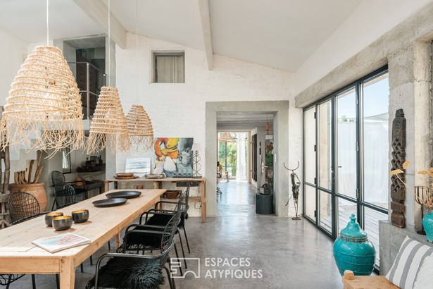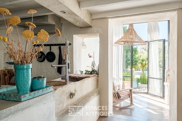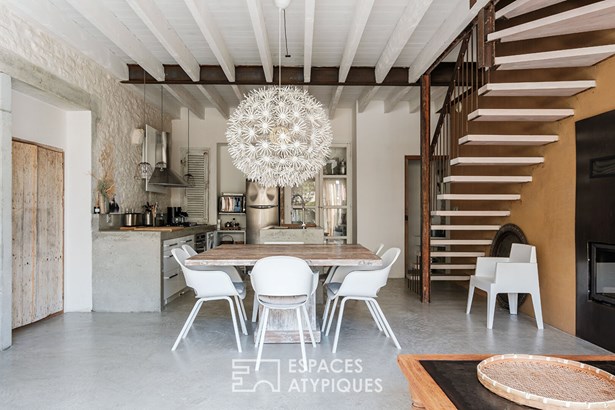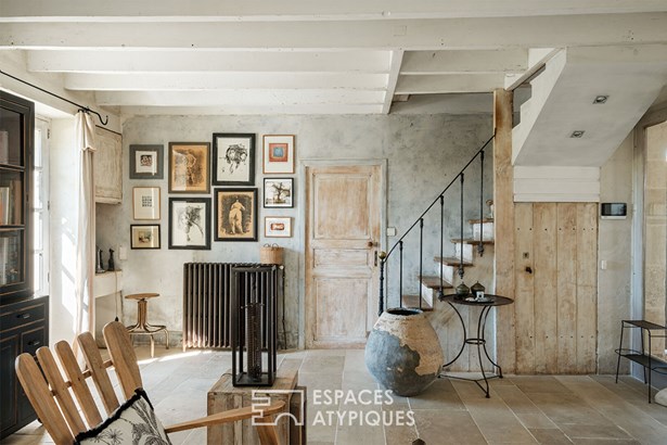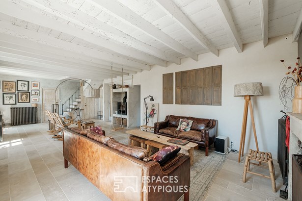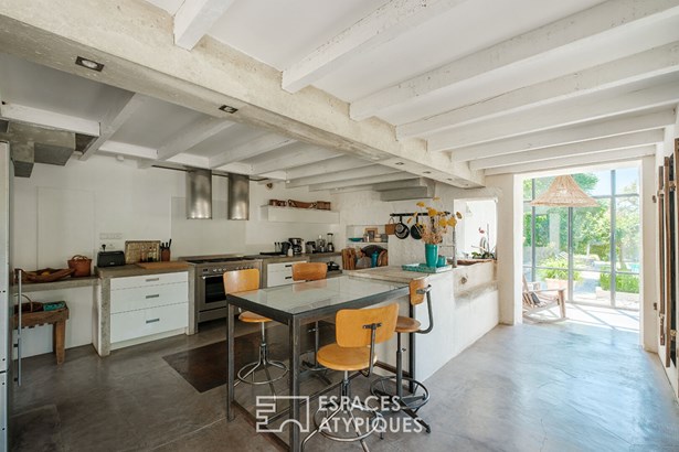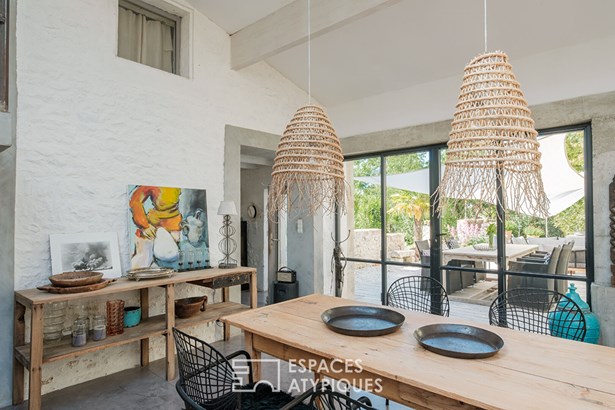The entrance opens onto a vast dining room bathed in light, extended by a spectacular glass roof that connects the house to the old bread oven. Under this glass roof, a bench invites you to read or contemplate the surrounding nature. The kitchen, designed for gourmets, is distinguished by its strong industrial lines: polished concrete, raw masonry walls, workshop-style glass roof, stainless steel range, and double professional hoods. The living room combines softness and elegance with its light gray limed stone walls, custom-made patinated interior shutters, and aged leather furniture. An office and a bathroom complete the garden level.
