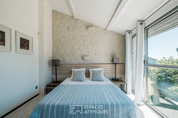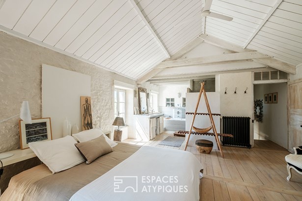 Upstairs, under a magnificent pearl gray roof frame, the master suite opens onto a refined bathroom where white is presented in delicate shades. A second bedroom, soothing and refined, completes this sleeping area.