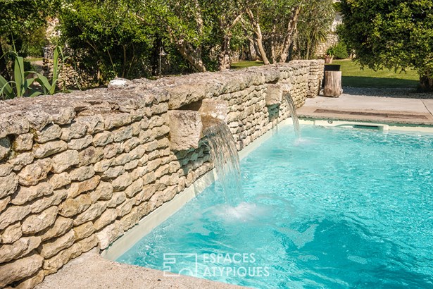The landscaped garden, structured by dry stone walls, reveals a succession of atmospheres: generous orchard, open meadow, shaded corners for reading or relaxing, outdoor showers and a natural swimming pool fed by old stone troughs, where fresh water circulates peacefully.