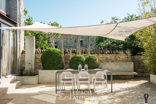 The exteriors were designed as a natural extension of the living spaces. At the front, an intimate terrace sheltered by an imposing patinated wooden frame unfolds a Mediterranean ambiance, with its terracotta pots, unusual pendant lights, masonry bench, and swing seat ideal for relaxation. At the rear, a wooden terrace bathed in light extends the living areas towards the garden. Bordered by light stone walls and shaded by large stretched canvases, it offers an ideal setting for outdoor meals or moments of sharing.