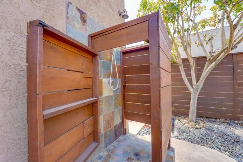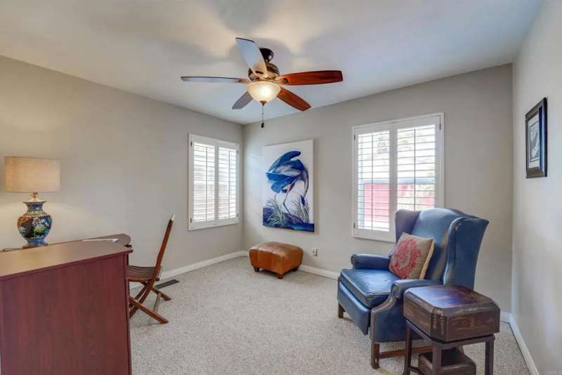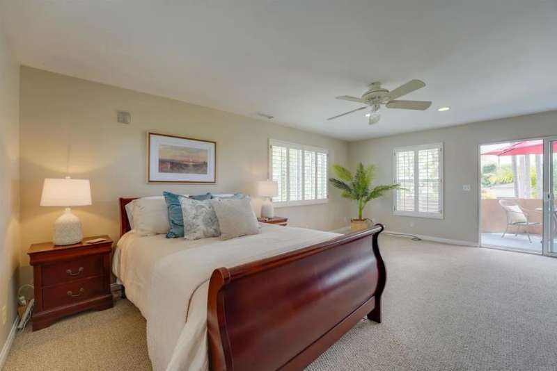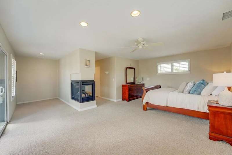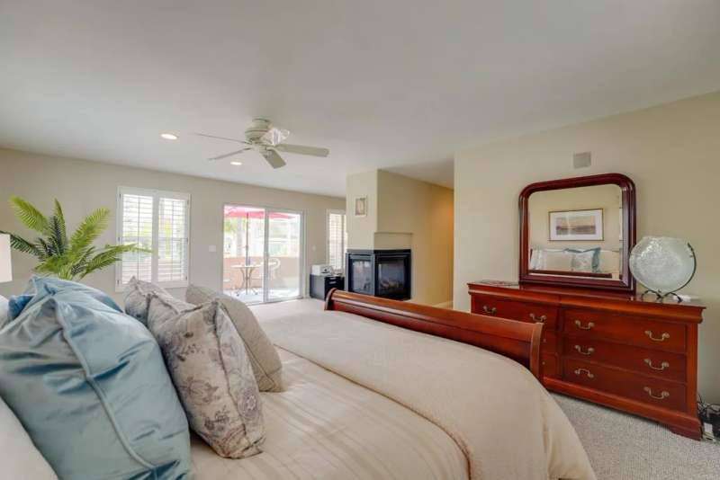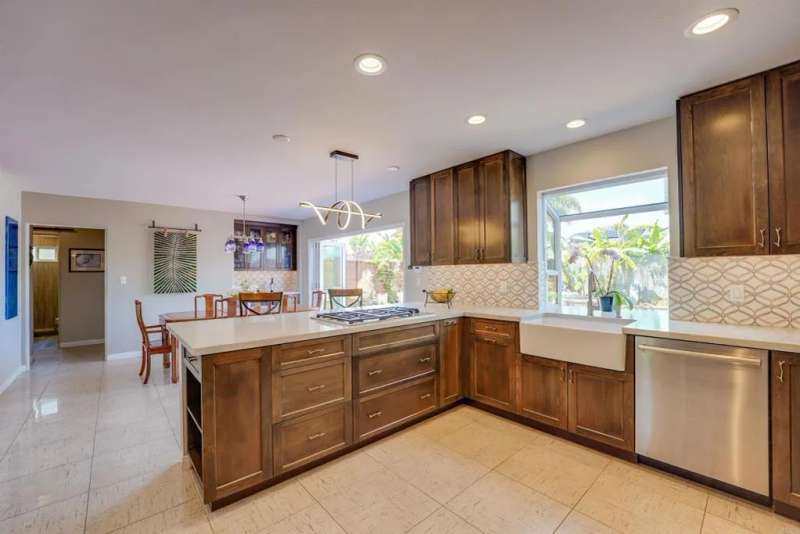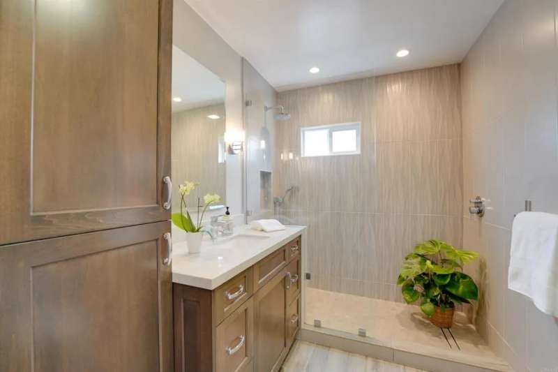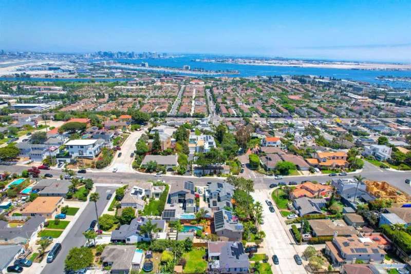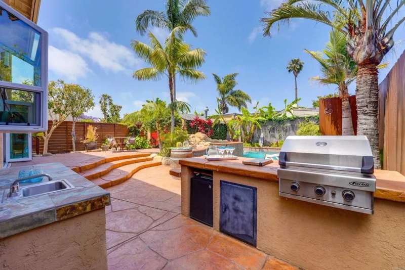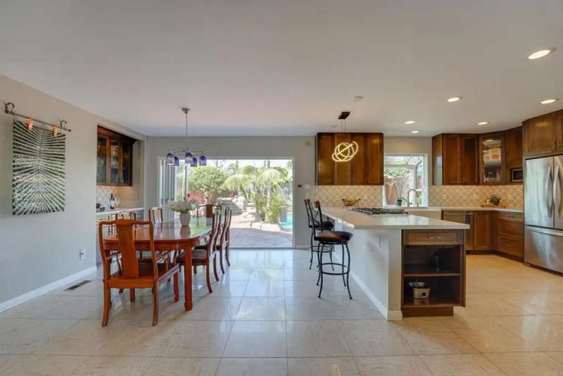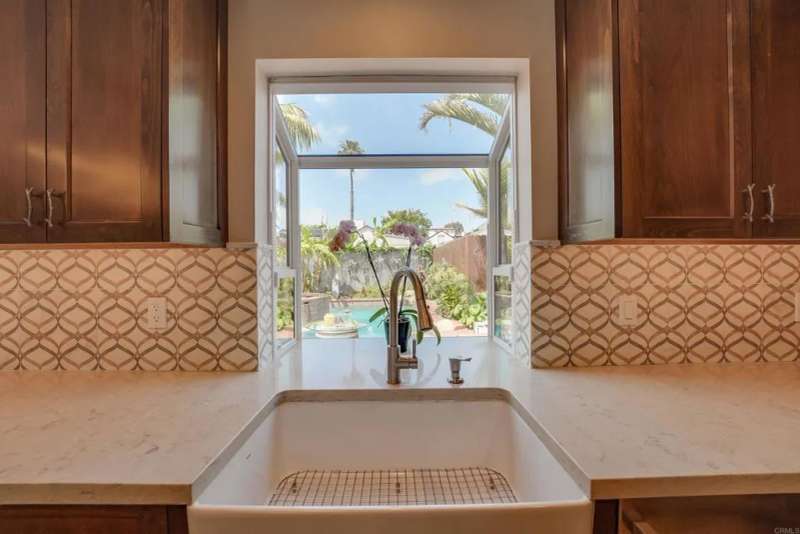 One of Point Lomas most sought-after neighborhoods, this thoughtfully remodeled Loma Portal residence blends timeless coastal style with elevated indoor-outdoor living. A versatile layout includes four bedrooms and three full bathrooms, with two bedrooms and a full bath conveniently located on the main levelperfect for guests, multigenerational living, or a dedicated home office. The heart of the home is an open, light-filled floor plan featuring rich wood flooring, large windows, and a beautifully renovated chefs kitchen. Custom wood cabinetry, quartz countertops, a gas cooktop, and full-size double electric ovens create a gourmet experience, while a wine bar with wine refrigerator and designer lighting adds a refined touch to the adjacent dining area. The living space flows effortlessly to the backyard through expansive La Cantina folding glass doors, creating a seamless connection between indoors and out. The resort-style backyard is designed for both relaxation and entertainment, inspired by South Pacific ambiance. A sparkling pool with slide and fountains, spa, outdoor kitchen with built-in BBQ, gas burner, sink, and shower make it a true retreat. Lush tropical landscaping, swaying palms, raised garden beds, and a hand-placed stone zen garden complete the tranquil oasis. Upstairs, the serene primary suite offers a luxurious escape, complete with a striking three-sided fireplace, retreat area, and access to a private balcony shared with the third upstairs bedroomperfect for enjoying morning coffee, ocean breezes, and evening sunsets. The spa-inspired ensuite bath includ