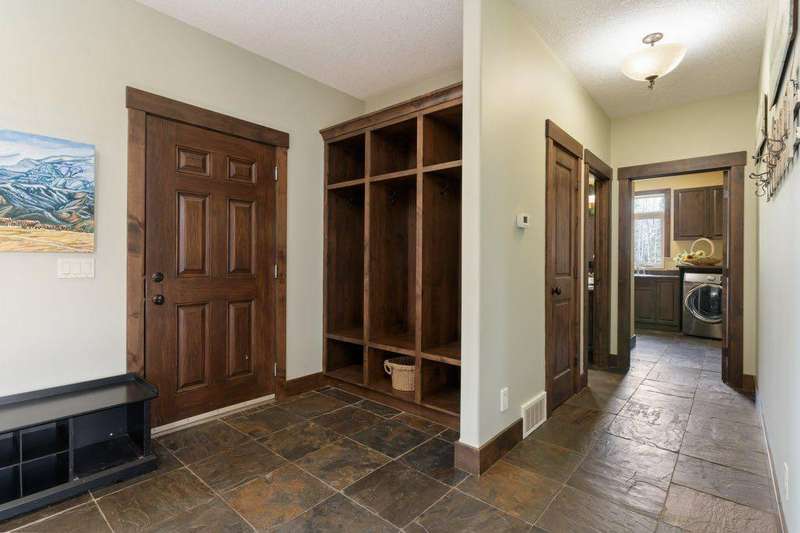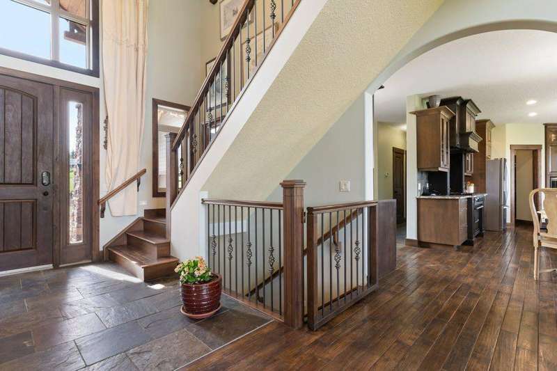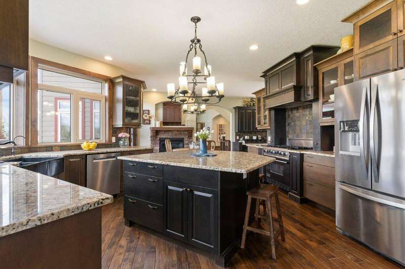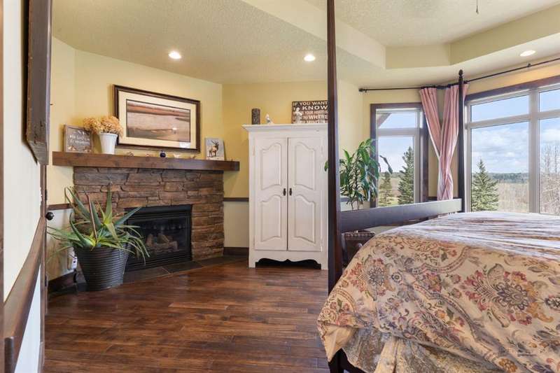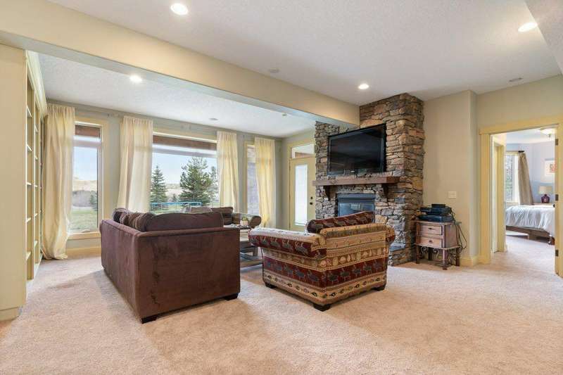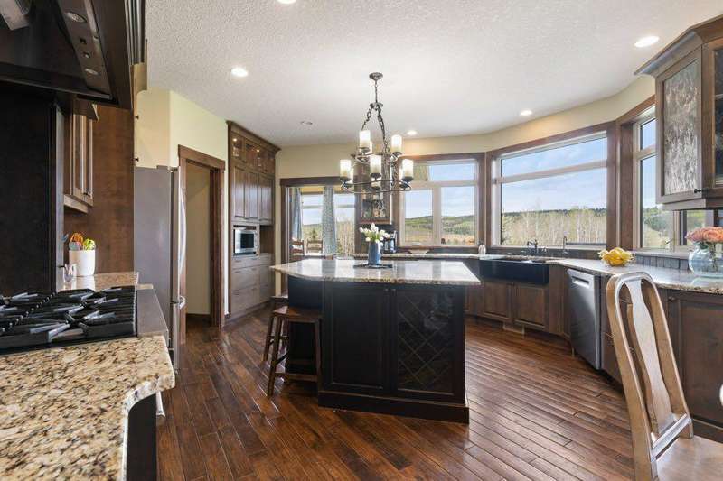 Nestled in the prestigious Priddis Creek Estates, this exceptional timber frame-style, walk-out bungalow offers the perfect blend of rustic charm and modern luxury. As you approach the residence, you'll immediately note the striking architectural details and thoughtful design that harmonizes with the surrounding natural landscape. Step inside to discover soaring ceilings and hand-hewn hickory floors that create a warm, inviting atmosphere throughout the main level. The open concept living space is anchored by one of four magnificent fireplaces found throughout the home, providing both ambiance and comfort. Expansive windows and strategically placed skylights bathe the interior with natural light while framing picturesque views of the surrounding countryside. The gourmet kitchen flows into dining and entertainment areas, ideal for both intimate family gatherings and larger social events. Custom built-in bookcases and clever storage solutions maintain the home's elegant aesthetic while providing ample space for organization. A sophisticated office loft offers a quiet retreat for working from home, while the walkout lower level features high ceilings, creating bright, airy spaces that defy the typical basement feel. The lower level continues the home's commitment to luxury with additional fireplaces and seamless access to the gorgeous outdoor space. Modern conveniences include energy-efficient in-floor heating, a recently upgraded boiler (3 yrs), comprehensive water treatment system, and on-demand hot water for ultimate comfort and efficiency. The triple garage provides abundant space for vehicles and storage, with room for recreational equipment for all your mountain adventures. Priddis Creek Estates offers an exceptional community lifestyle with its inviting clubhouse, riding arena and network of walking/biking paths. Enjoy the serenity of country living while maintaining proximity to urban amenities. Golf enthusiasts will appreciate being minutes from the renowned Priddis Greens Golf and Country Club, while outdoor adventurers will treasure the quick access to the majestic Rocky Mountains. This distinctive property represents a rare opportunity to embrace the coveted foothills lifestyle in one of Alberta's most sought-after communities. Experience the perfect harmony of rustic elegance and contemporary comfort in this extraordinary timber frame home. Contact your favourite REALTOR® today for a private showing.