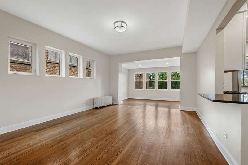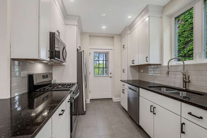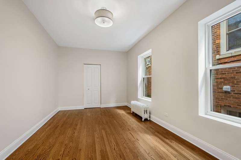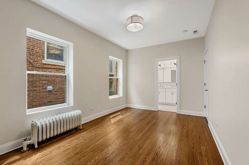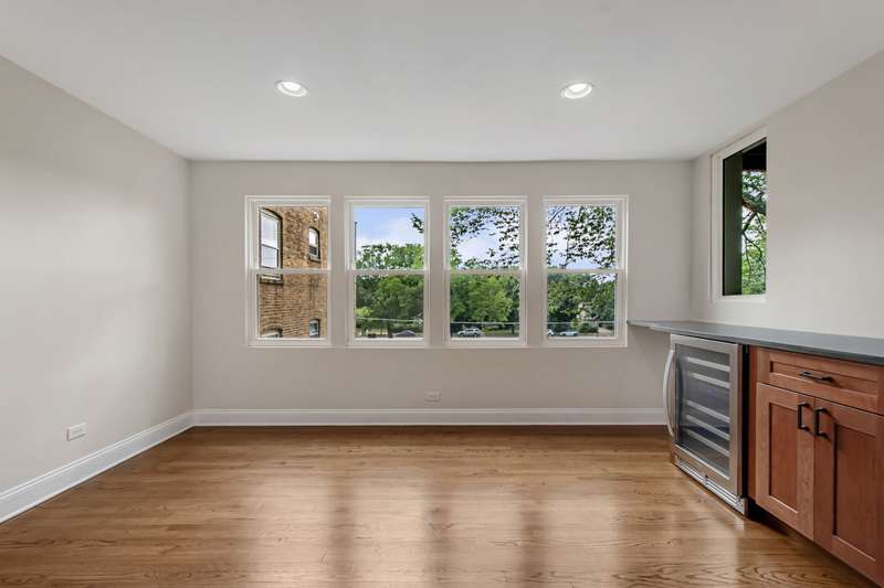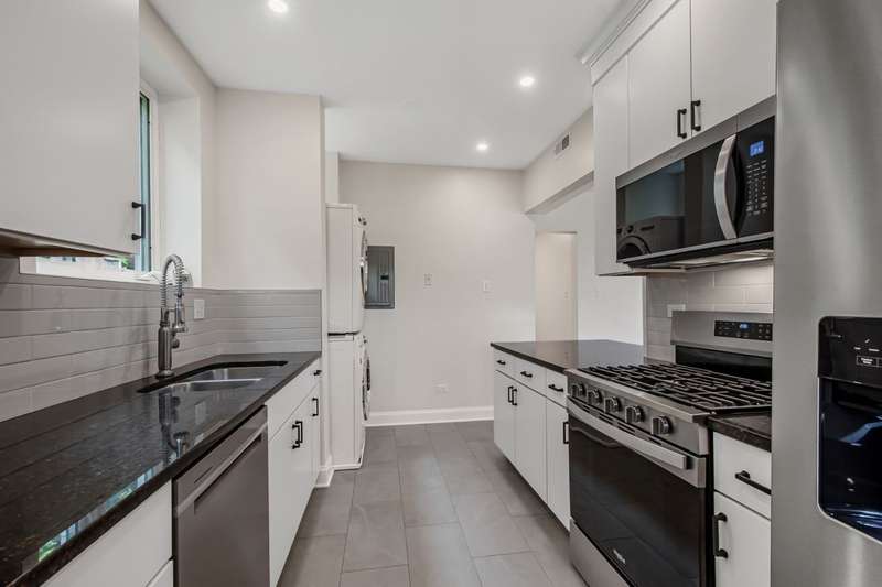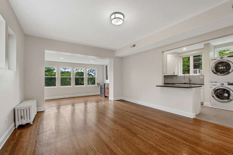 Just renovated and ready to occupy, large centrally cooled top floor flat in this quality, beautifully cared for and upgraded 4-unit building. Brand new kitchen with tall white cabinets, black granite countertops, glass tile back-splash, porcelain tile floor, all new stainless appliances, and microwave with exterior exhaust. Brand new bathrooms with white vanities, lovely mirrors and lighting, tile shower enclosures and handsome mosaic tile floors. HANDY full-sized washer & dryer in the unit! Features include tall ceilings, gleaming hardwood floors, beautiful moldings, newer windows and new window blinds, and the primary bedroom has a fitted walk-in closet and private bath. Spiffy hall bath serves two additional bedrooms with good closet space. Enjoy the front room living with north, east and south views of the tree-lined neighborhood, a great size with lovely light, and has been used as a spacious home office, plus find a wonderful large family room opening to the kitchen and the rear sunroom with new granite bar and beverage fridge which serves nicely as a dining room if needed...glorious west view of the park and sunsets too! Heat and water included in the rent. Dog ok with addnl pet rent $30/month. Damage/security deposit required and credit/background check required. Self-managed building in outstanding SE location convenient to the beach, parks, loop trains, shopping and restaurants. Flexible space in this quiet building of friendly neighbors. Parking is good on Michigan but really good on Keeney just north or Forest Ave due west across the park.
