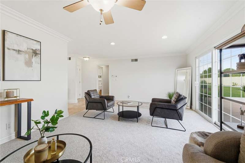 This 3-bedroom, 2-bathroom detached residence combines comfort, functionality, and opportunity. The spacious front living room welcomes you with abundant natural light and fresh new interior paint throughout. Brand-new carpet in select areas adds a warm touch, while dual-pane windows with retractable screens located in two of the rooms so there is no obstructed view. Once windows are opened screens are in place. Track-mounted shades enhance comfort and energy efficiency.