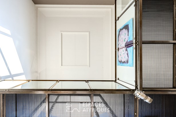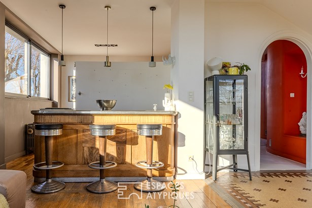 In its extension, the vast triple living room, marked by its double height and its numerous openings, offers both volume and luminosity. The period features have been preserved to blend with the modernity of a tasteful renovation. The porcelain stoneware mosaic floor contrasts with the industrial metal railings of the staircase.