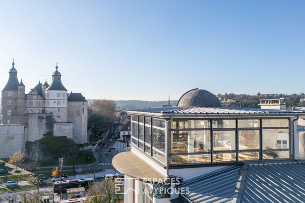 Access to the sleeping area is via an industrial-style staircase leading to a metal walkway. Here, two bedrooms each benefit from a beautiful exposure and share a bathroom. A master bedroom includes a double-aspect bedroom, a shower room and a dressing room. An office completes this floor.