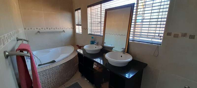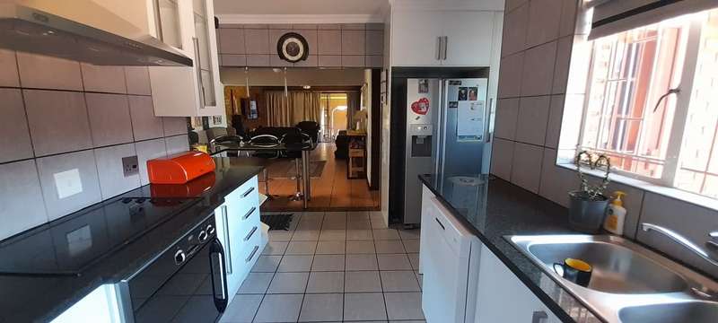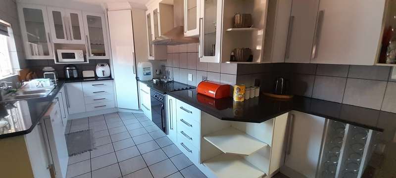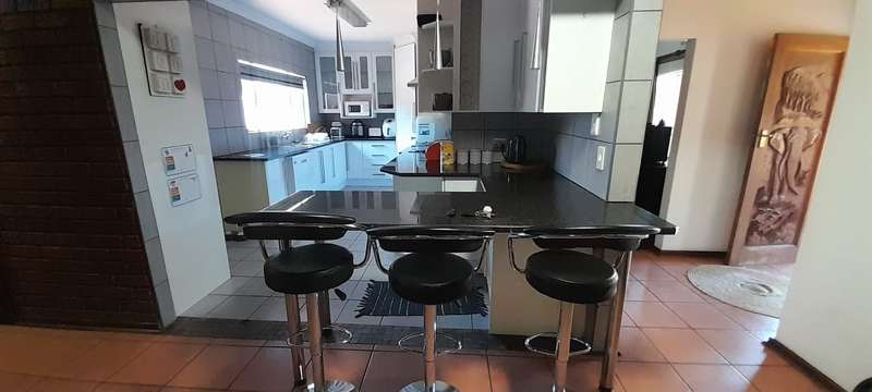 "Welcome to your dream home! This stunning 4-bedroom oasis boasts an open-plan kitchen seamlessly flowing into the lounge and living areas, perfect for entertaining guests. Step outside to your own private paradise featuring a huge swimming pool alongside a modern braai/entertainment area, creating the ultimate outdoor haven. Safety is paramount with extra security measures including CCTV cameras and x8 security beams, providing peace of mind. Embrace eco-friendly living with solar panels and an inverter system, complemented by heated panels for the pool. Park with ease in the double garage with electric doors, and enjoy the convenience of a 2500L Jojo tank. Nestled in a secure area, the property offers a beautifully maintained yard, completing this picture-perfect package of comfort, luxury, and security."