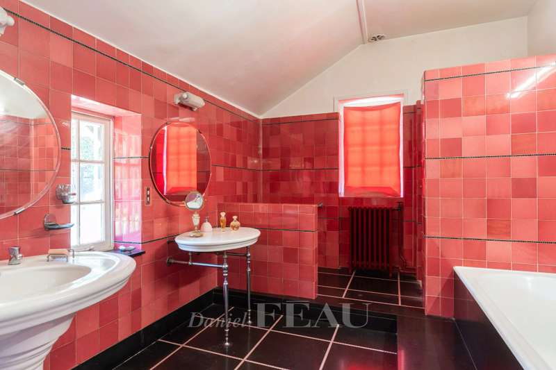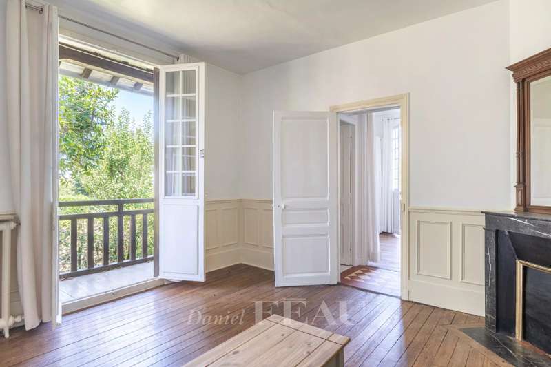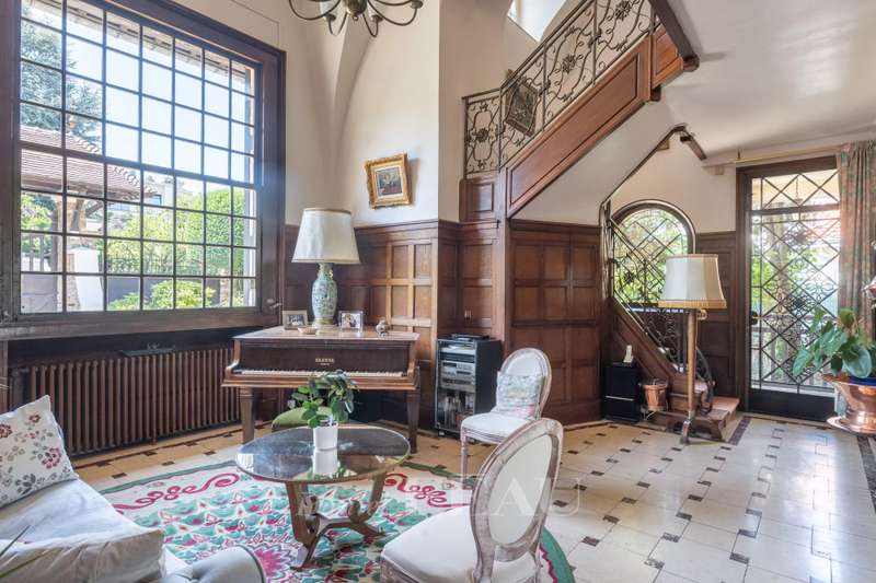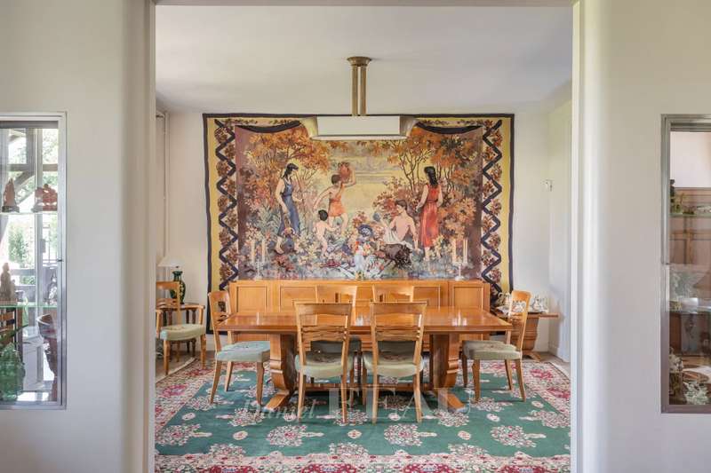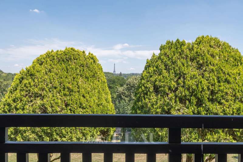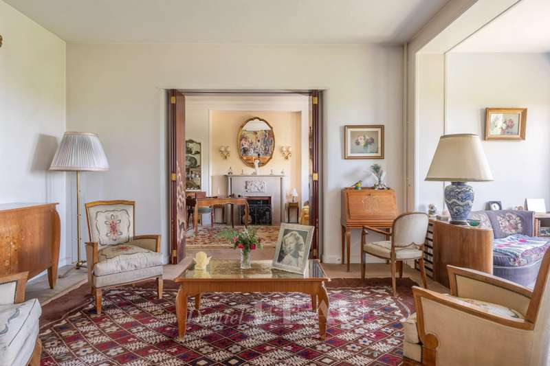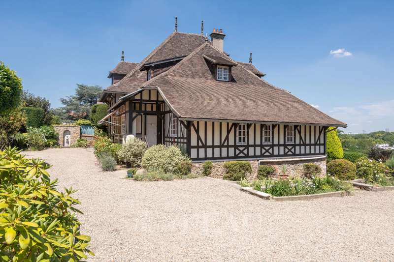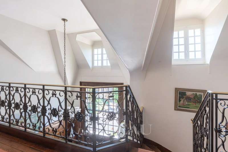 Val d’Or neighbourhood. This early 20th century Anglo-Norman style property is in one of Saint-Cloud’s most sought-after streets a stone’s throw from the station. Entirely decorated by renowned interior decorator Jules Leleu, it includes a spacious entrance hall, a triple living/reception room bathed in sunshine and overlooking the landscaped garden benefiting from an open view of the Bois de Boulogne and the Eiffel Tower, a spacious kitchen, a study, and a bedroom with a bathroom. Upstairs are three further bedrooms (two opening onto a balcony), and two bathrooms. On a basement with a self-contained 31 sqm studio apartment. With a near 100 sqm annex comprising a 3-room apartment, a 35 sqm recreation room and a double garage.