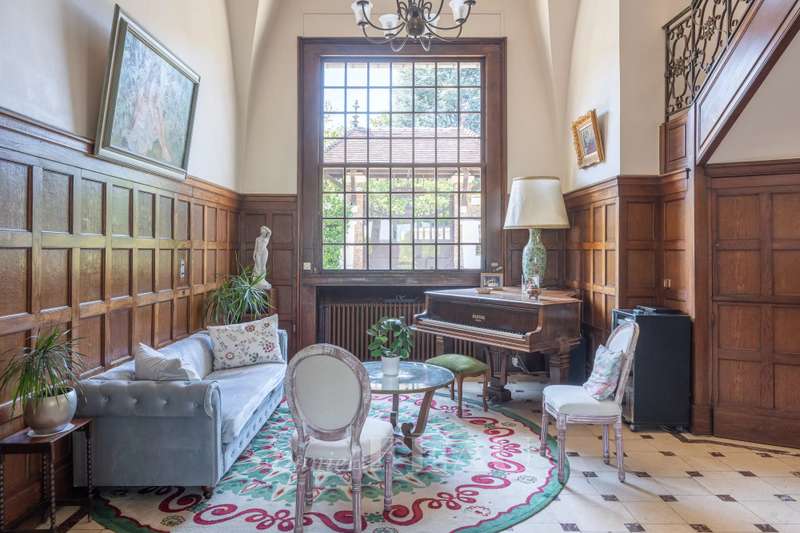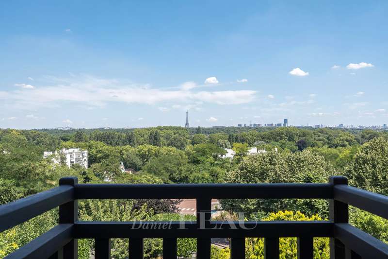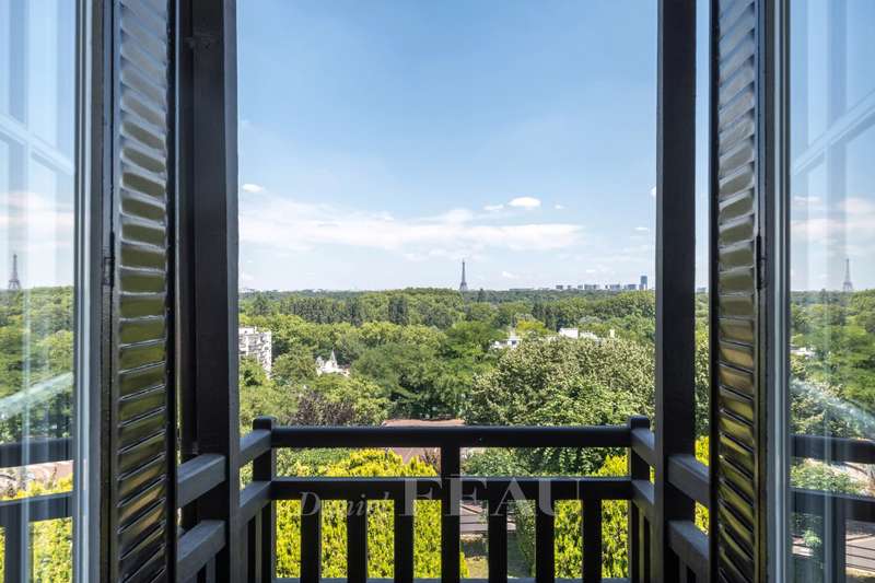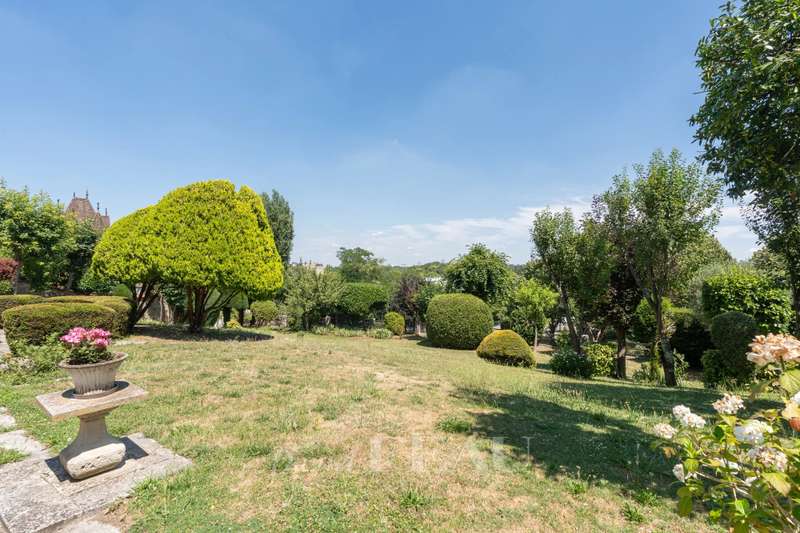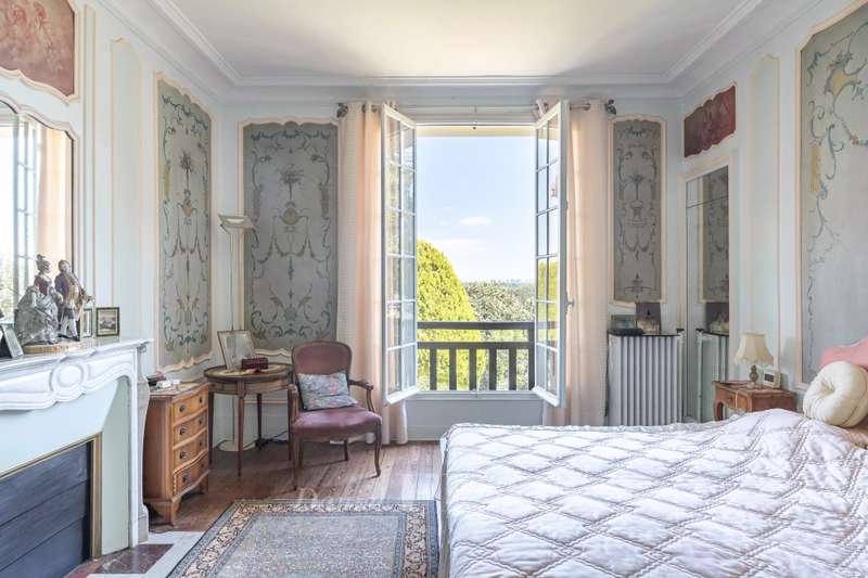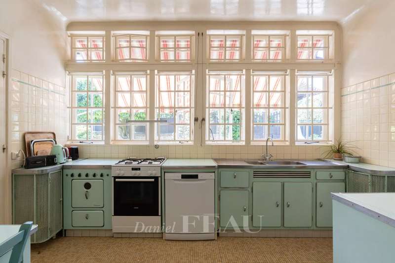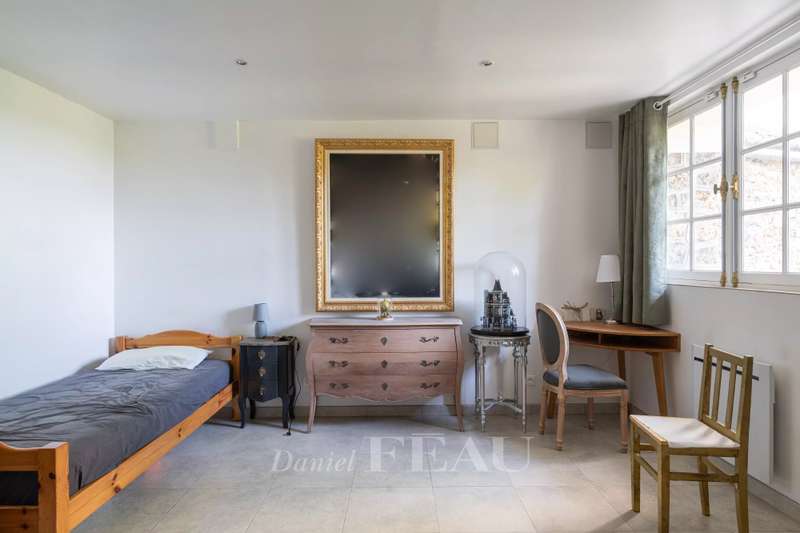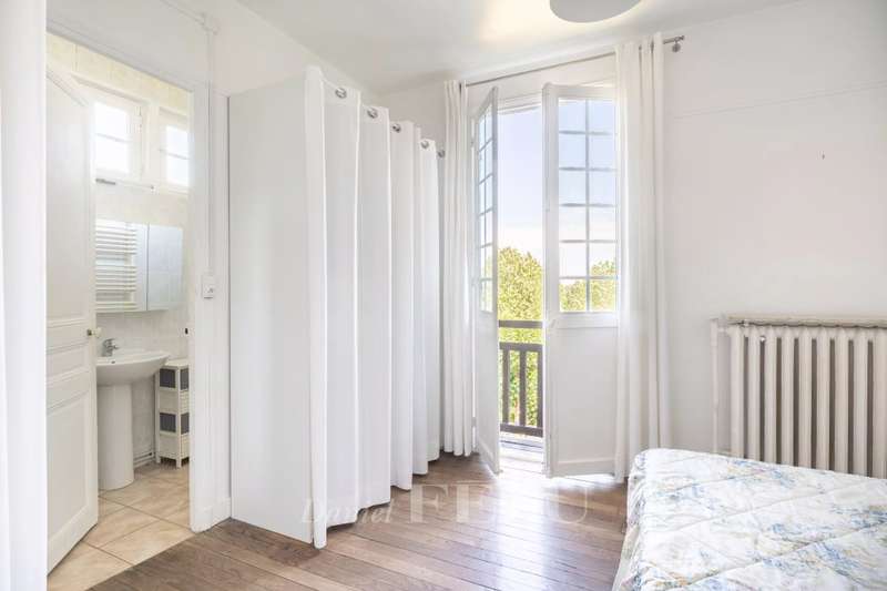 Val d’Or neighbourhood. This early 20th century Anglo-Norman style property is in one of Saint-Cloud’s most sought-after streets a stone’s throw from the station. Entirely decorated by renowned interior decorator Jules Leleu, it includes a spacious entrance hall, a triple living/reception room bathed in sunshine and overlooking the landscaped garden benefiting from an open view of the Bois de Boulogne and the Eiffel Tower, a spacious kitchen, a study, and a bedroom with a bathroom. Upstairs are three further bedrooms (two opening onto a balcony), and two bathrooms. On a basement with a self-contained 31 sqm studio apartment. With a near 100 sqm annex comprising a 3-room apartment, a 35 sqm recreation room and a double garage.